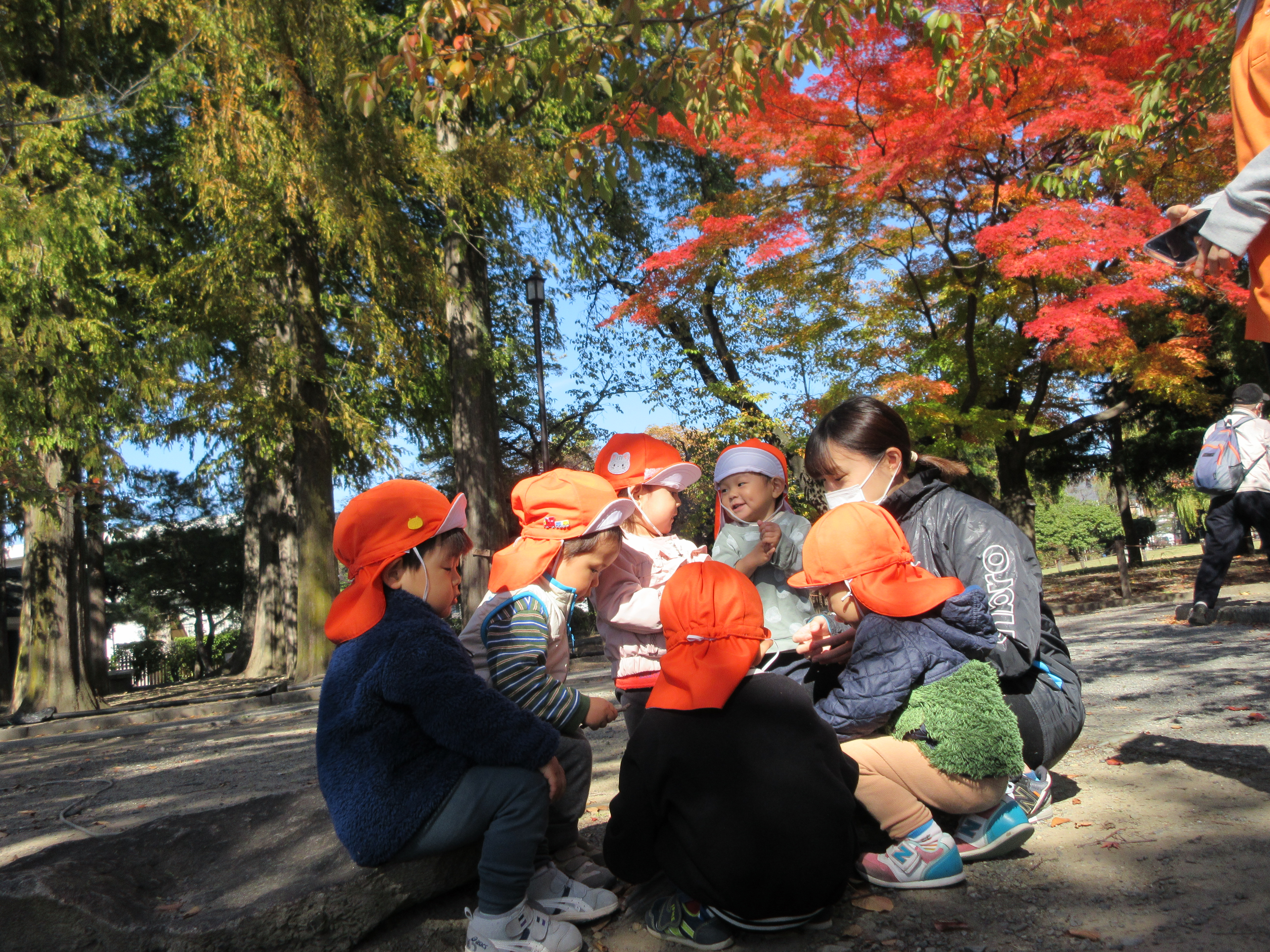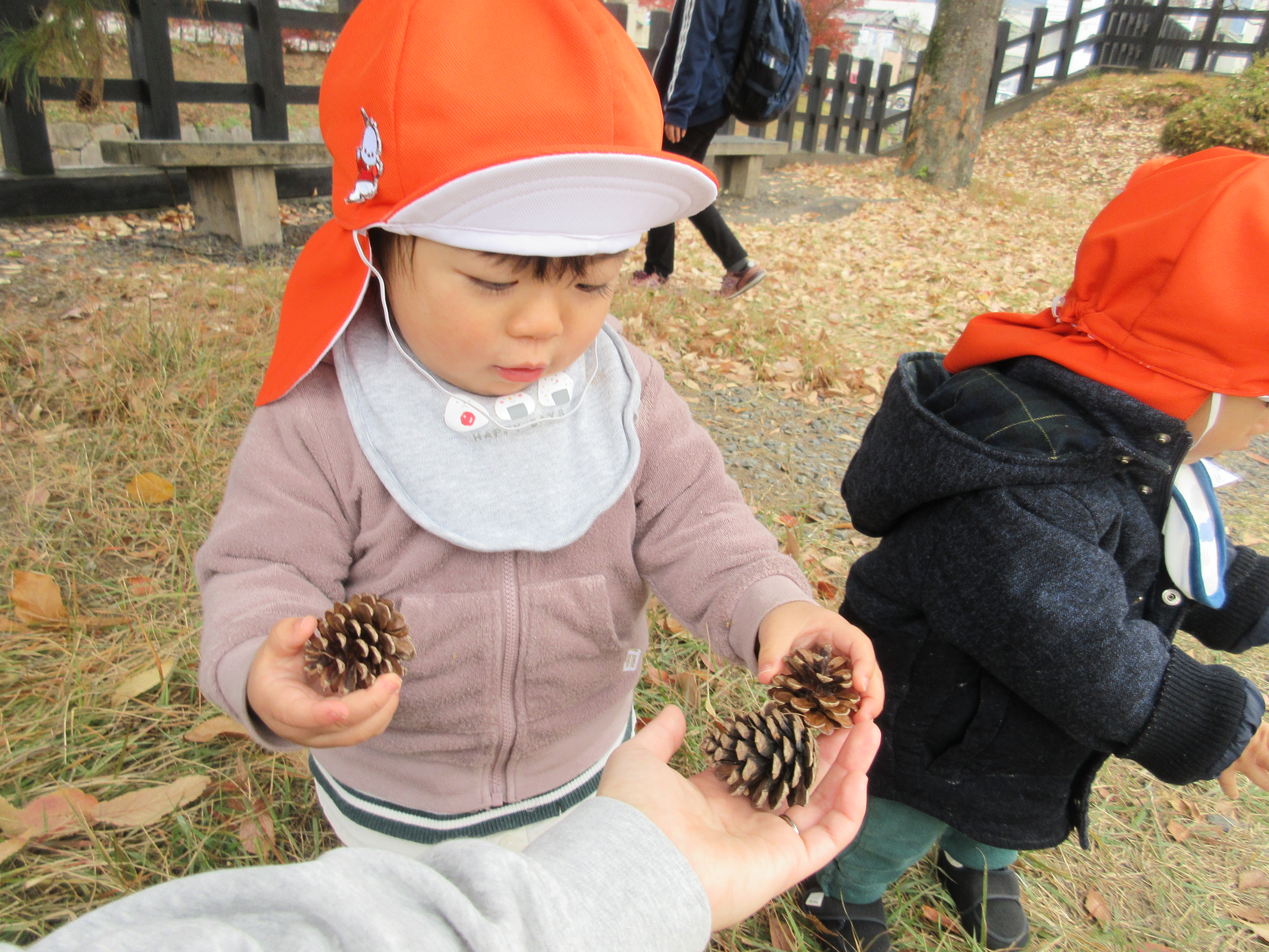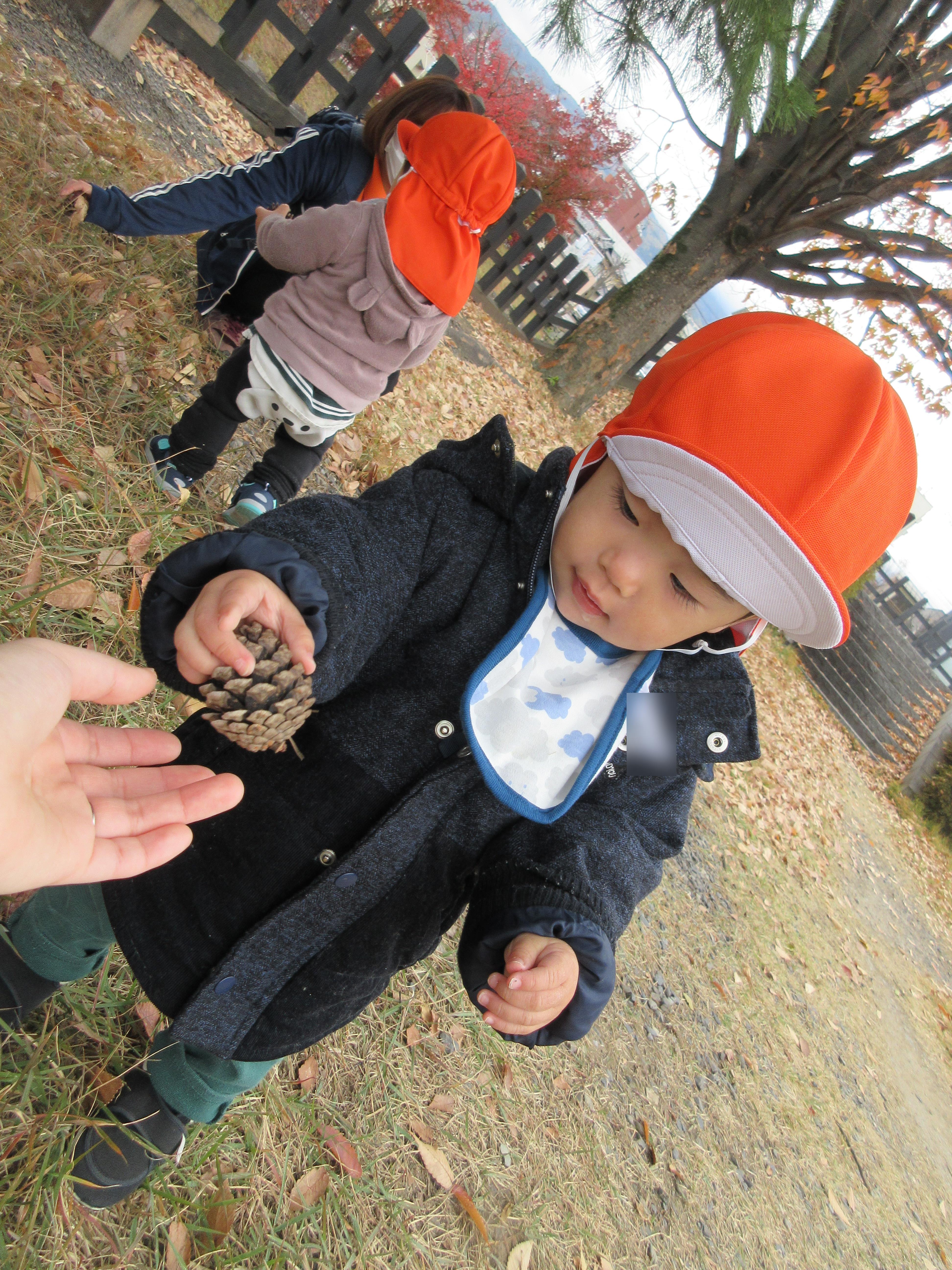 見つけたまつぼっくりを先生のところまで持ってきて見せてくれる姿がまたかわいいですよね![]()