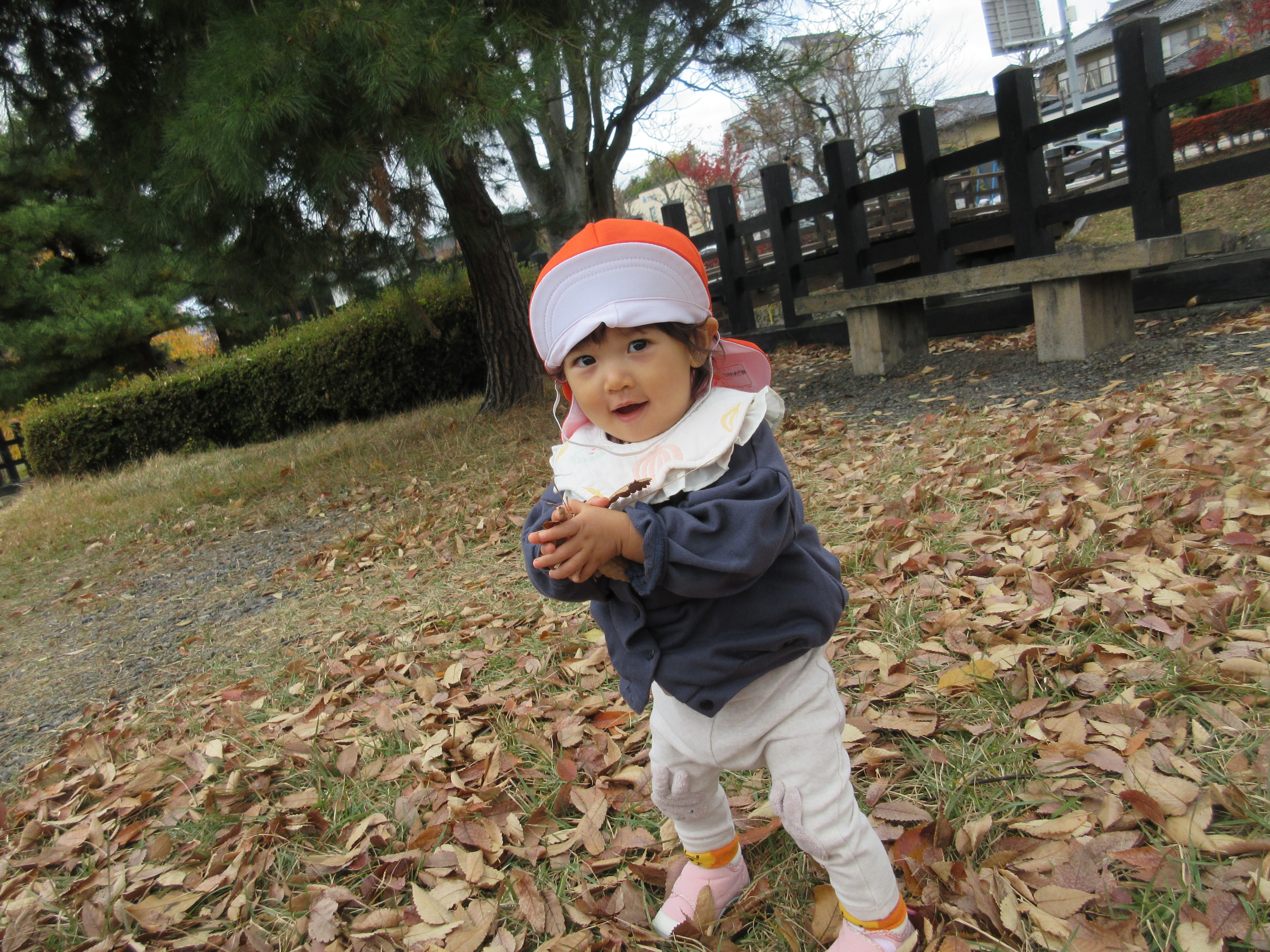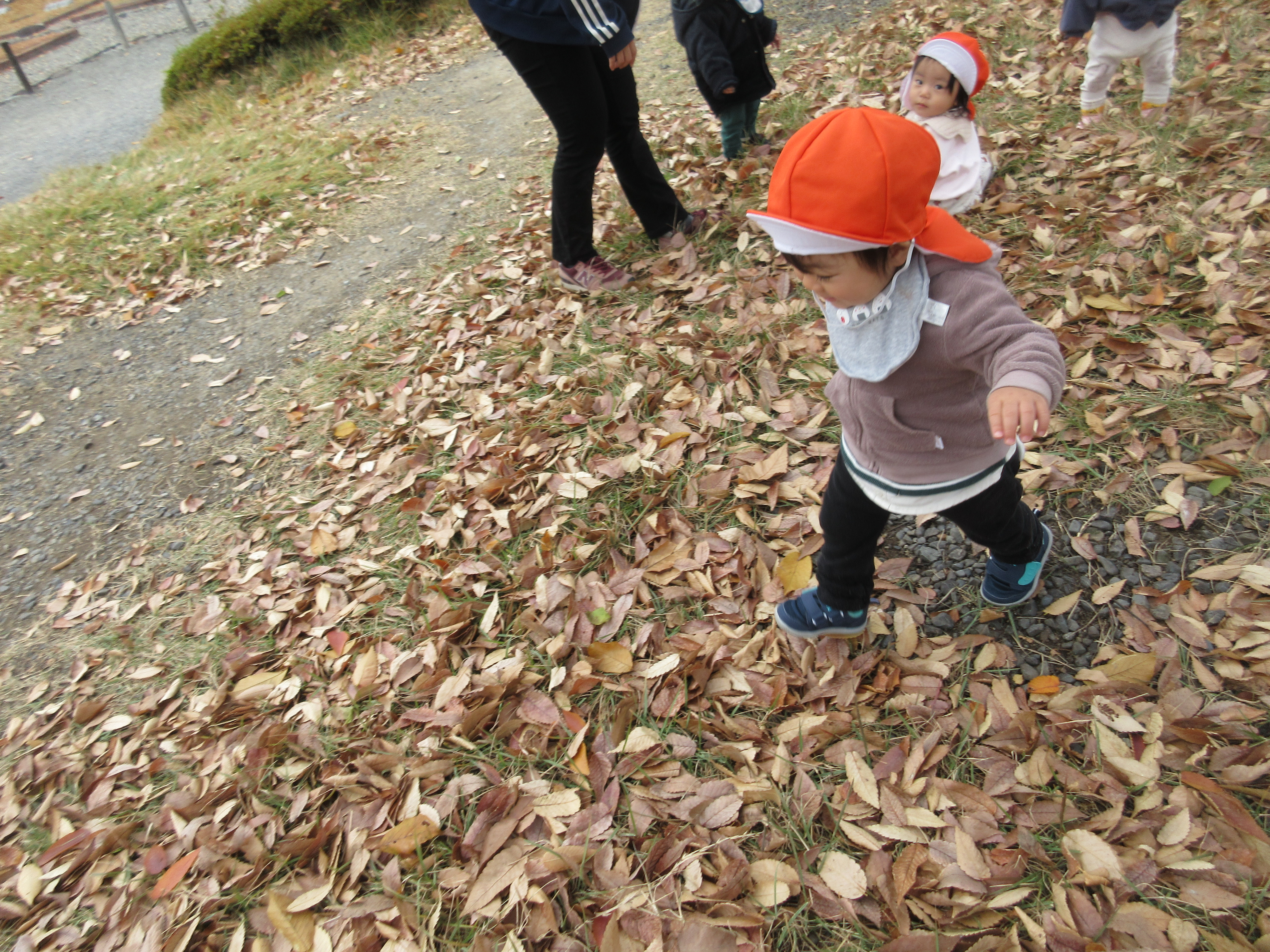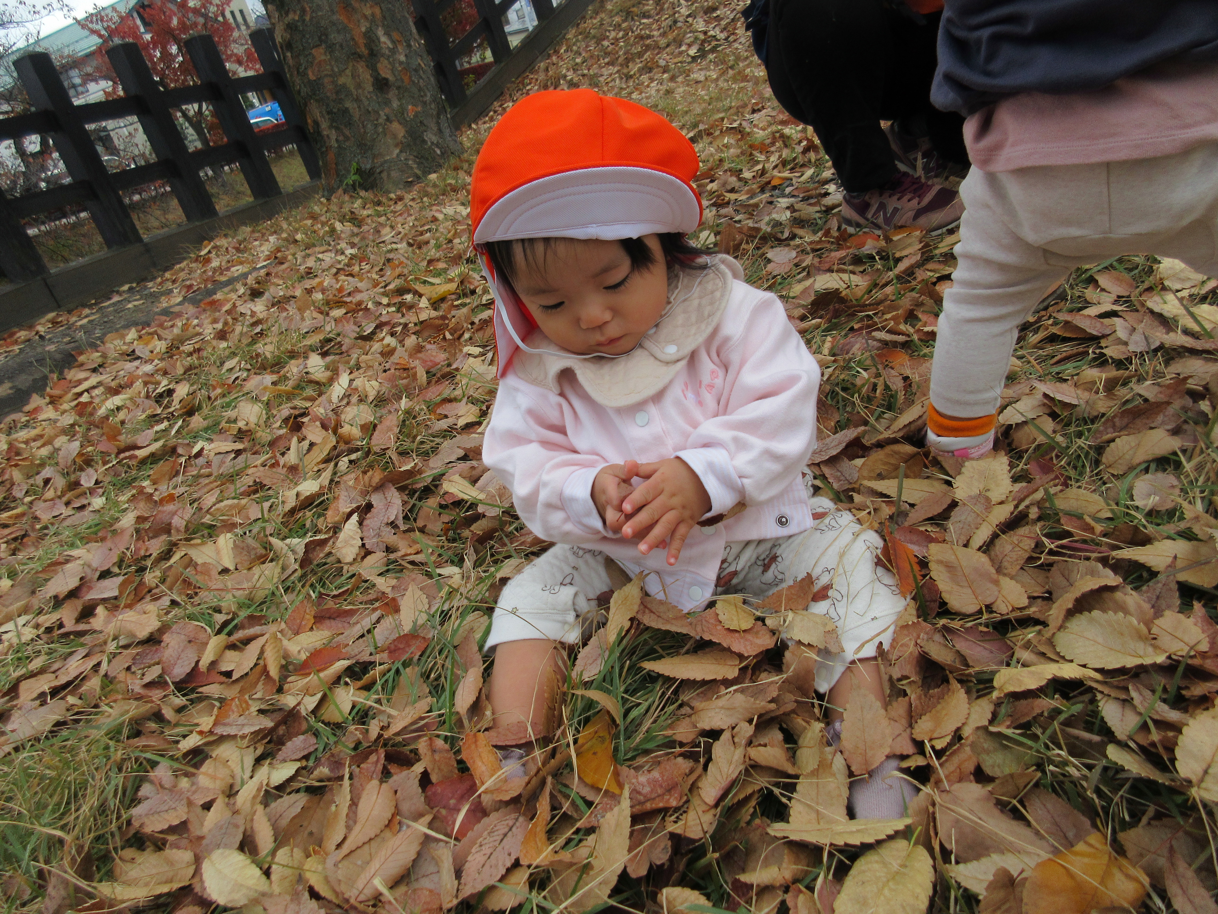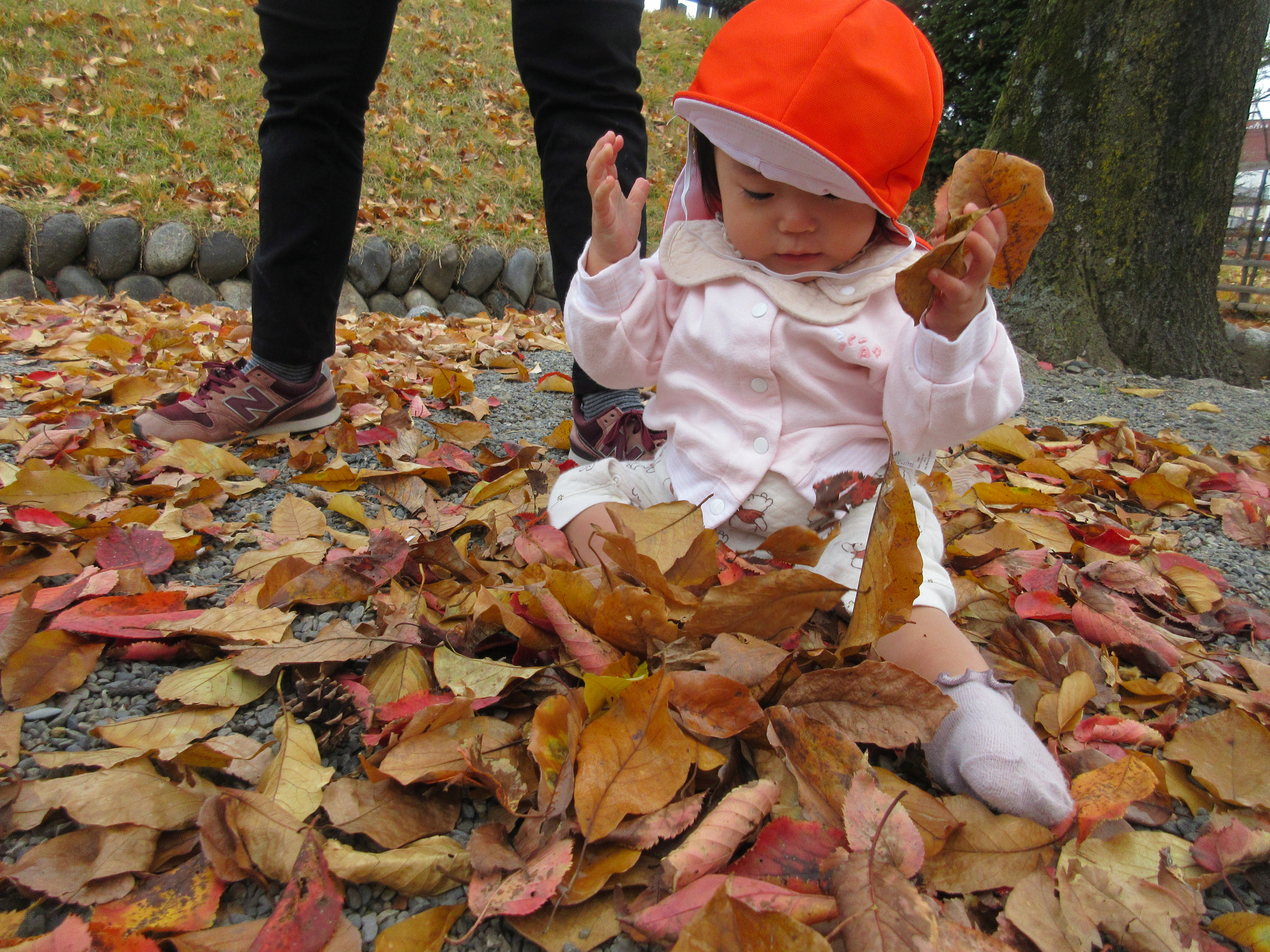 落ち葉がたくさんあり、その落ち葉をかわいい手で集めたり