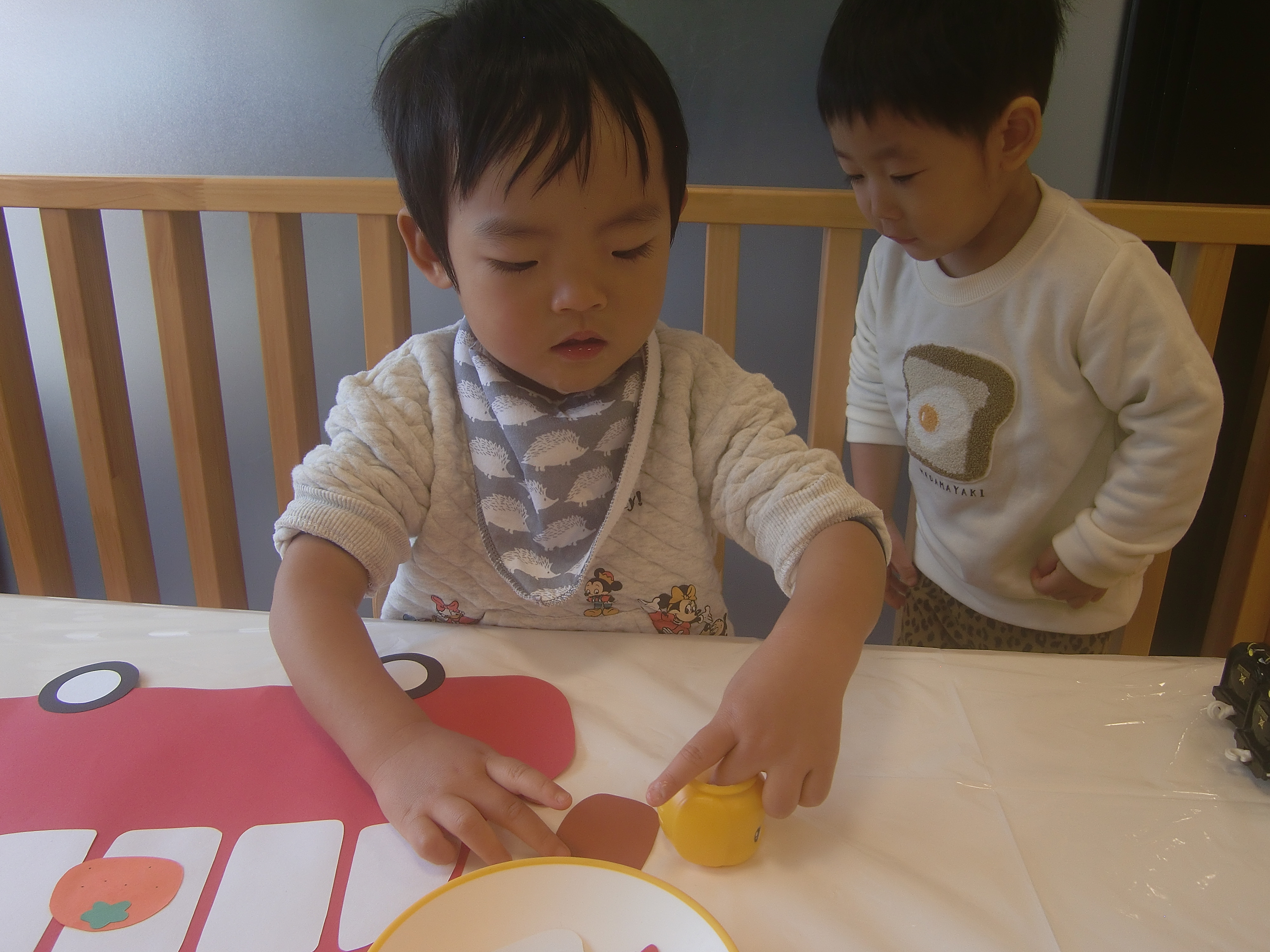 また、先生が折り紙の裏に塗ってみせると上手に真似して塗っていました。