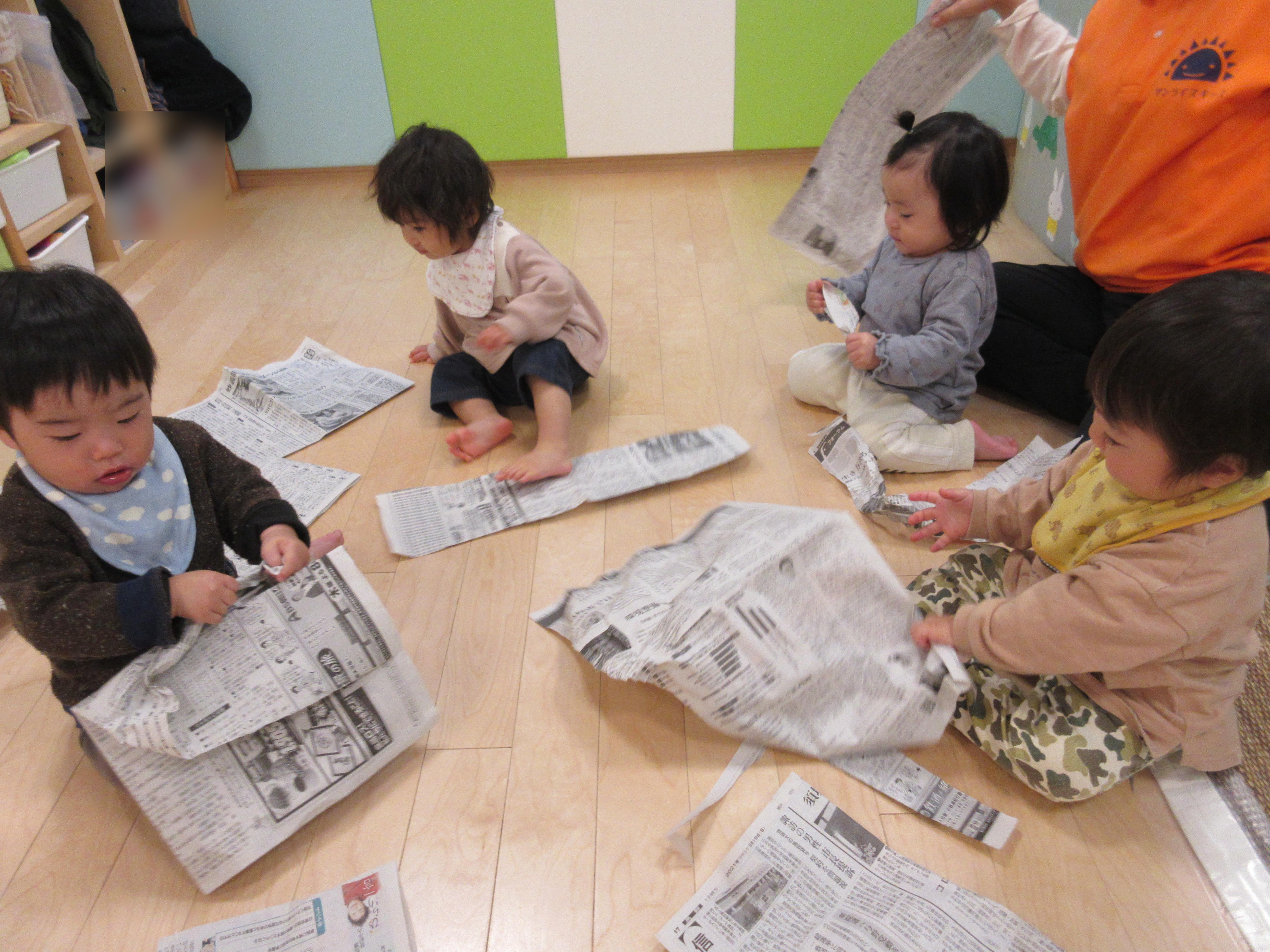 やきいもごっこでは、まずはさつまいもを焼くために新聞紙を集めてビリビリ~
