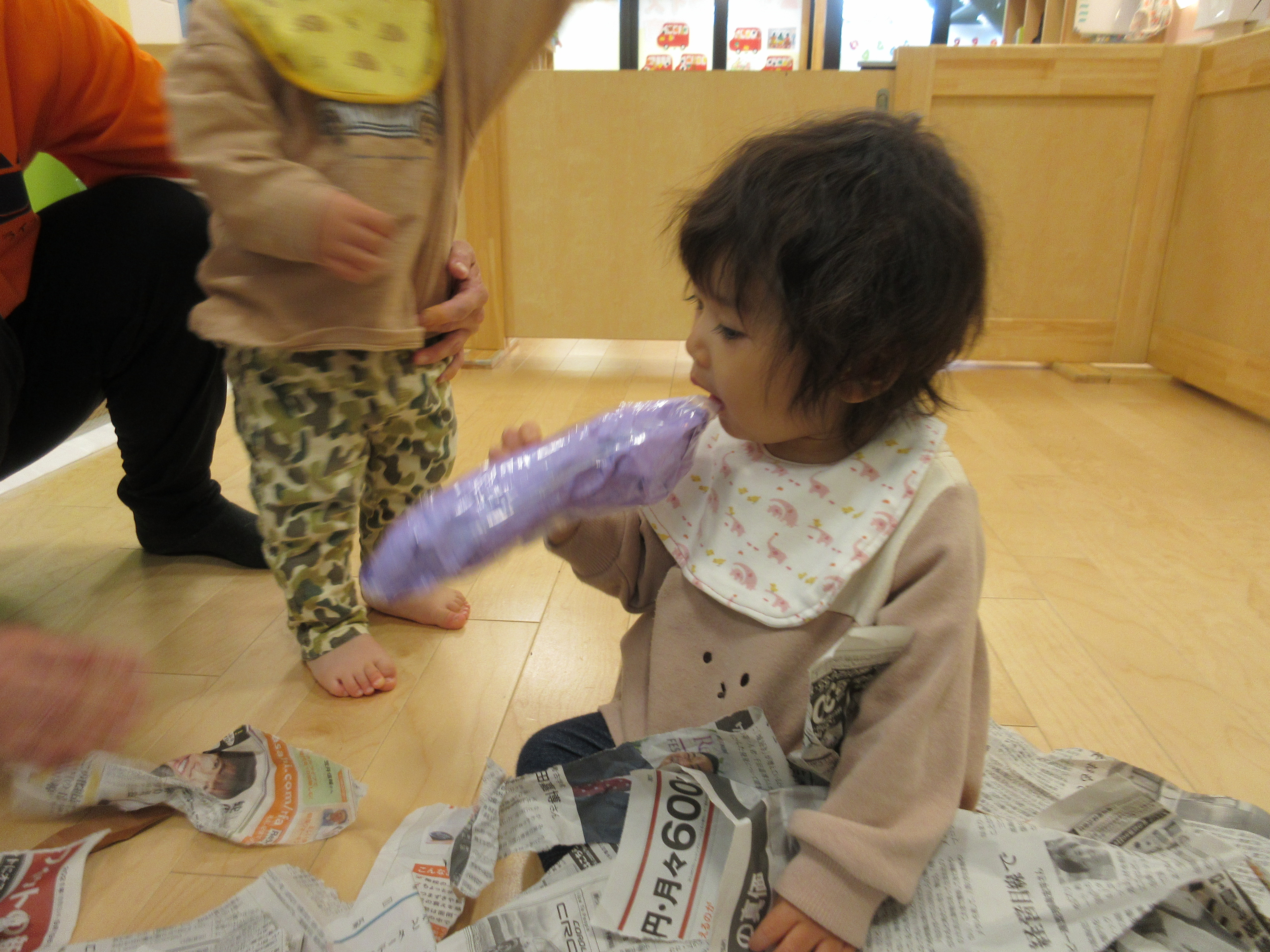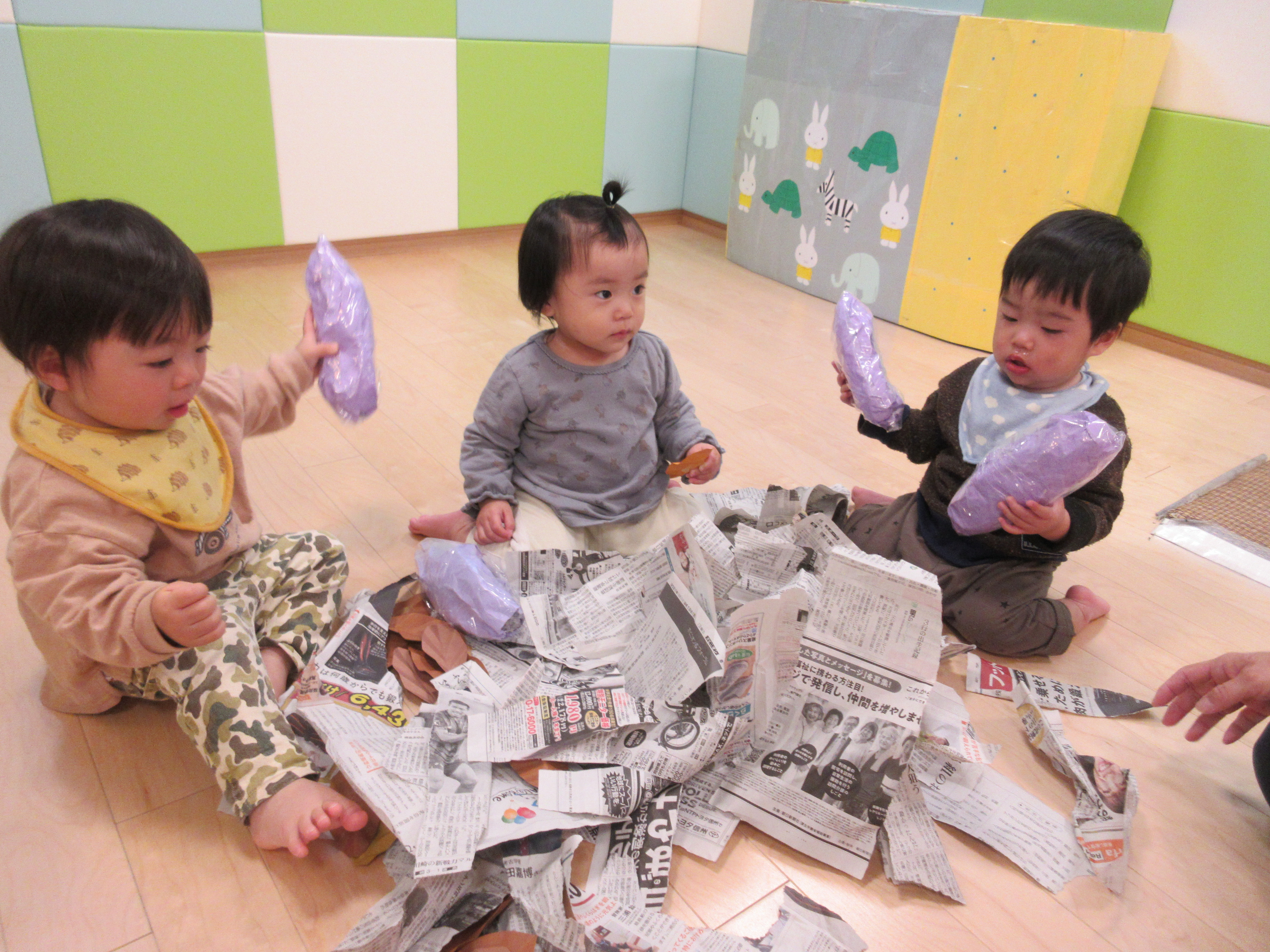 また、新聞紙と一緒に混ぜていた画用紙で作った落ち葉を気に入って持っている子もいました。