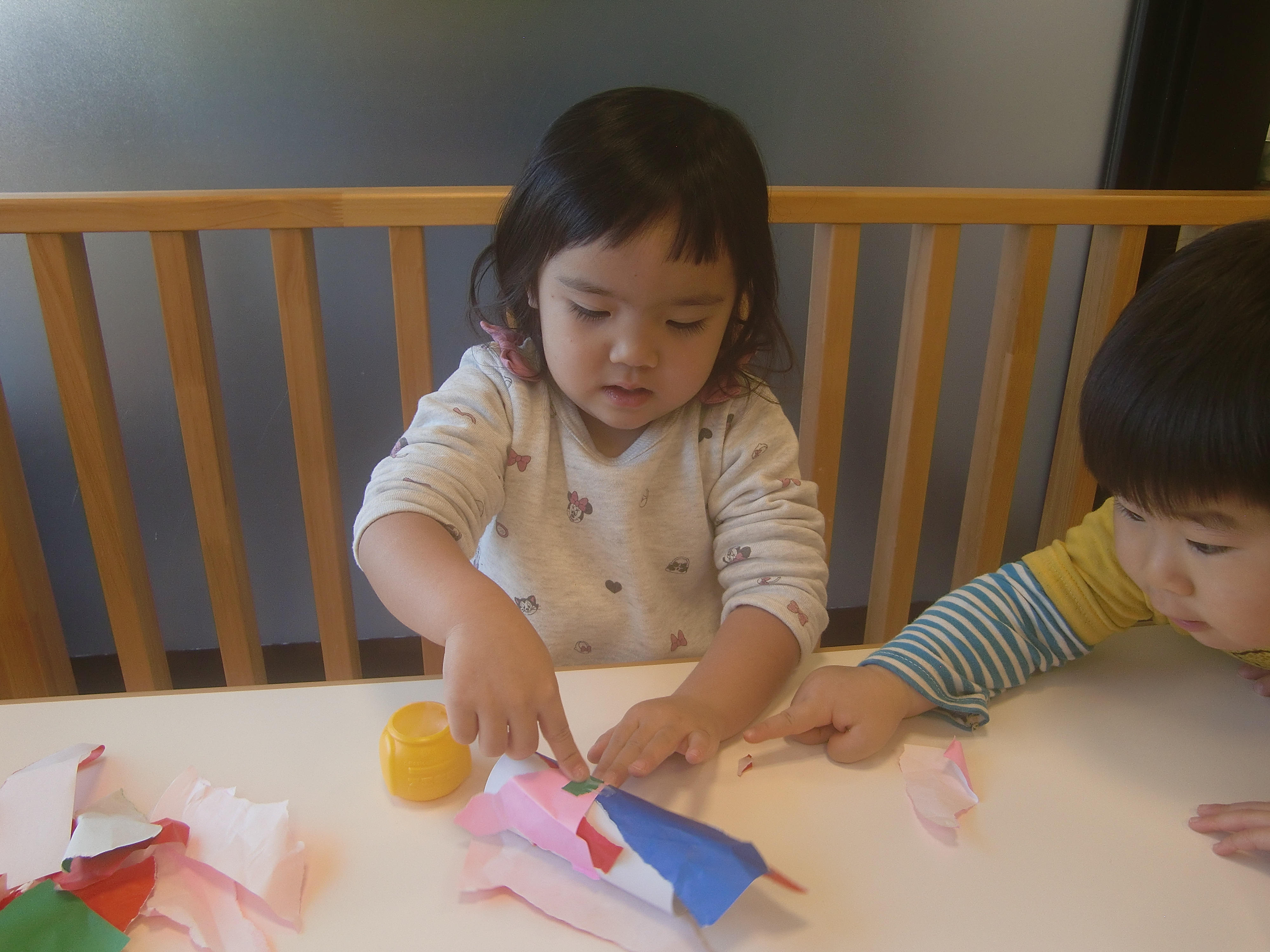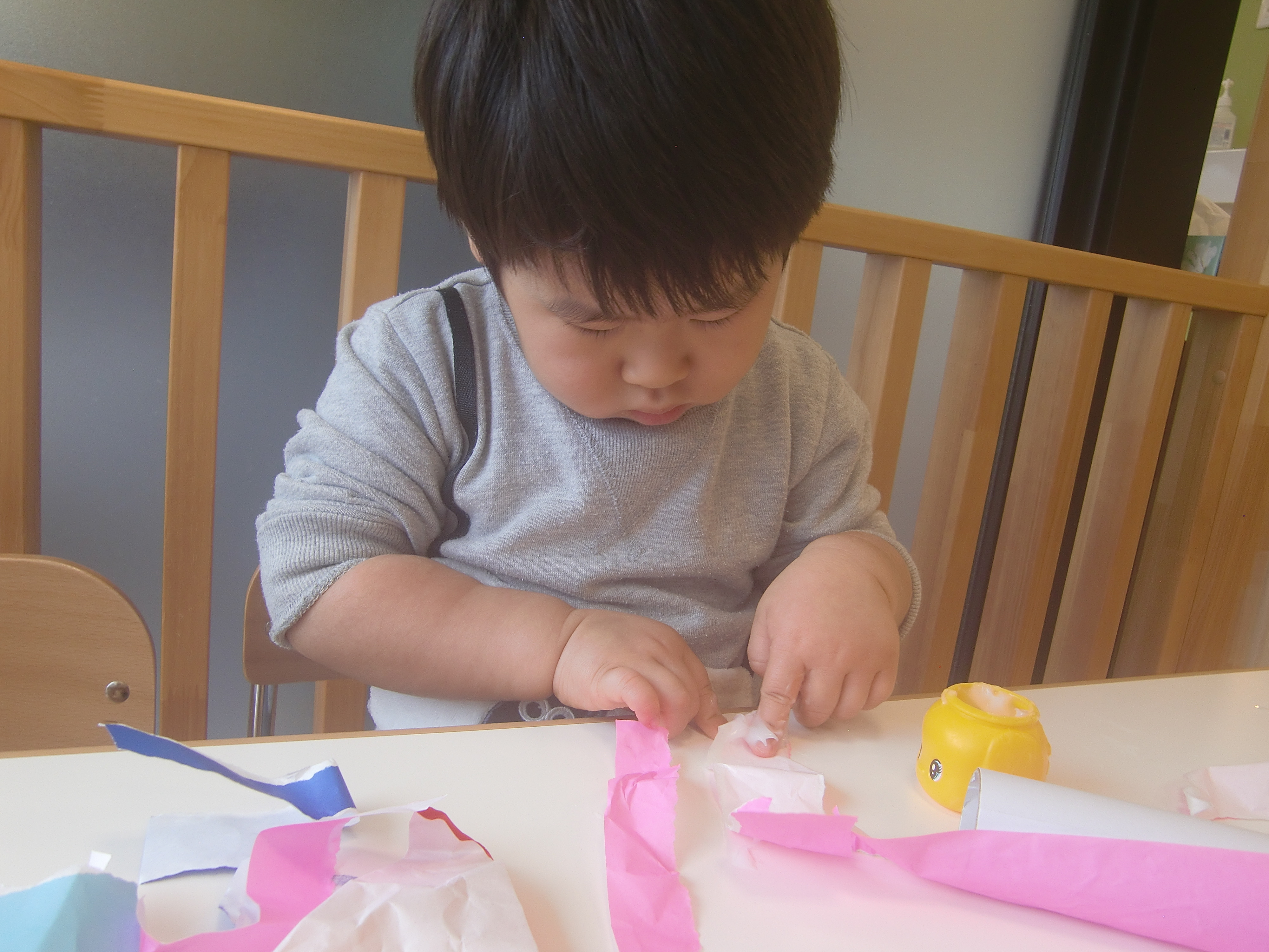 前回の「おべんとうバス」の製作でのりを使ったので、慣れた手つきで次々折り紙を貼っていましたよ。