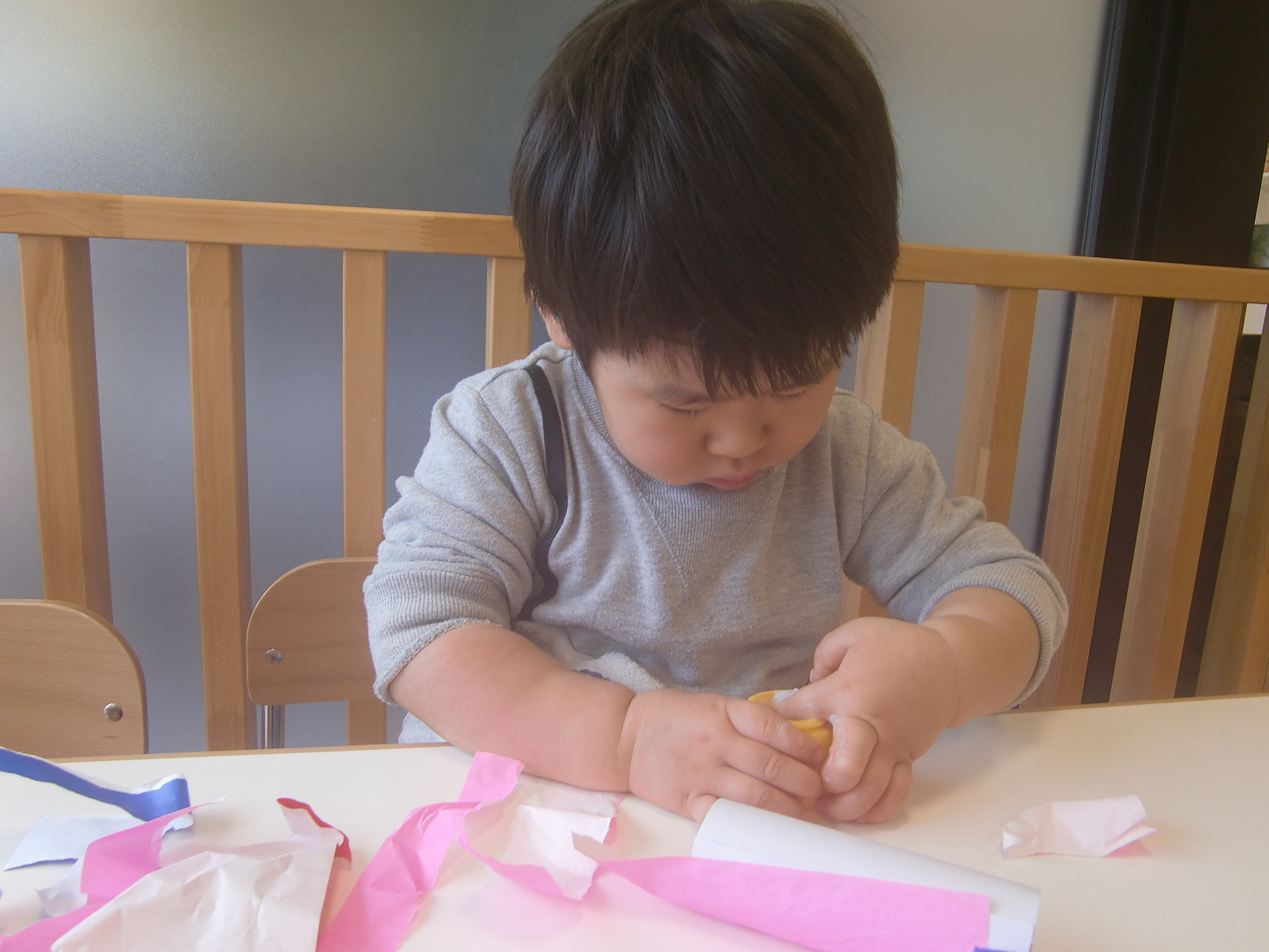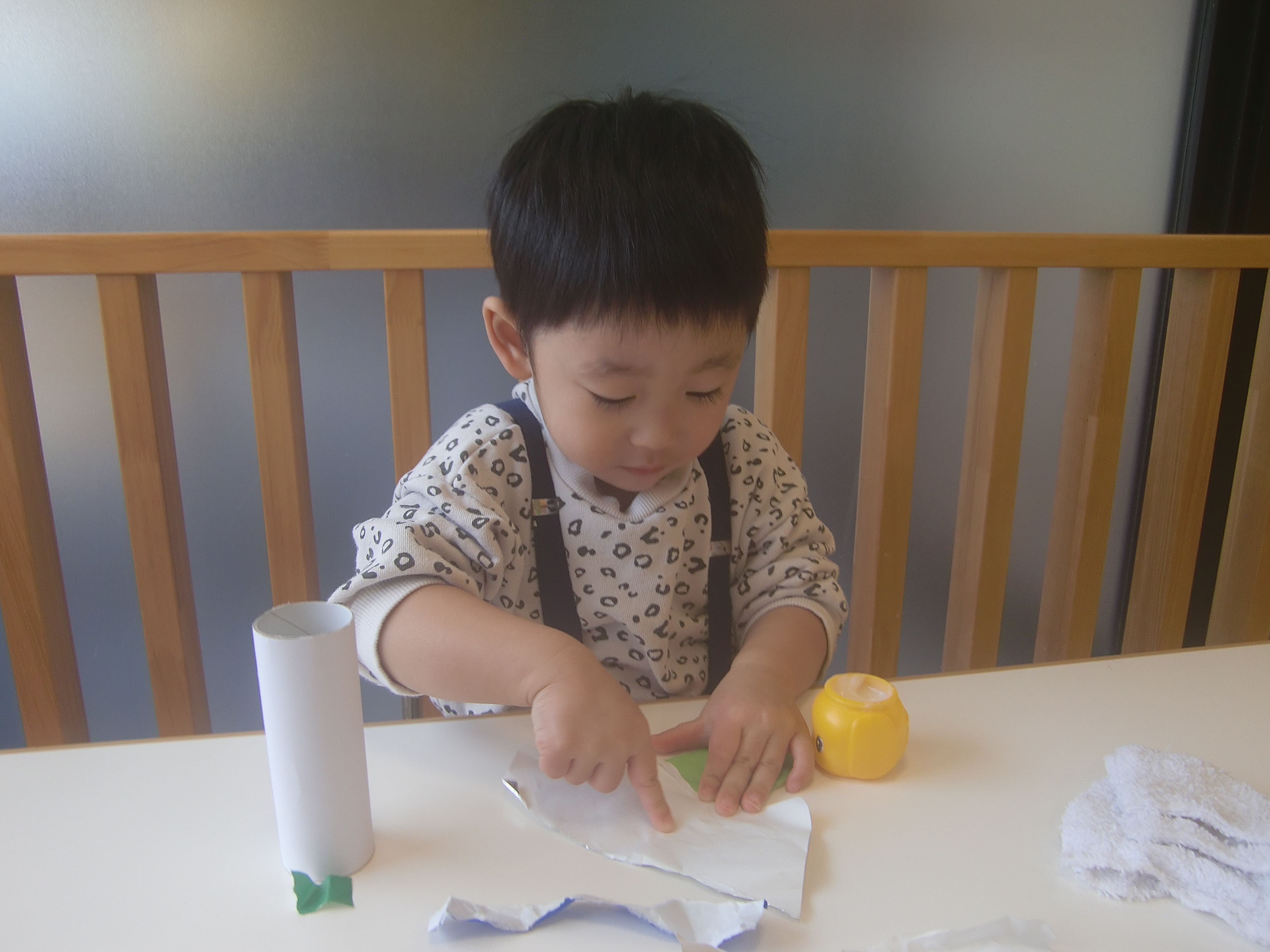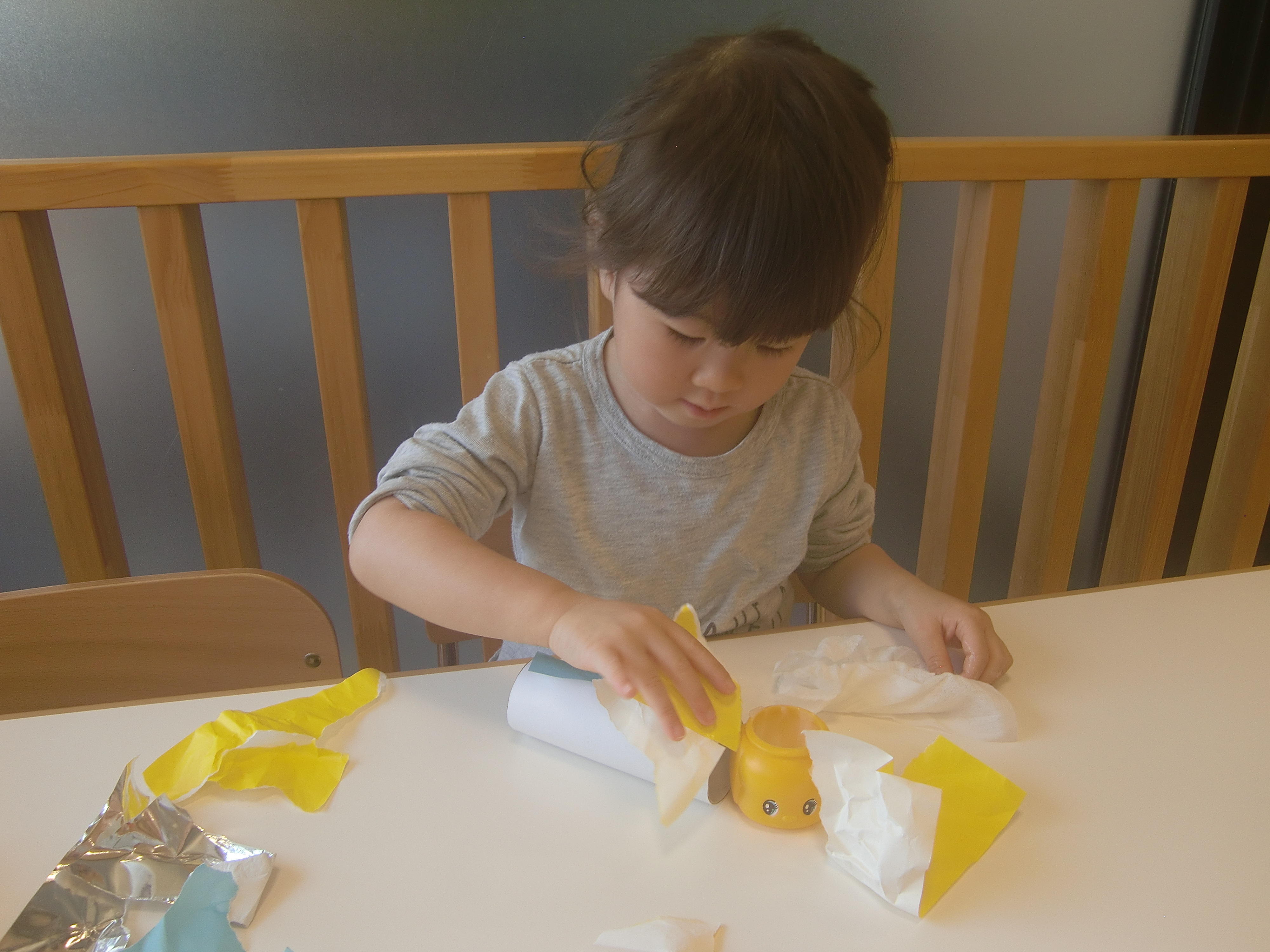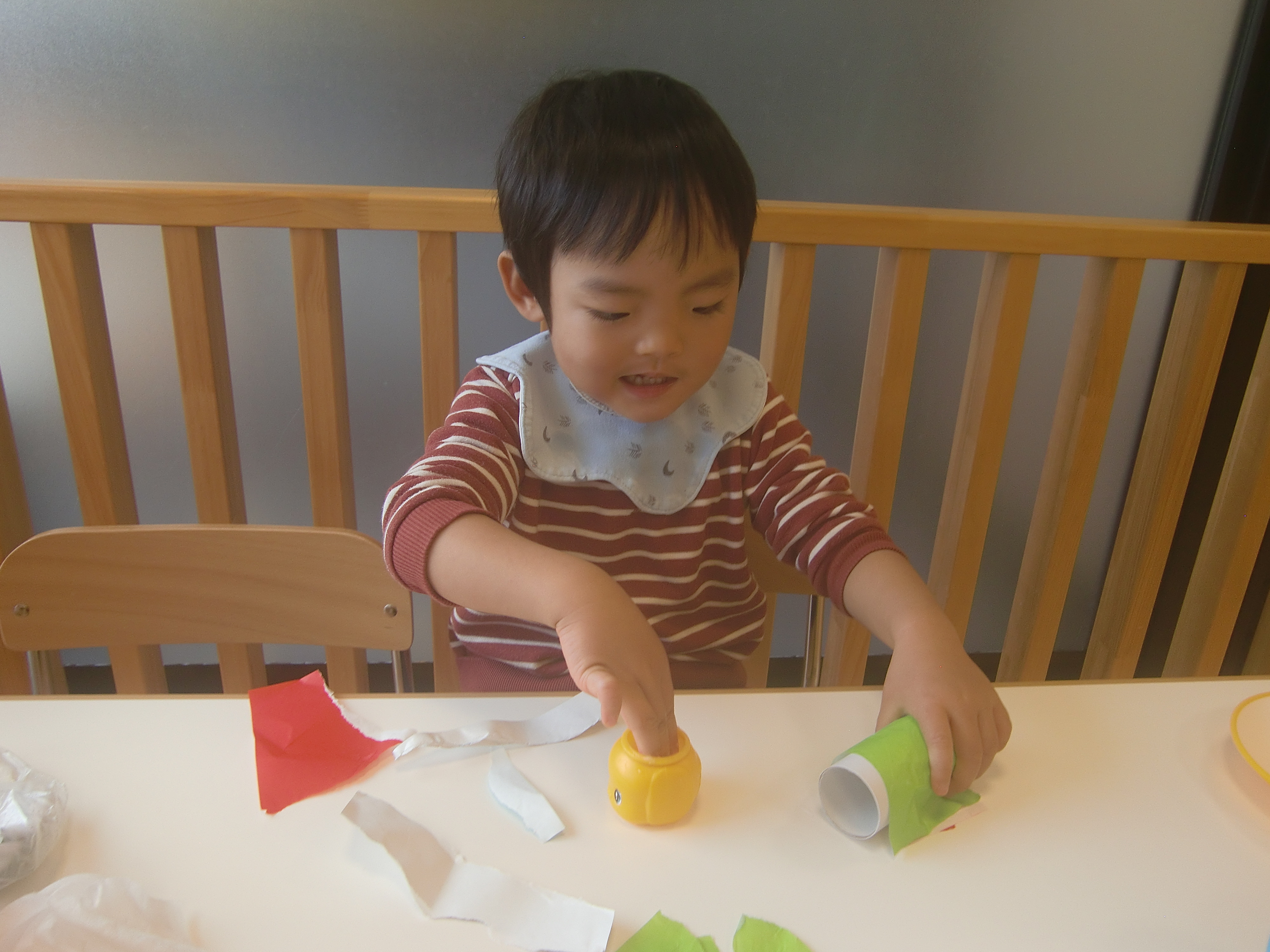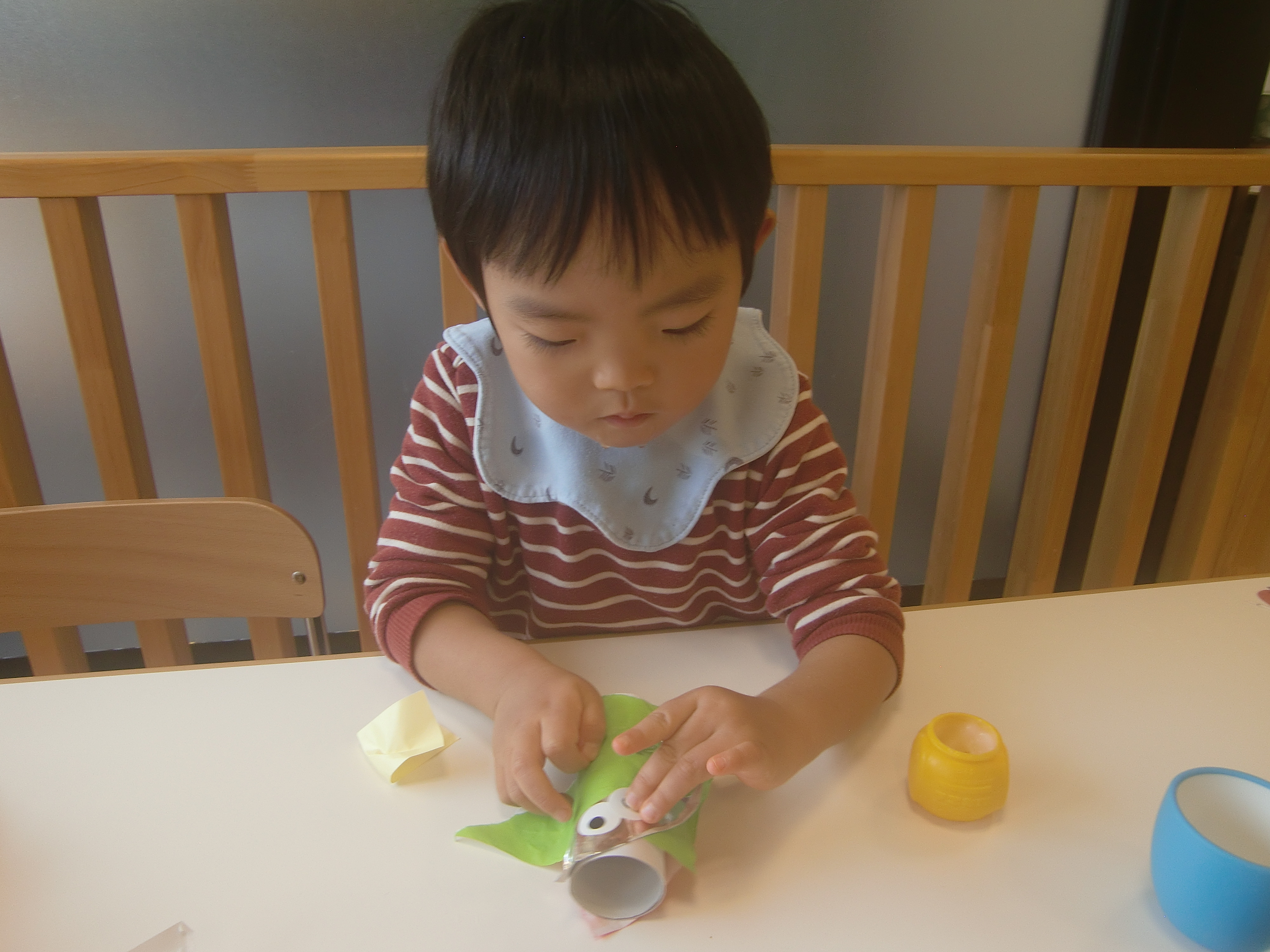 先週にちぎってもらっていた折り紙をトイレットペーパーの芯に貼って、『みのむし』を作りました。