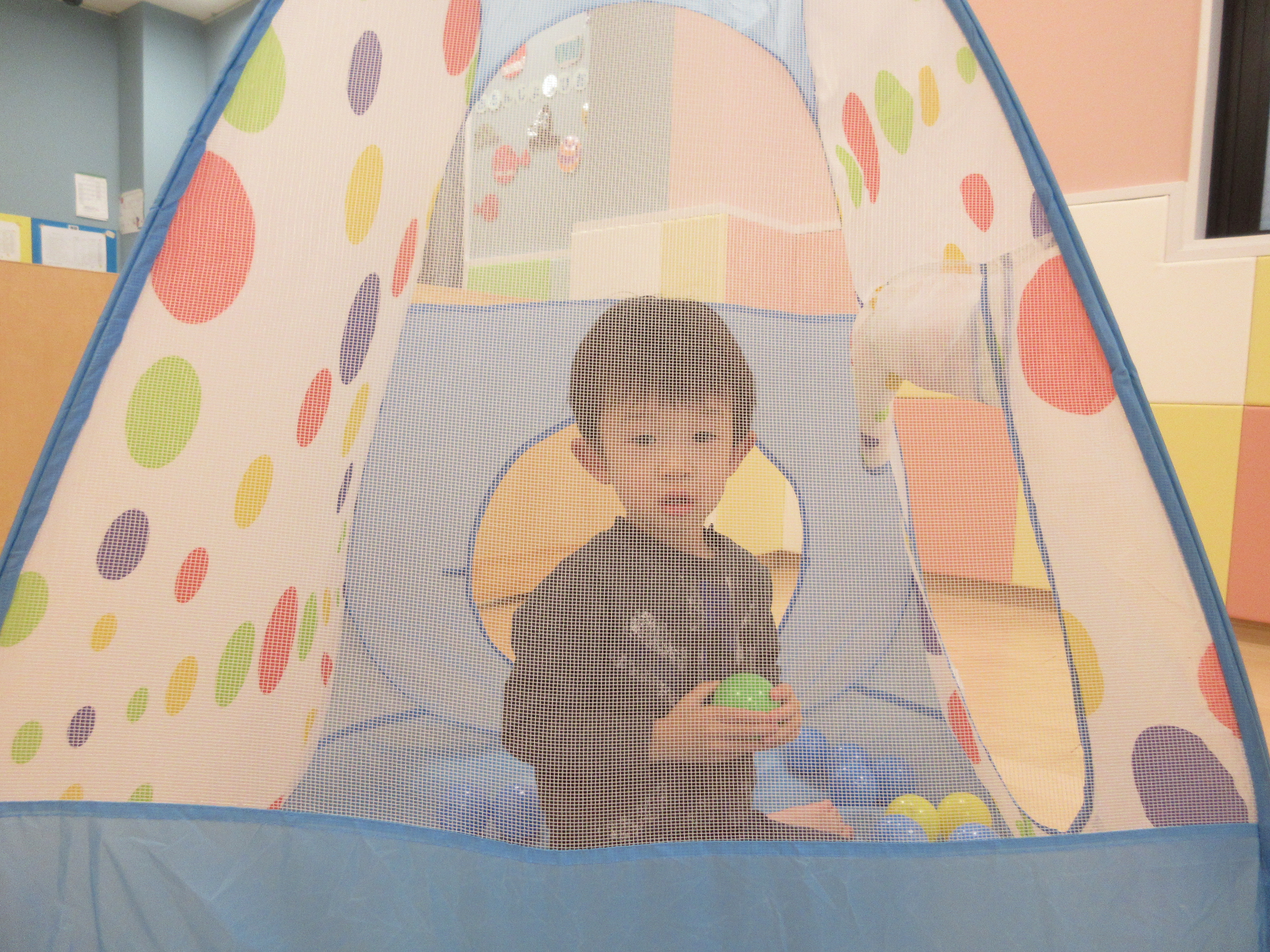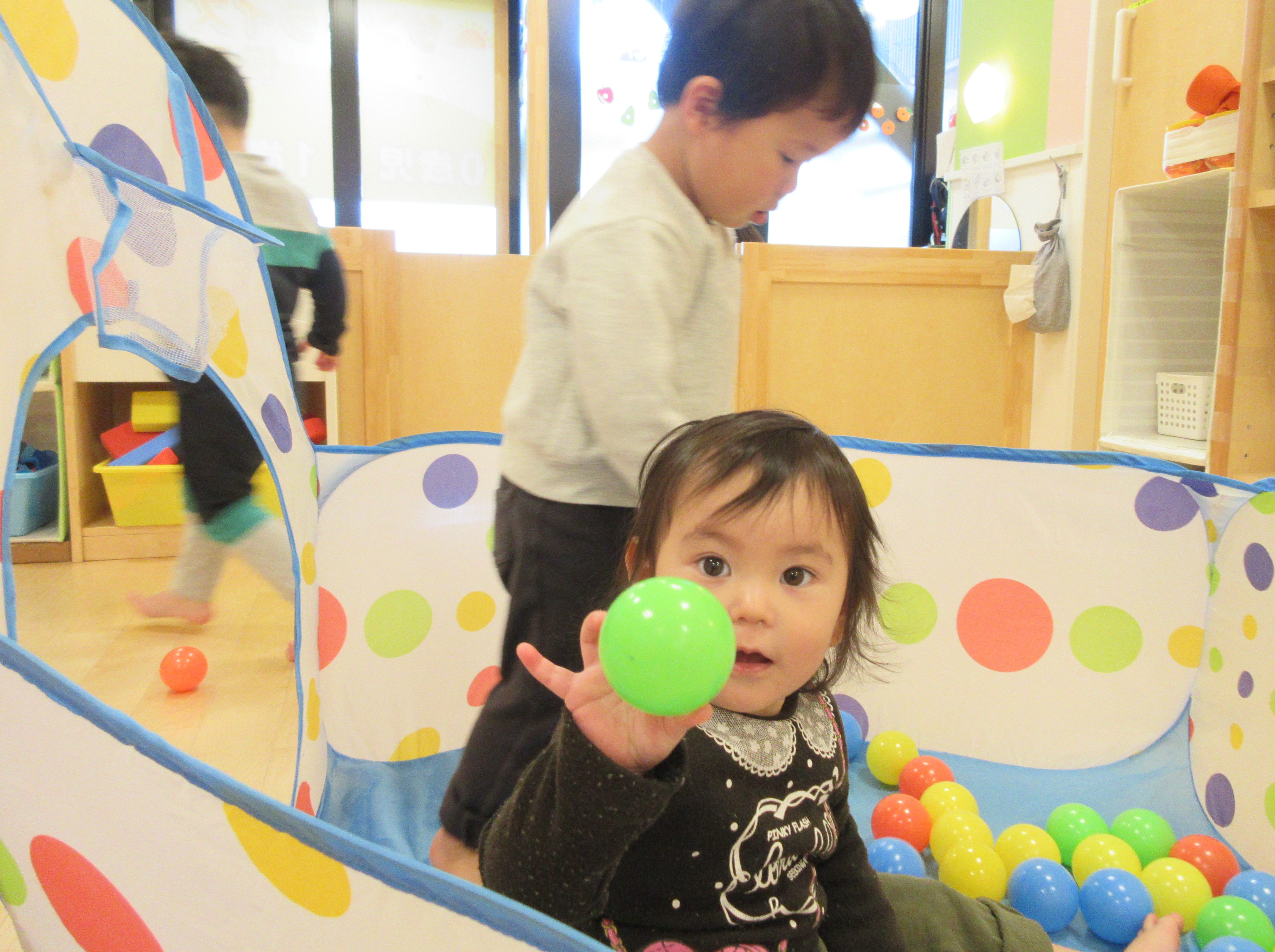 月曜日には久しぶりにボールプールで遊びました。プールを準備すると「イェーイ」と大喜びでした![]()