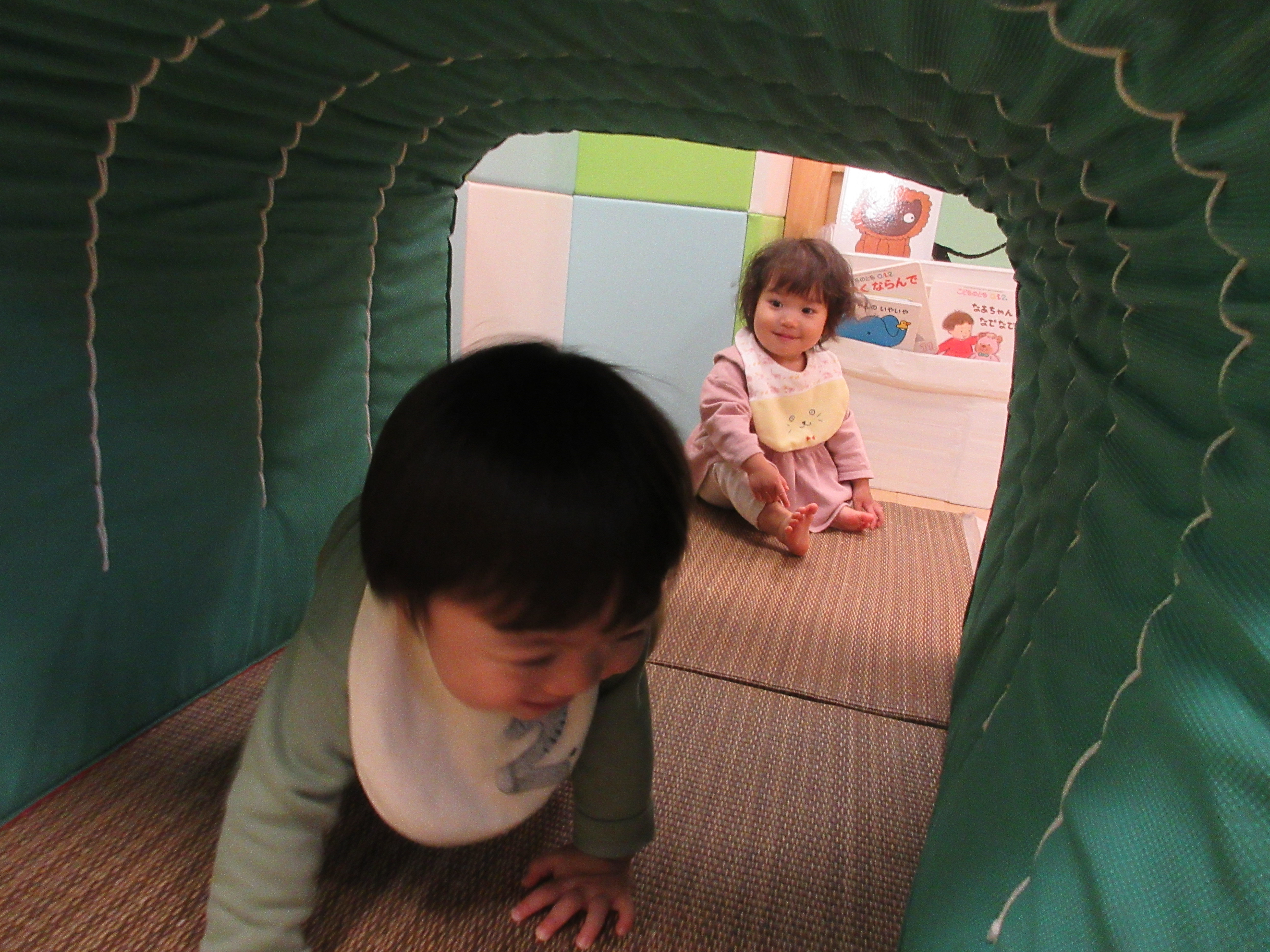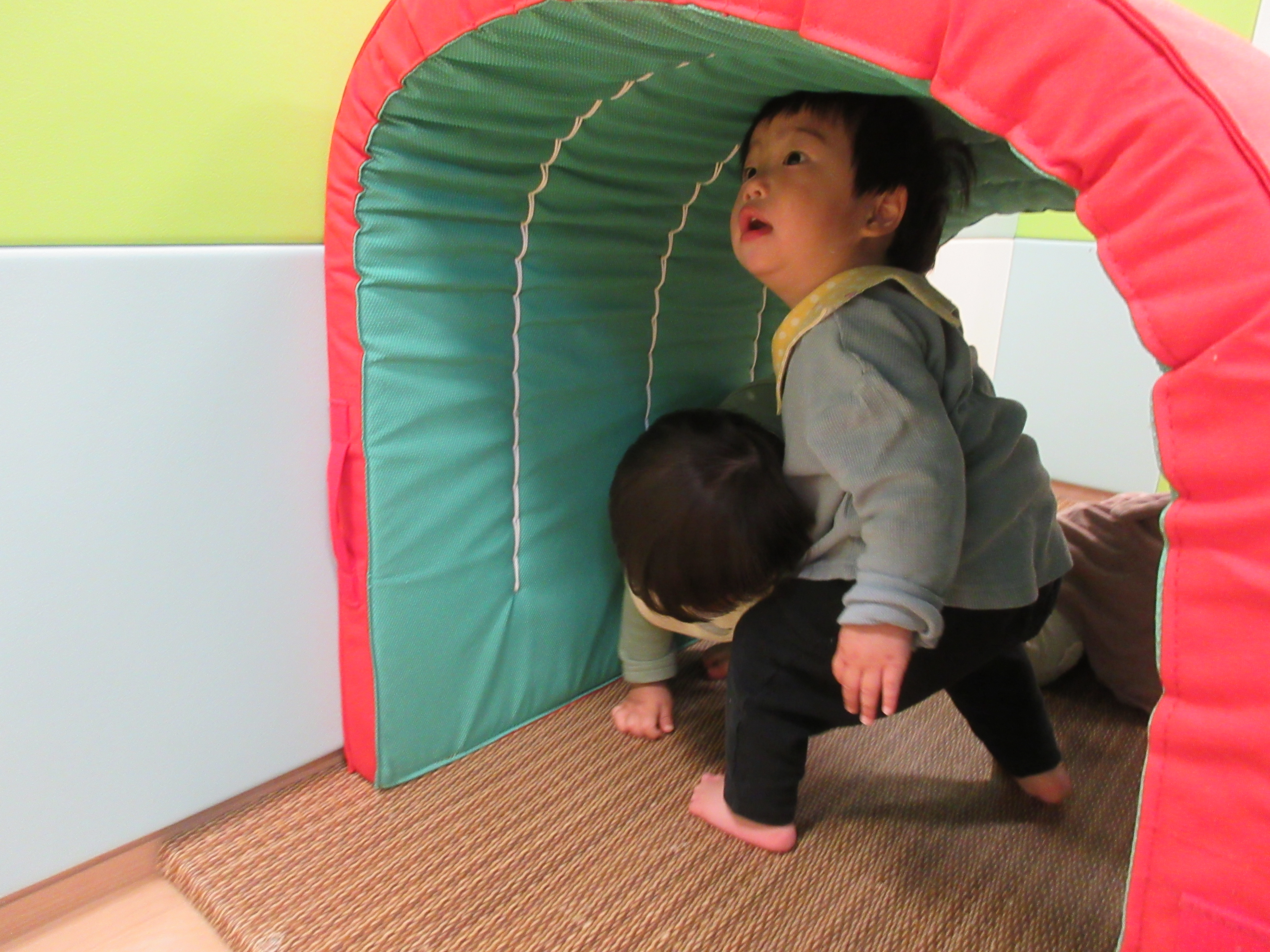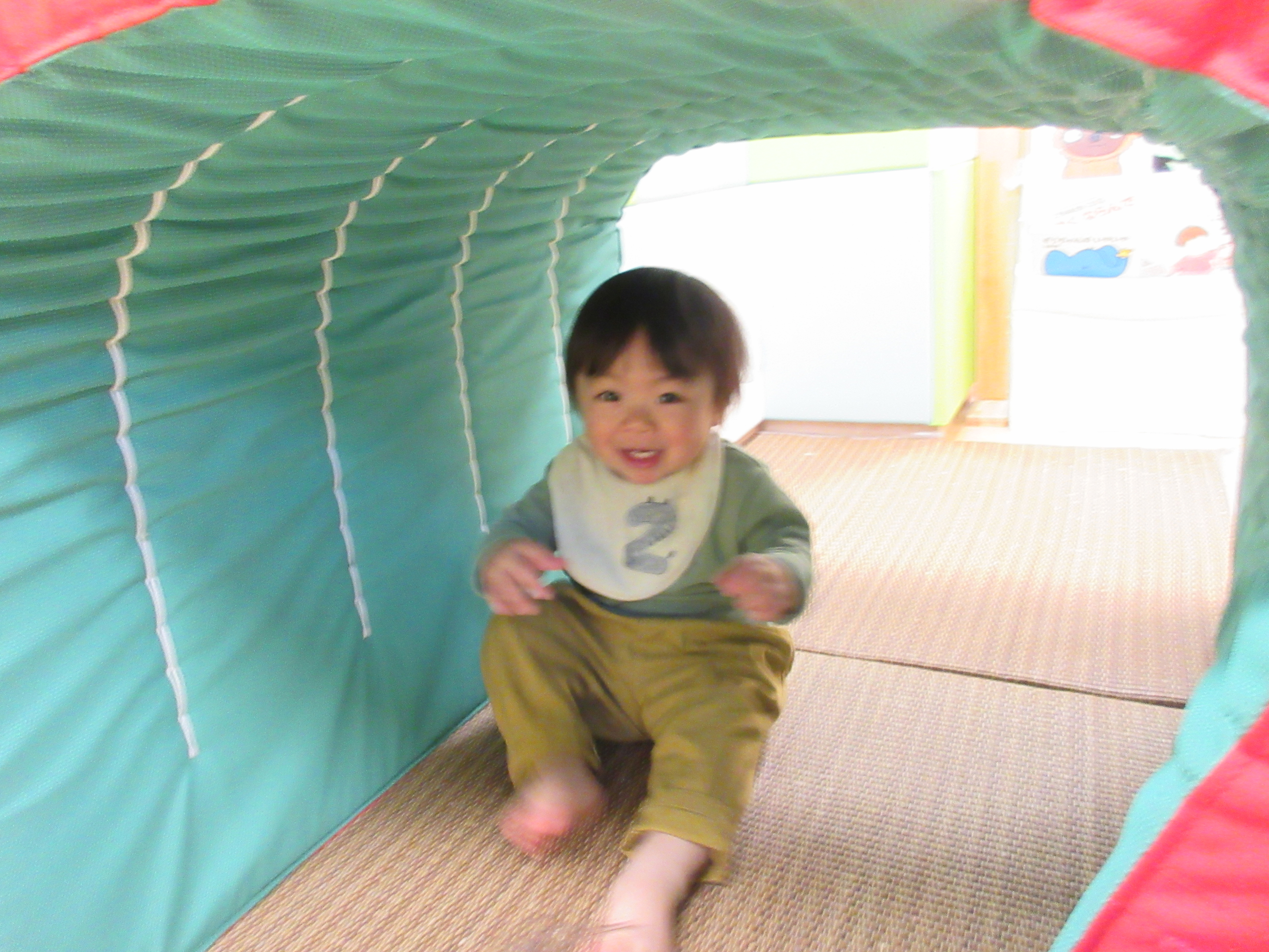 小走りでマットのところまで来て、トンネルの中に入る子どもたち。トンネルの中が嬉しくて足をバタバタさせていたため、⇧の写真はぶれています。そんな写真も可愛いですよね![]()