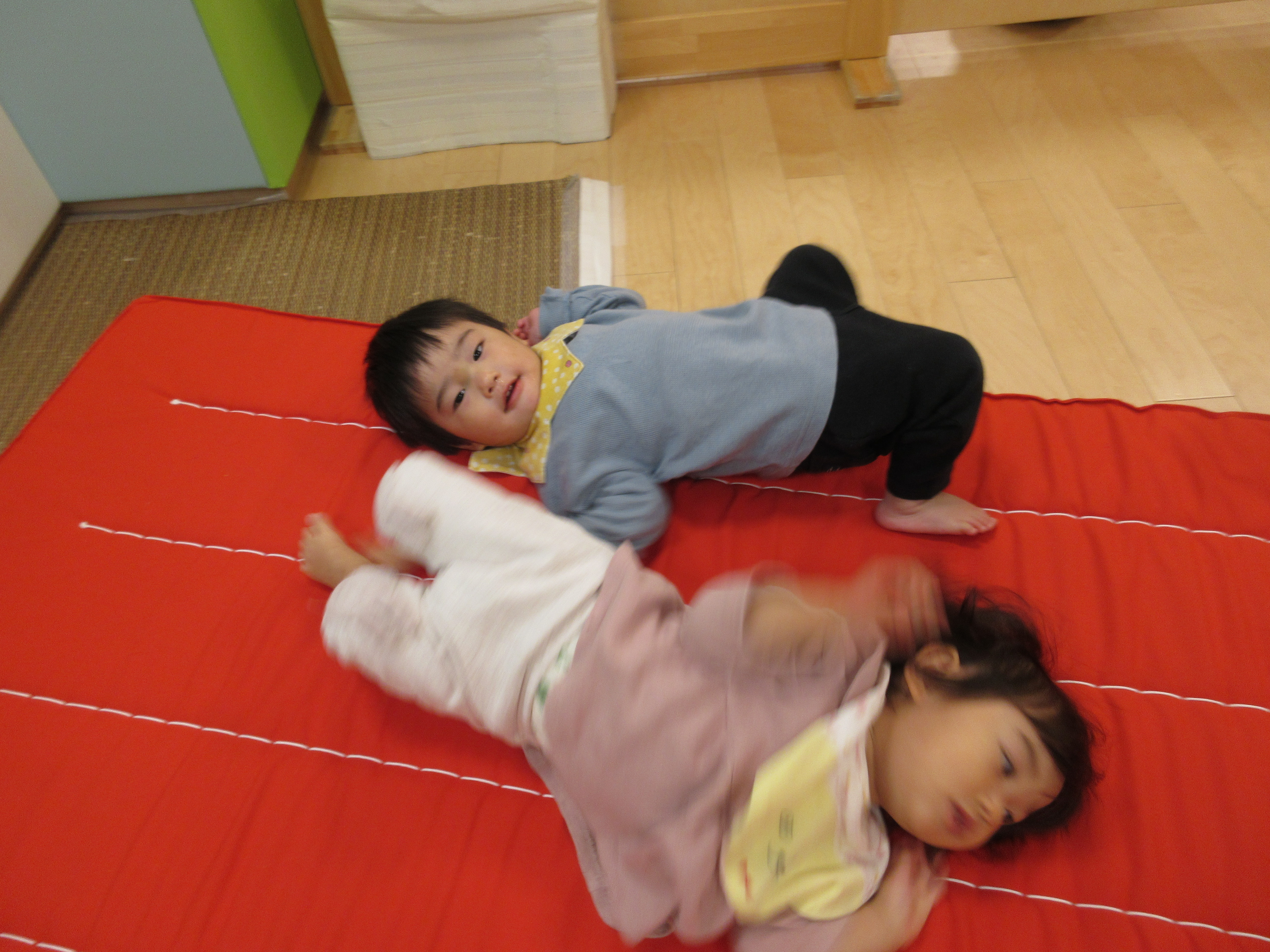 マットの上に転がって「まだかたづけないでよ~」とアピールする子どもたちでした。