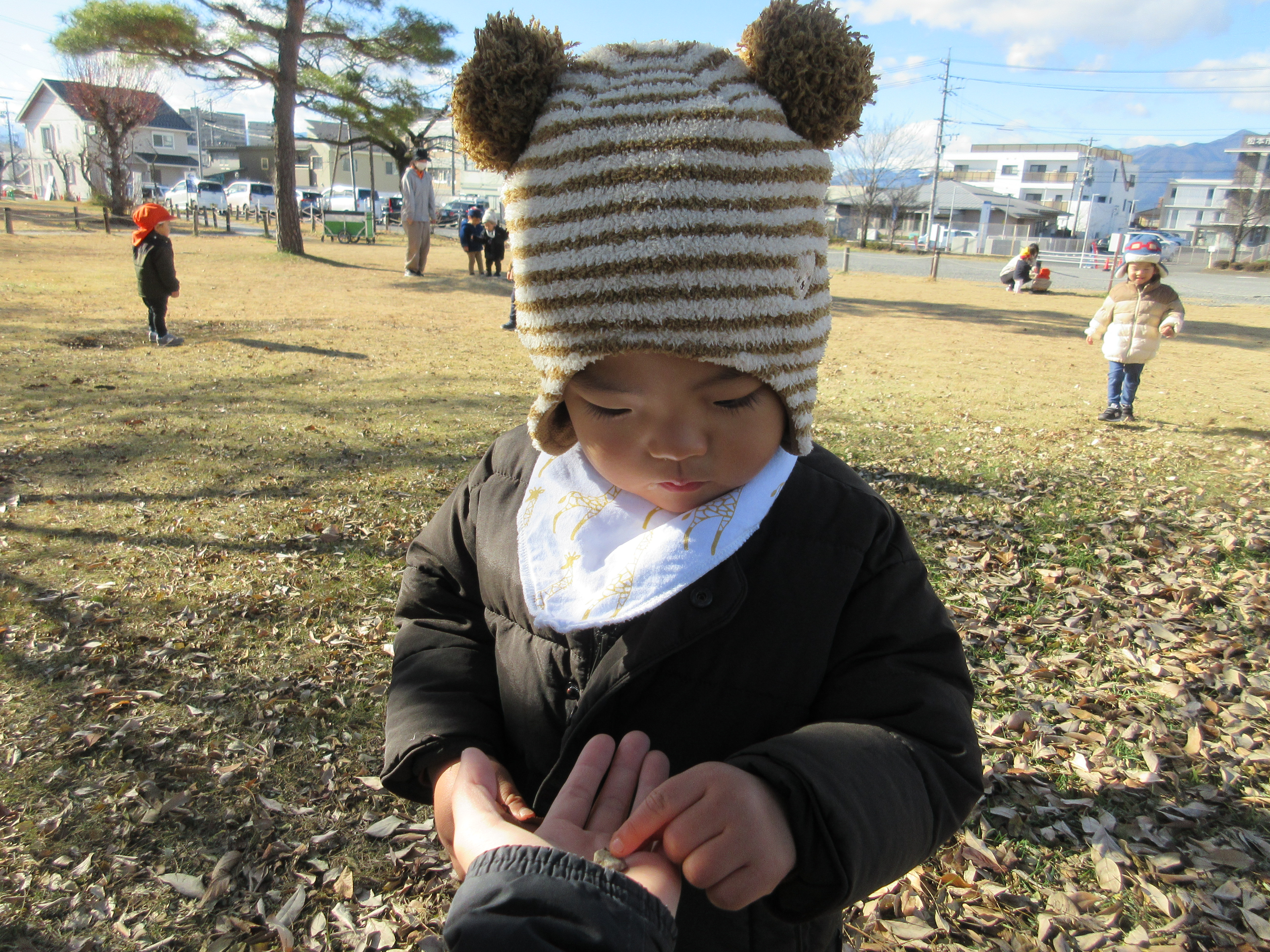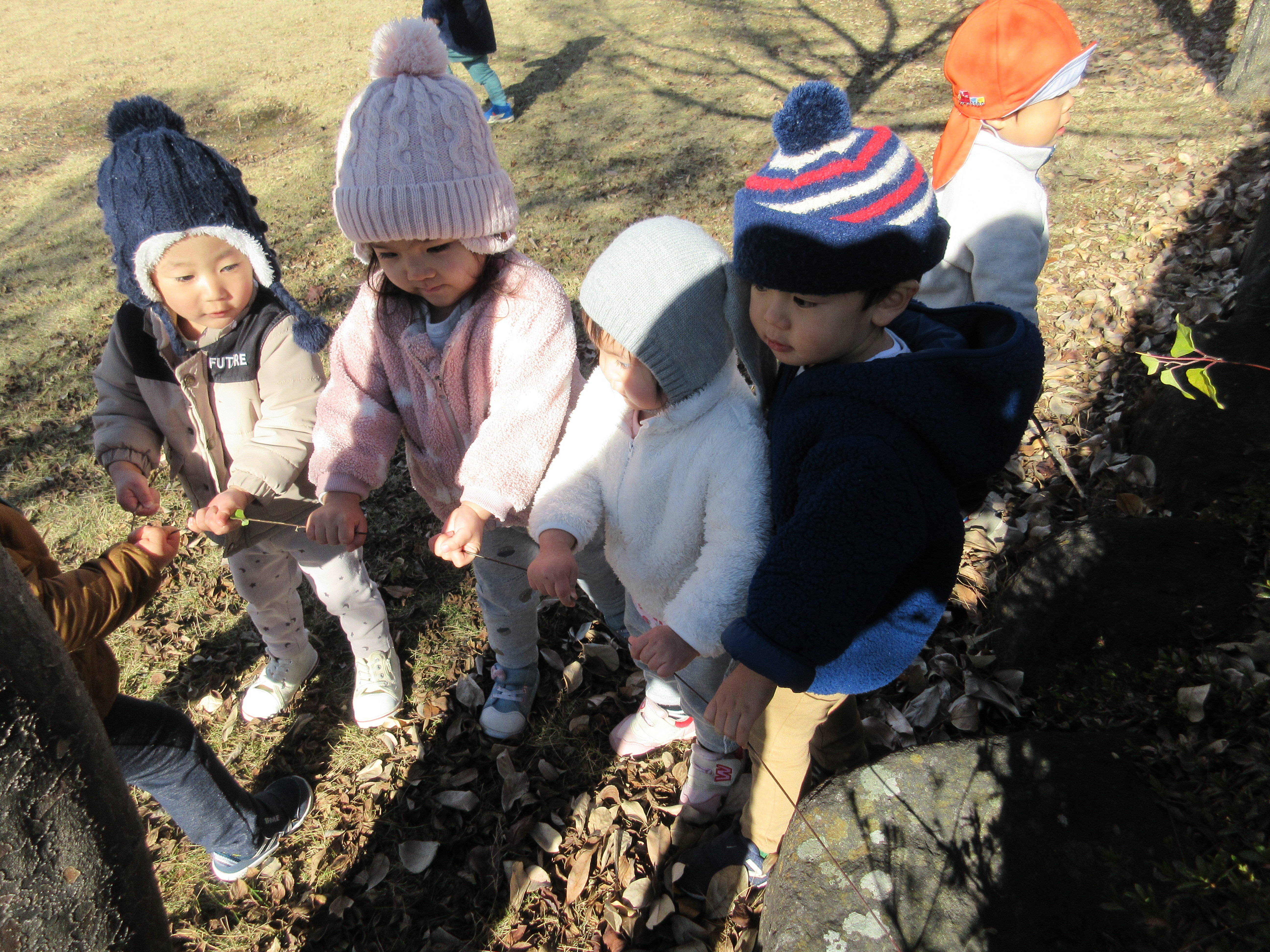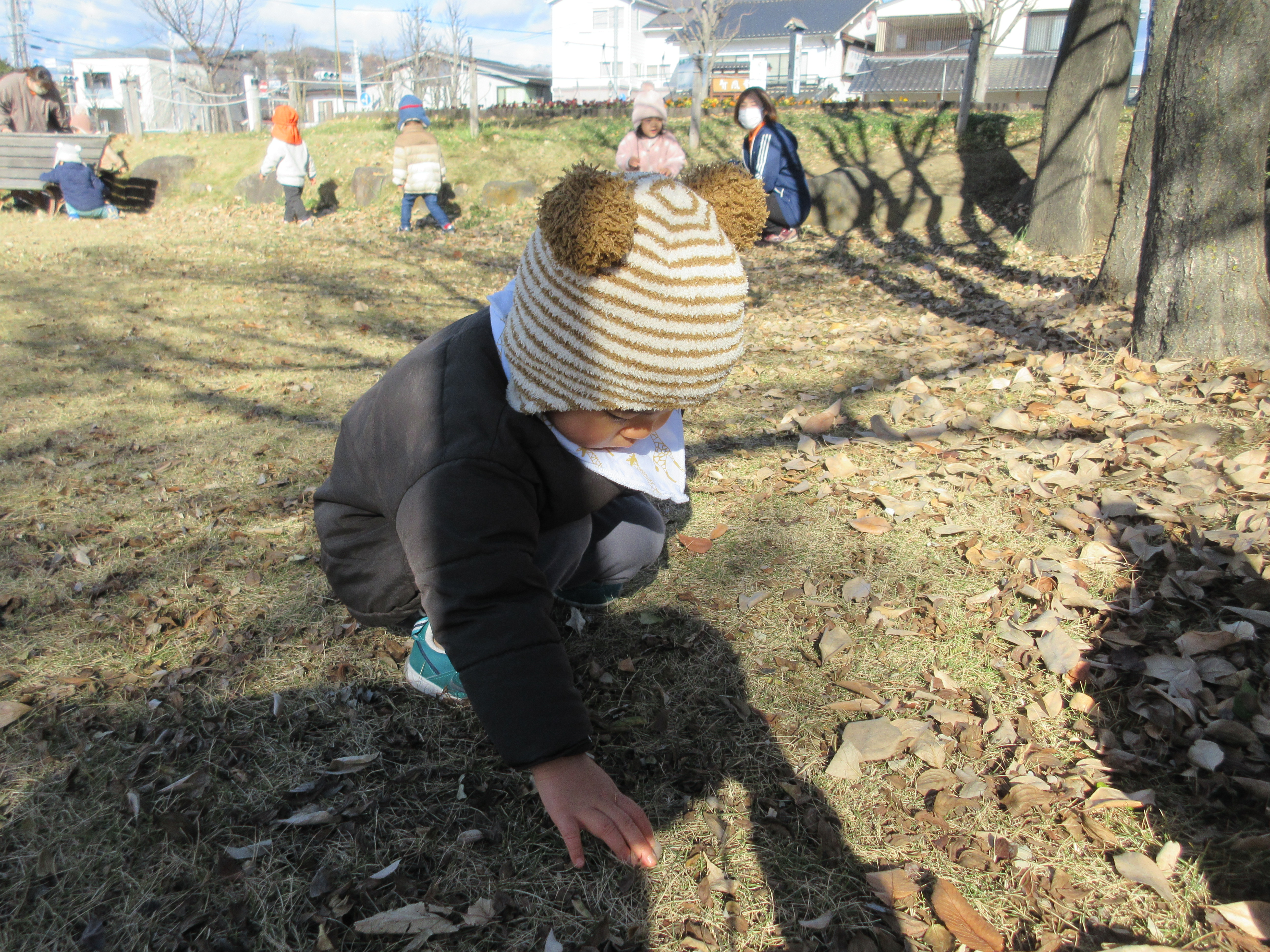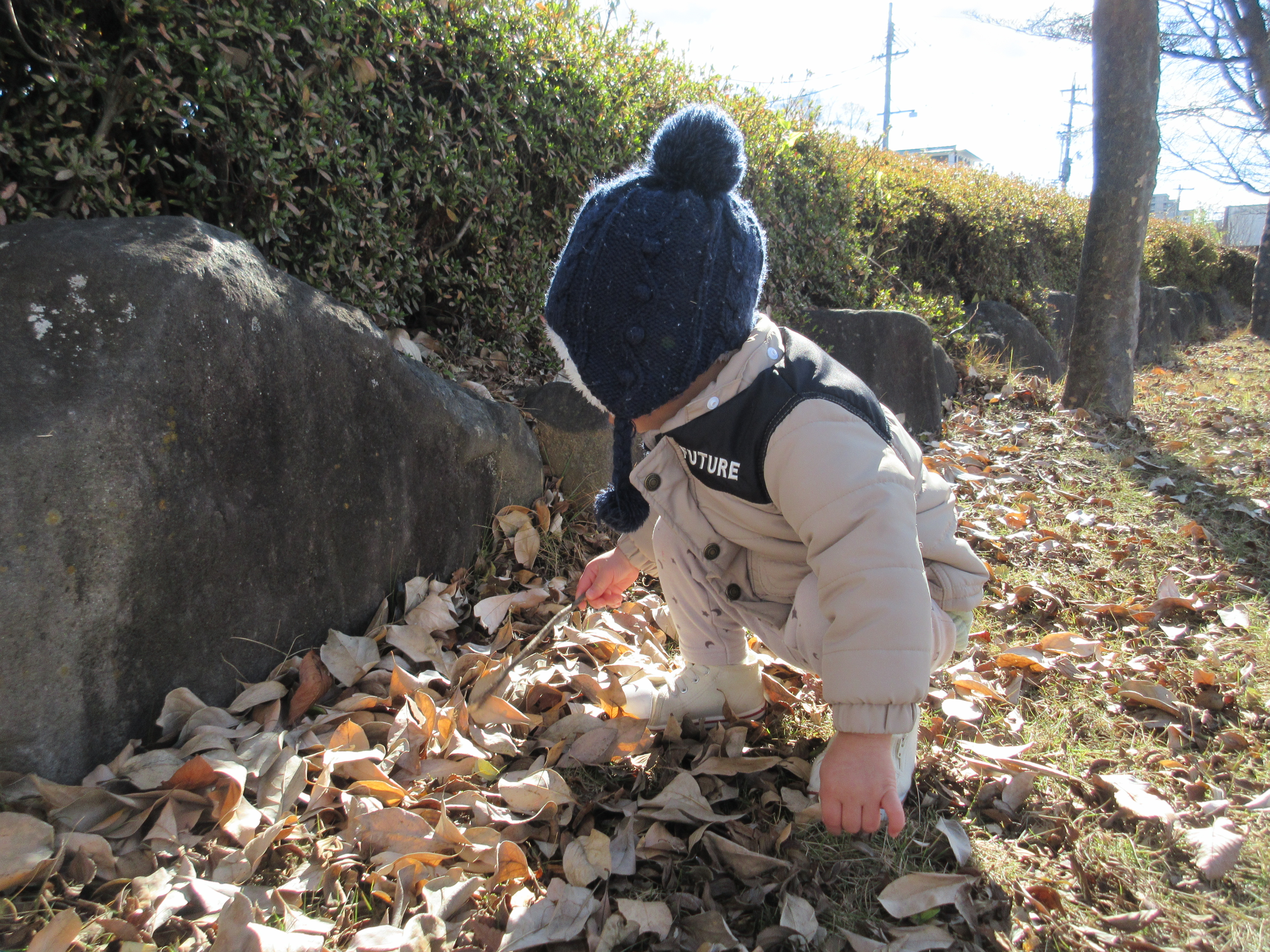 「落ち葉の下かな?」と地面を木の棒で突いてみたり、手で落ち葉をかき分けてみたりと