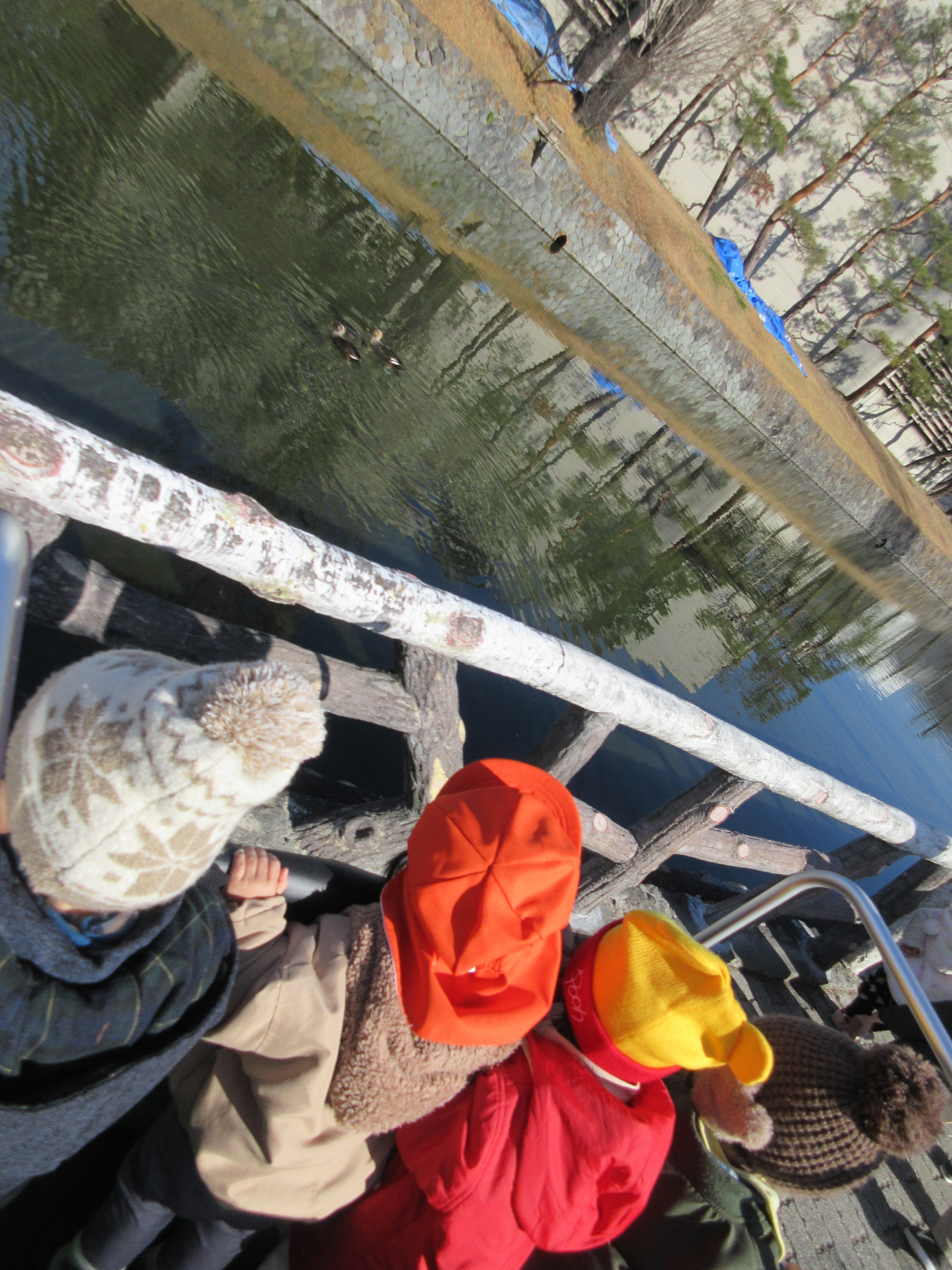 「カモさん泳いでいるよ」と声をかけるとみんなで急いでカモさんを探す子どもたち。