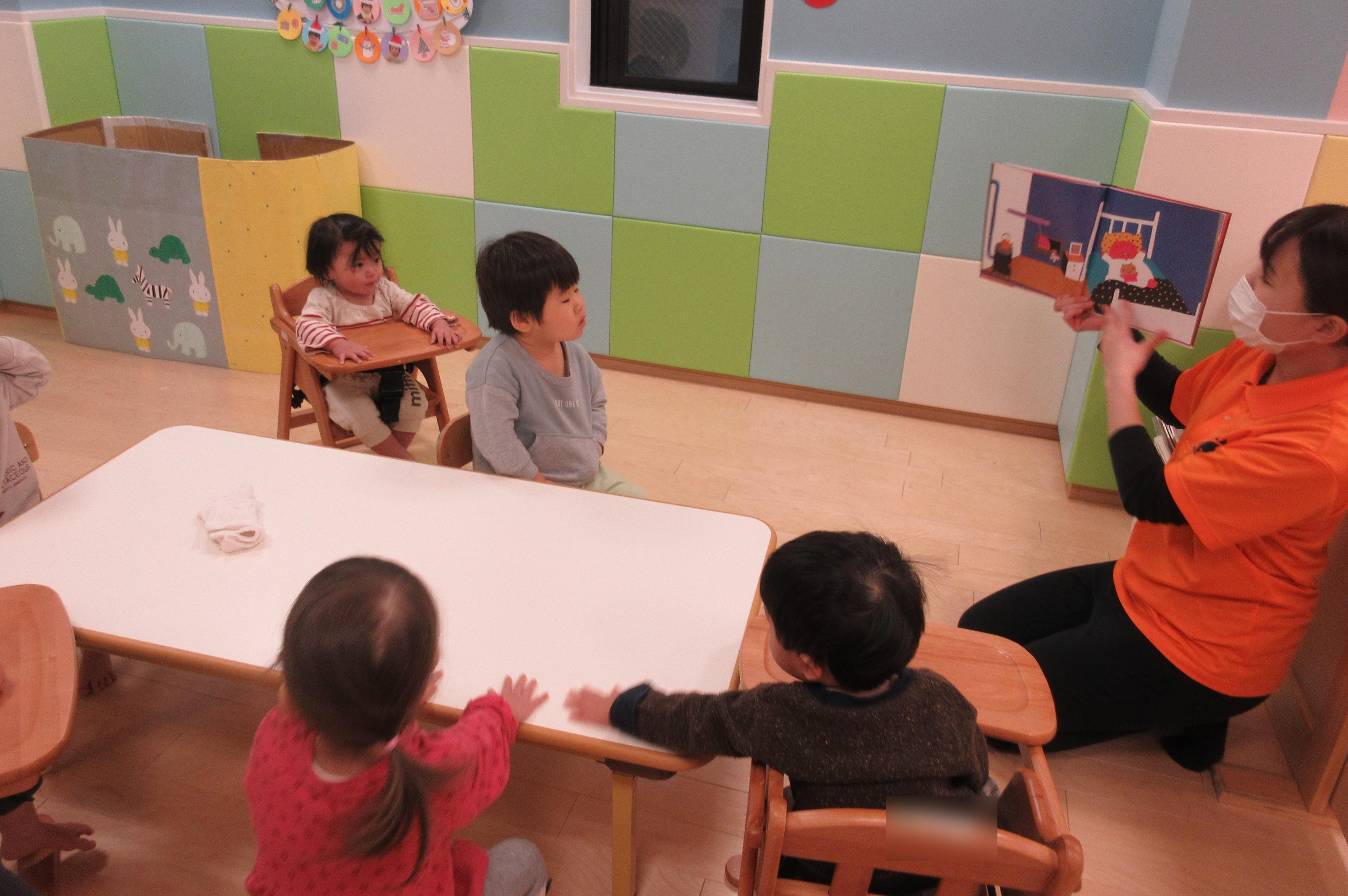 窓に穴があいているしかけ絵本のため、子どもたちは集中して見ていました![]()
