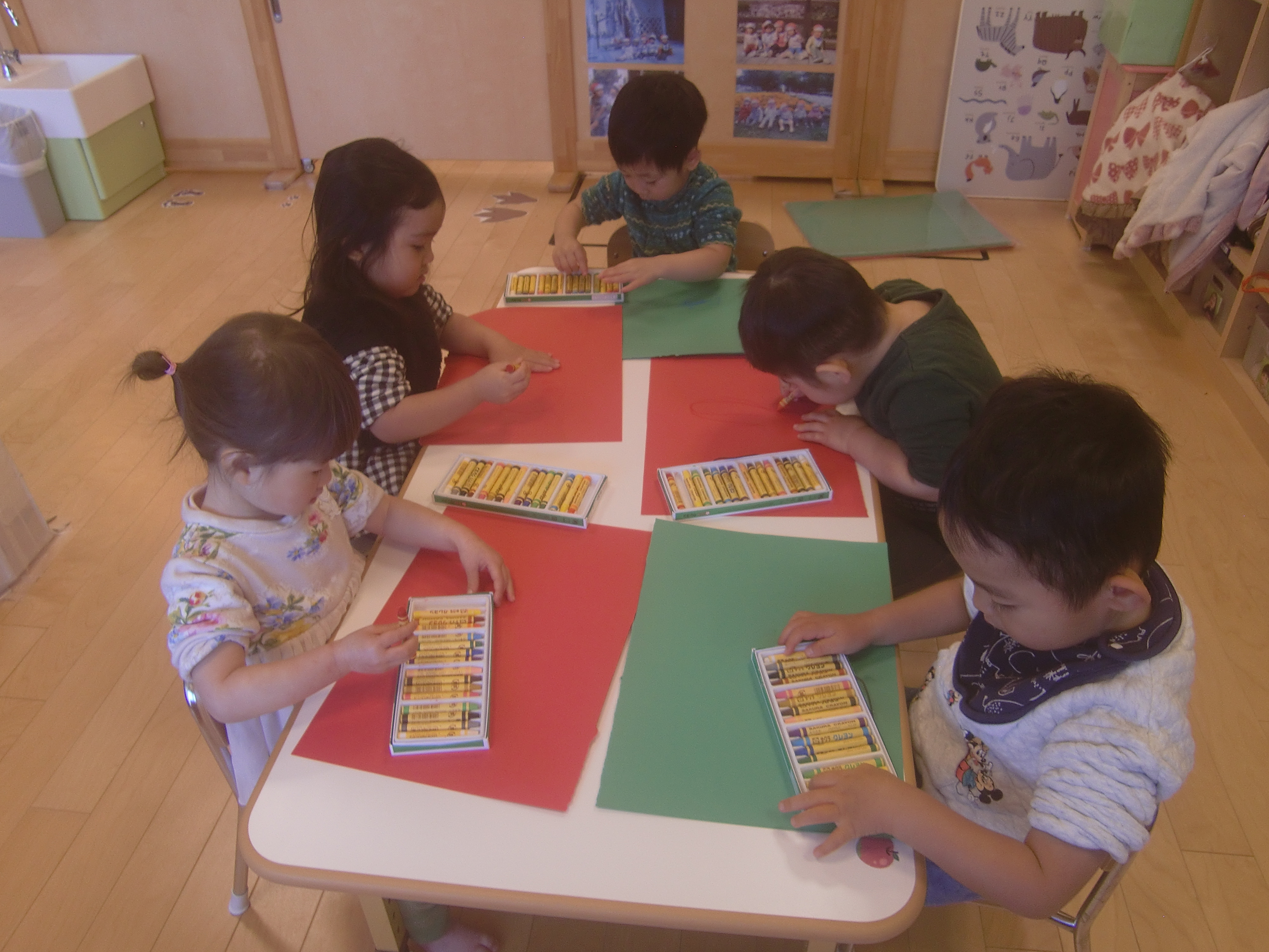 画用紙を用意していると「赤がいい!」「緑にする!」とたくさんの声が聞こえてきます
