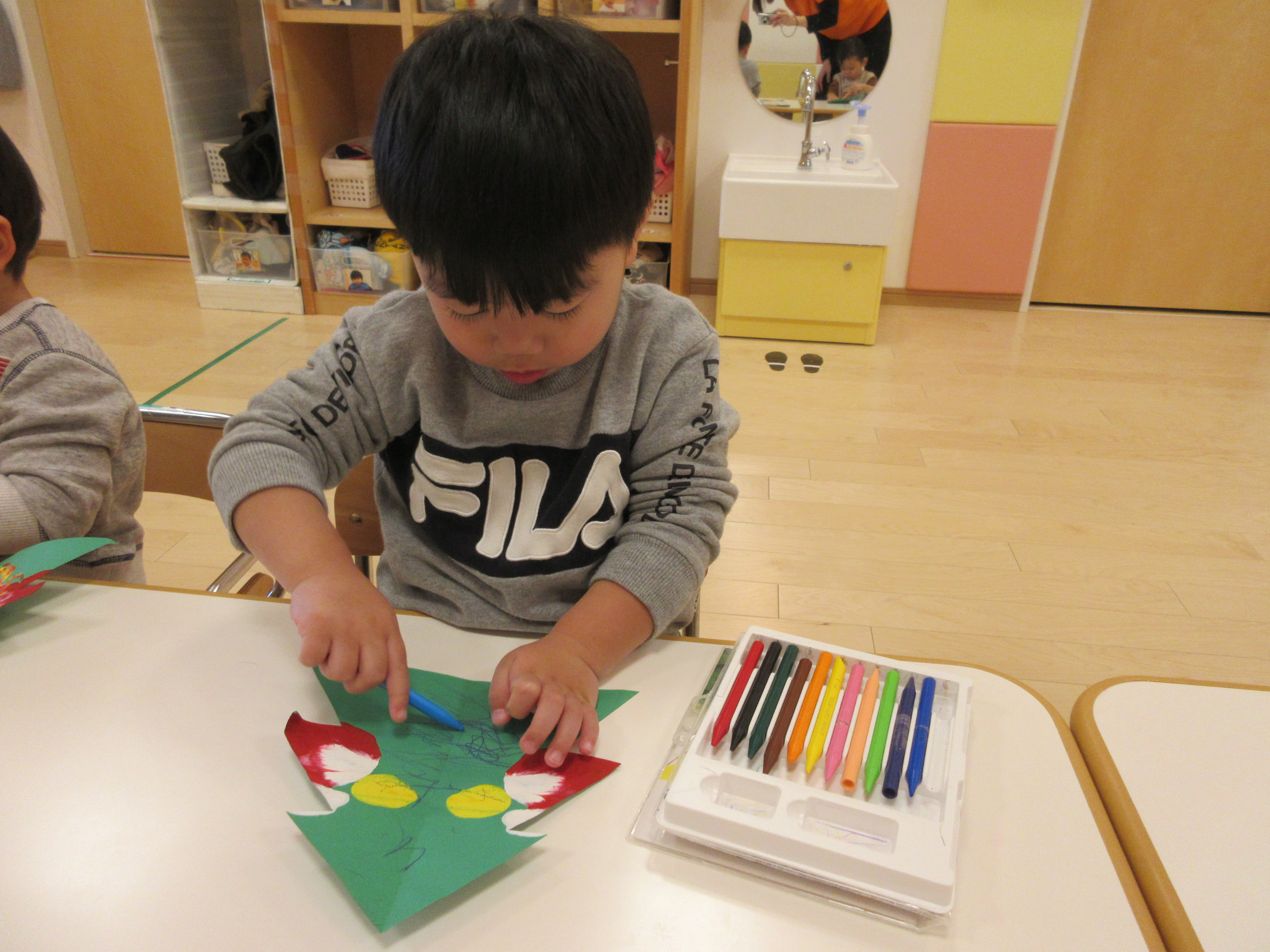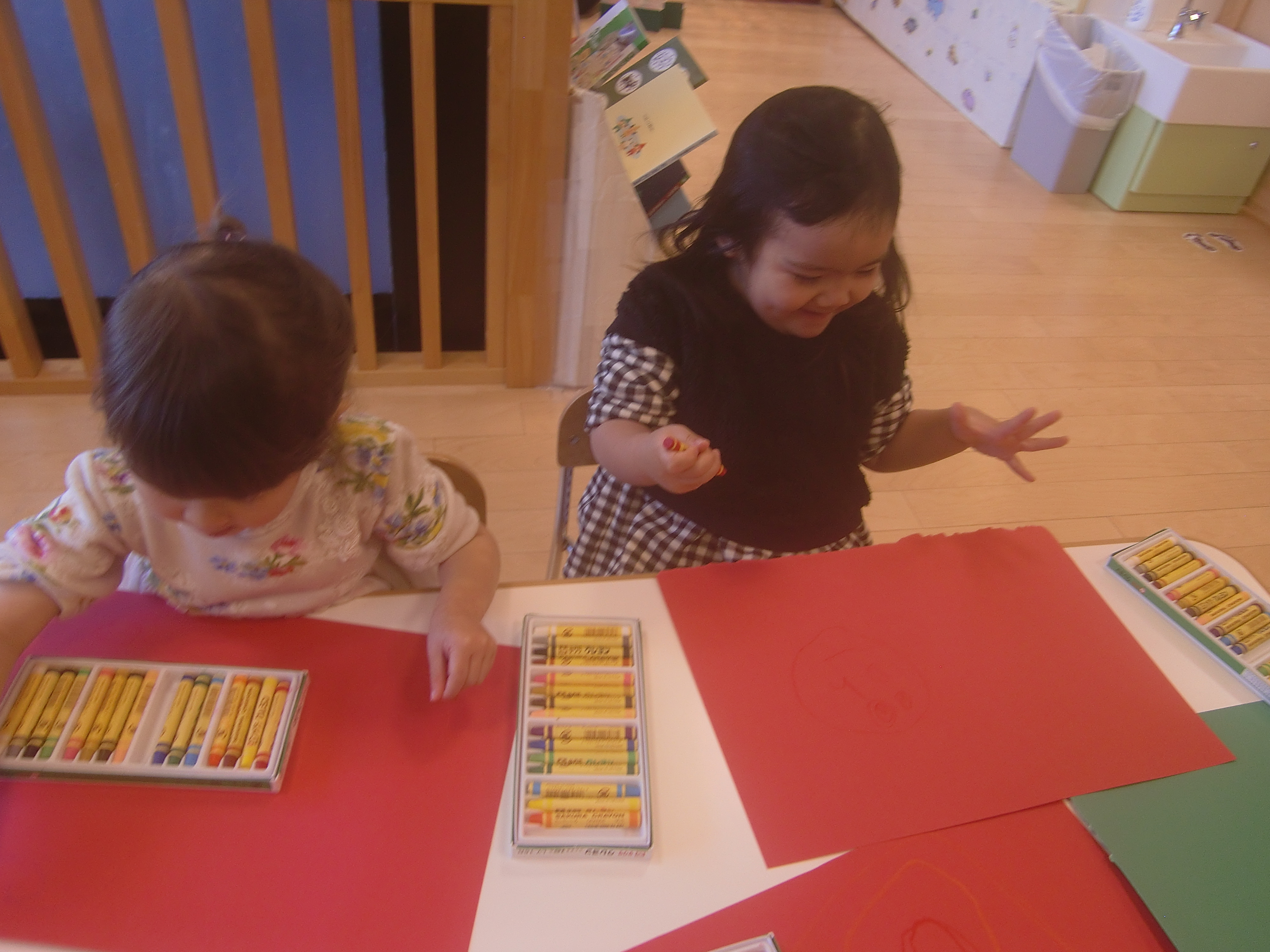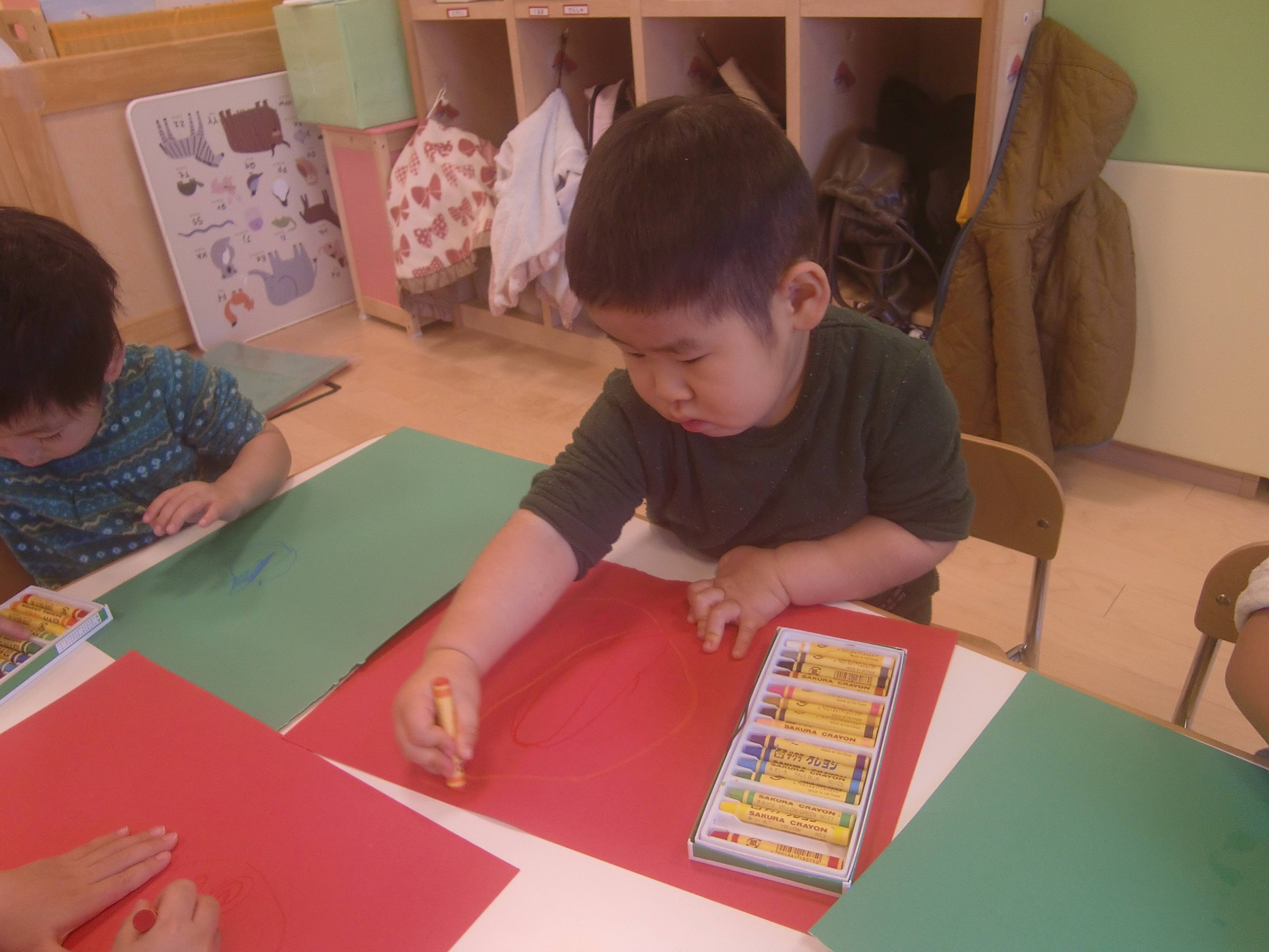 今回は、22日(木)にクリスマス会があったり、土・日はクリスマス本番ということで、クリスマスカラーの画用紙にクレヨンでお絵かきをしました