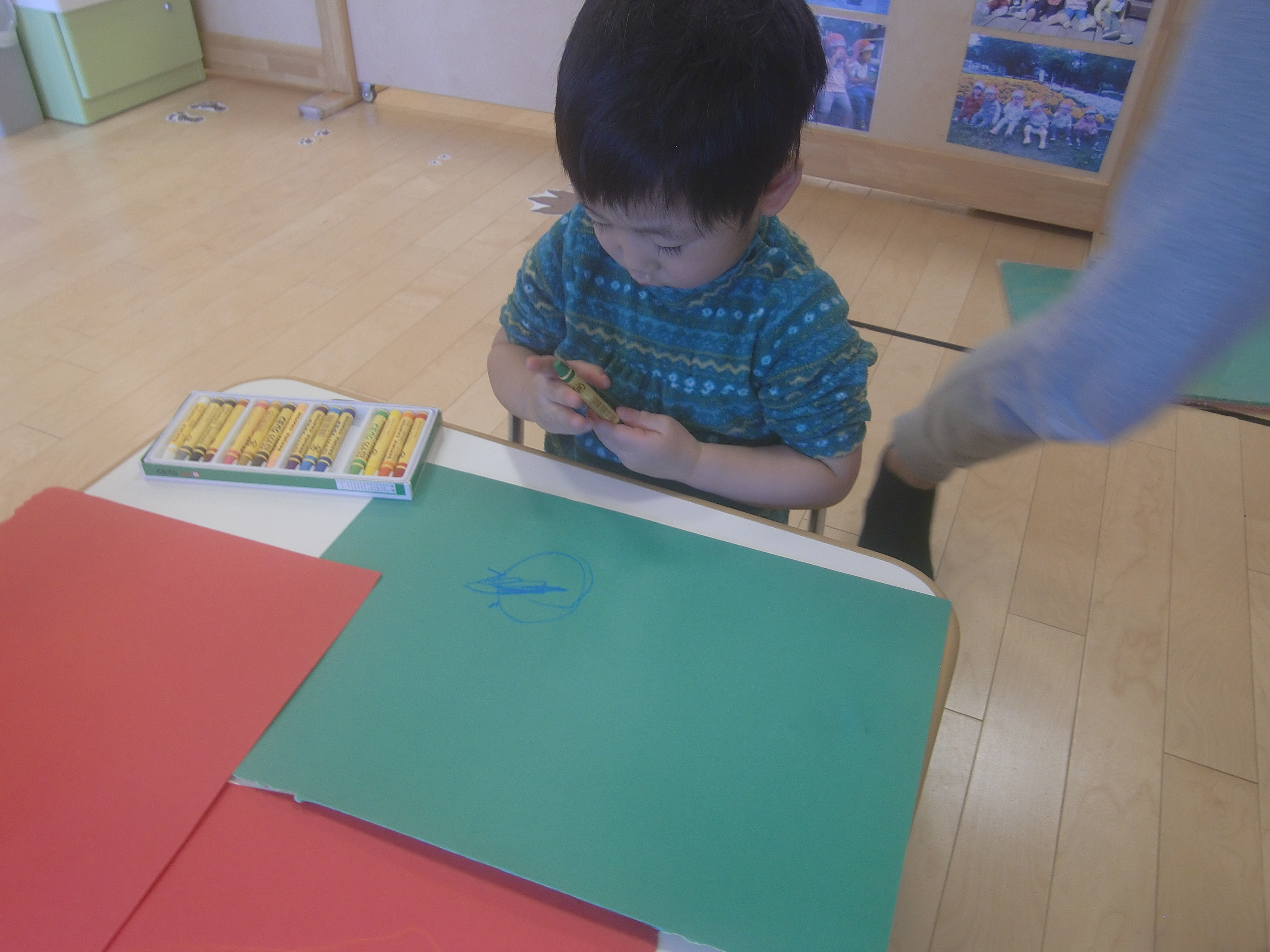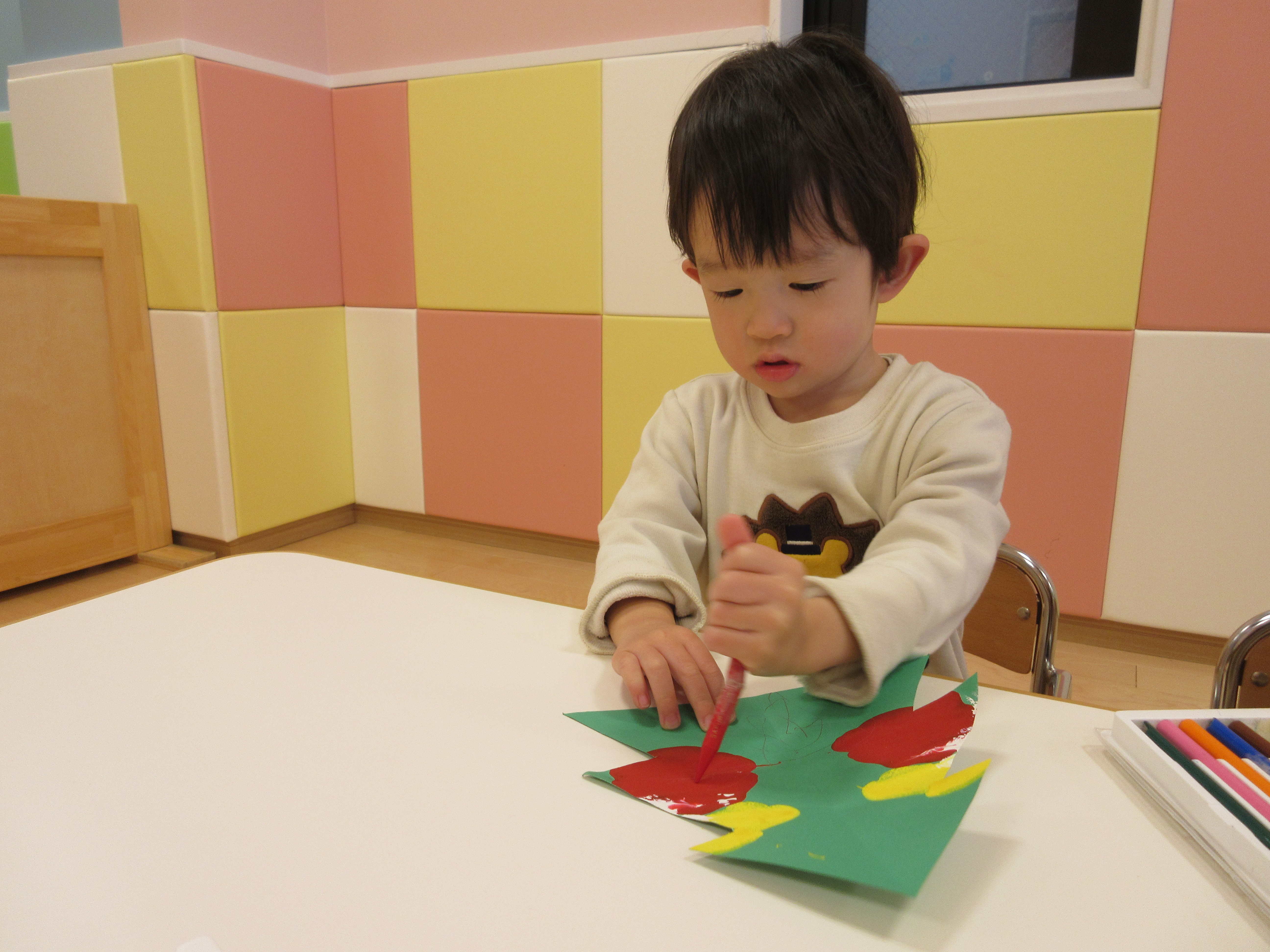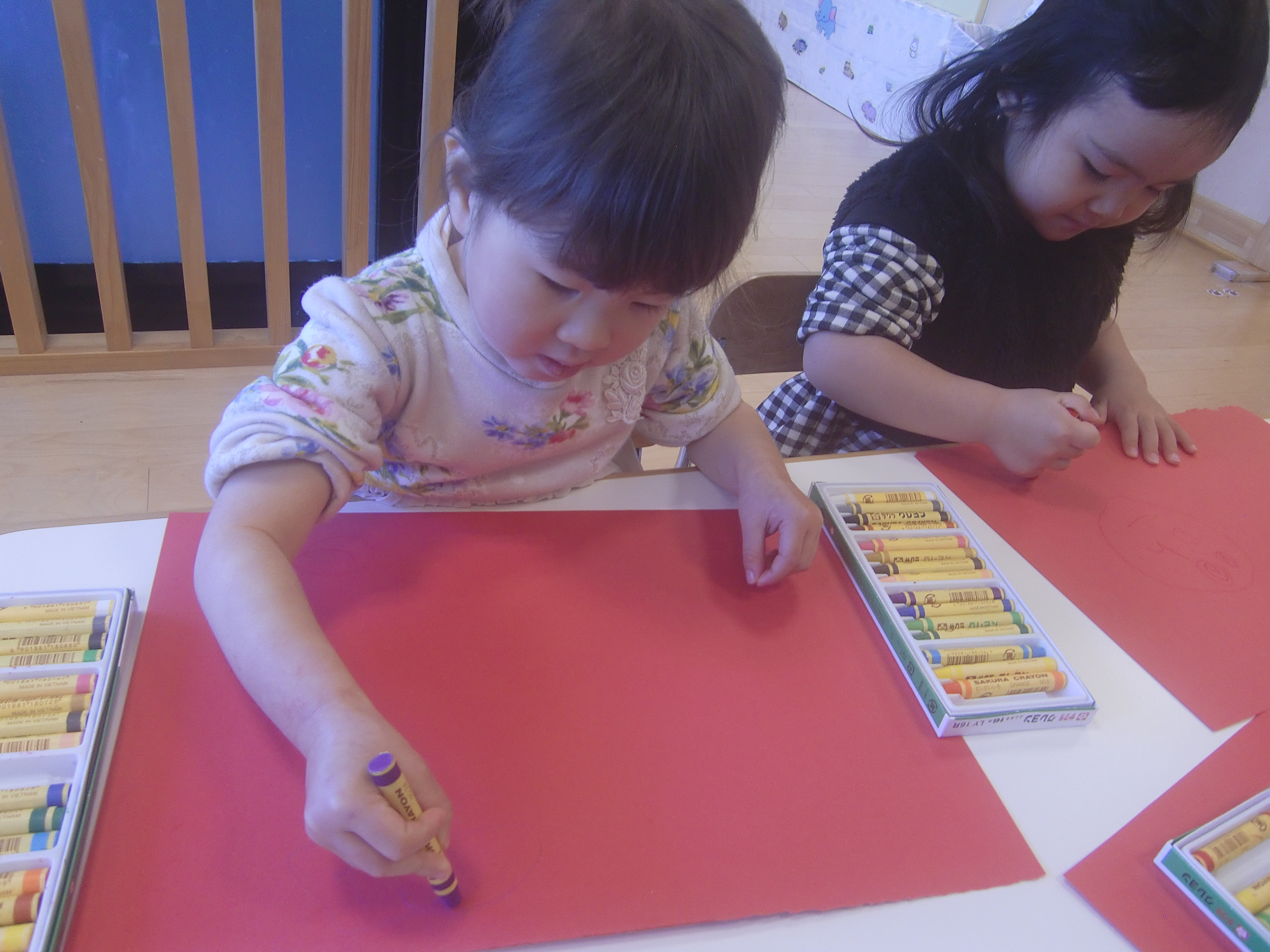 今回は、22日(木)にクリスマス会があったり、土・日はクリスマス本番ということで、クリスマスカラーの画用紙にクレヨンでお絵かきをしました