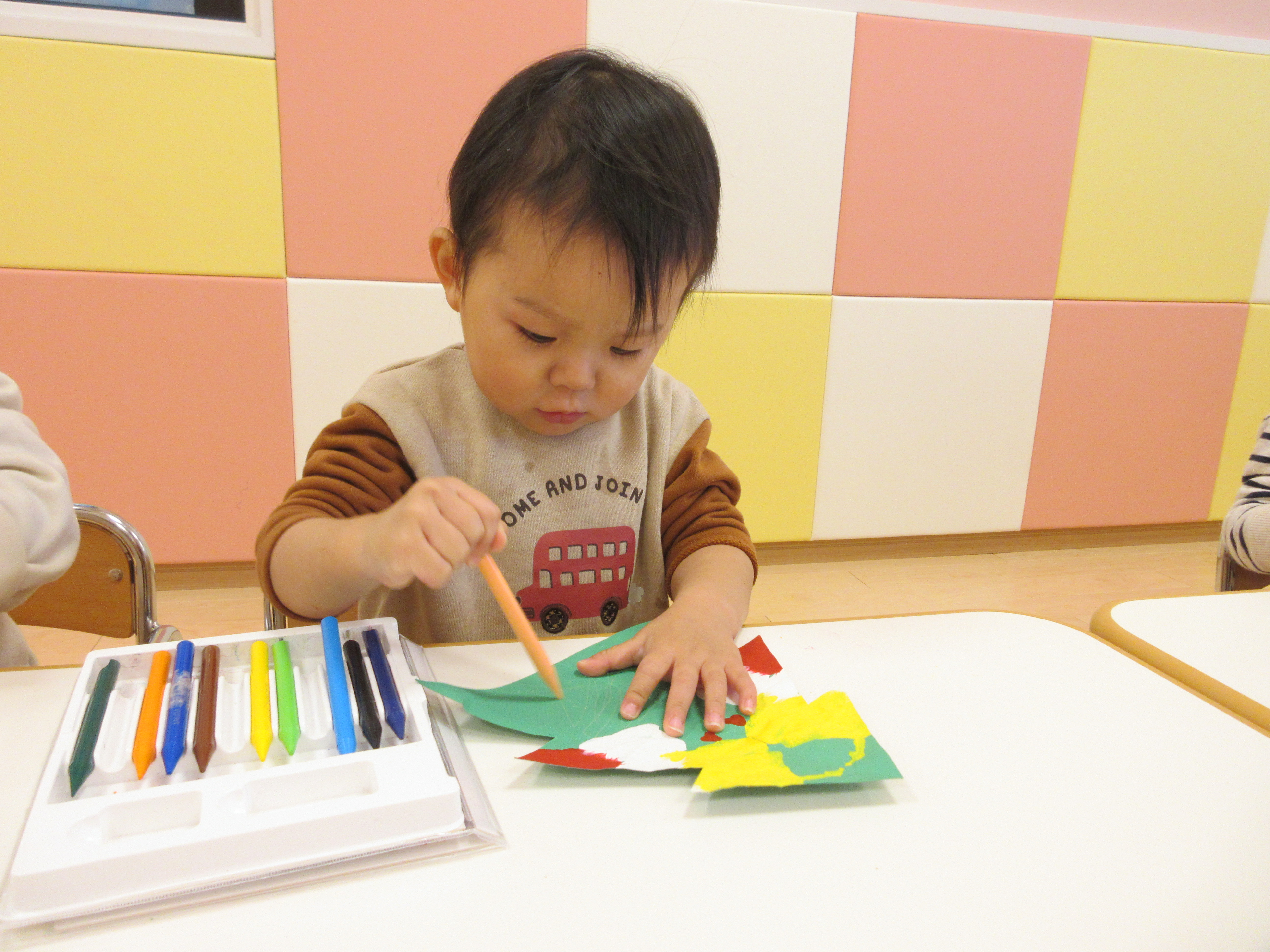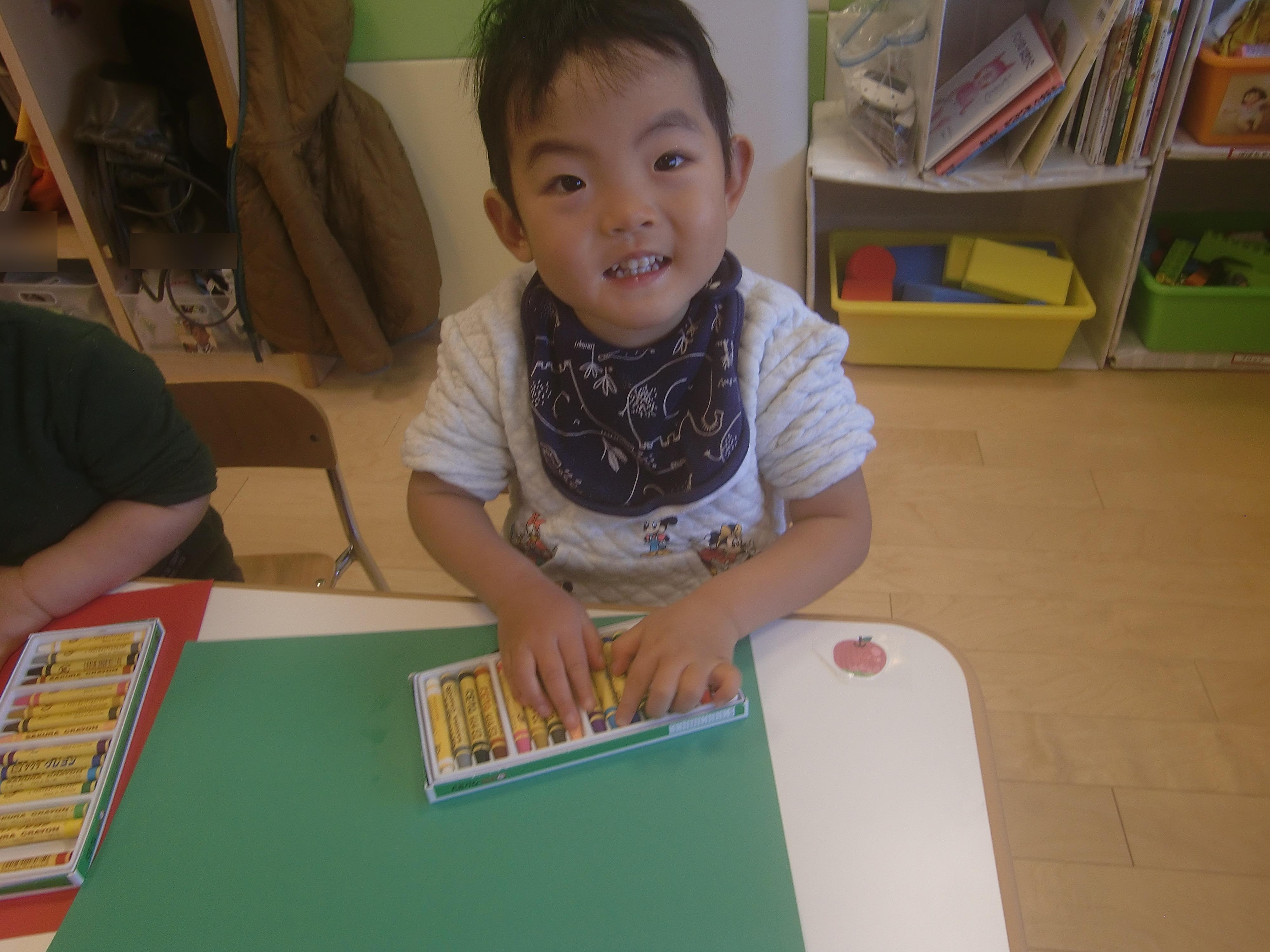 ⇩たくさんのクレヨンから何色にしようかな・・・と選んでいると、カメラに気が付いて見上げていました。