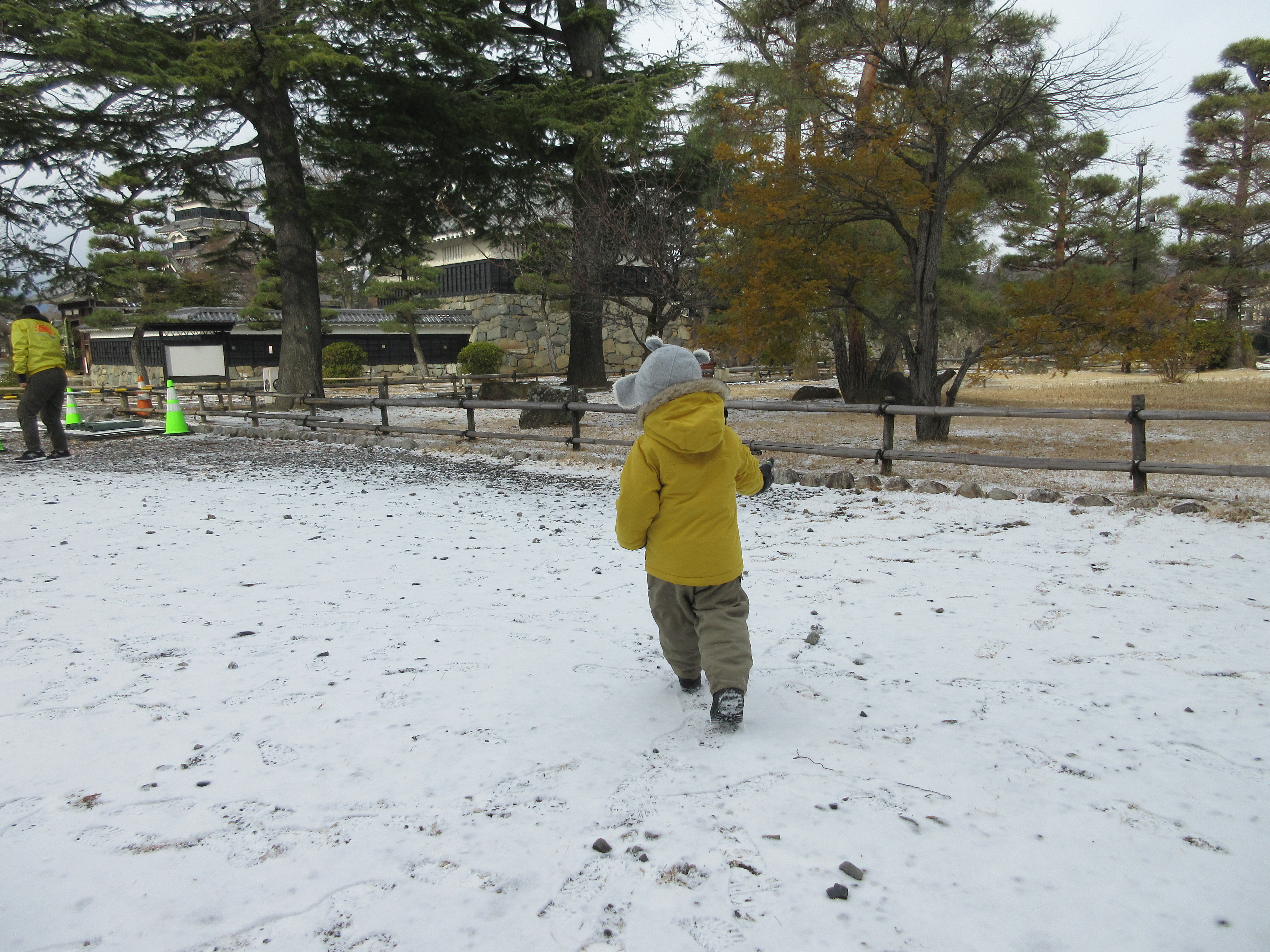 金曜日には今年初めて雪が積もっていたので、スノーウェアを着て松本城で雪遊びを少しだけしました