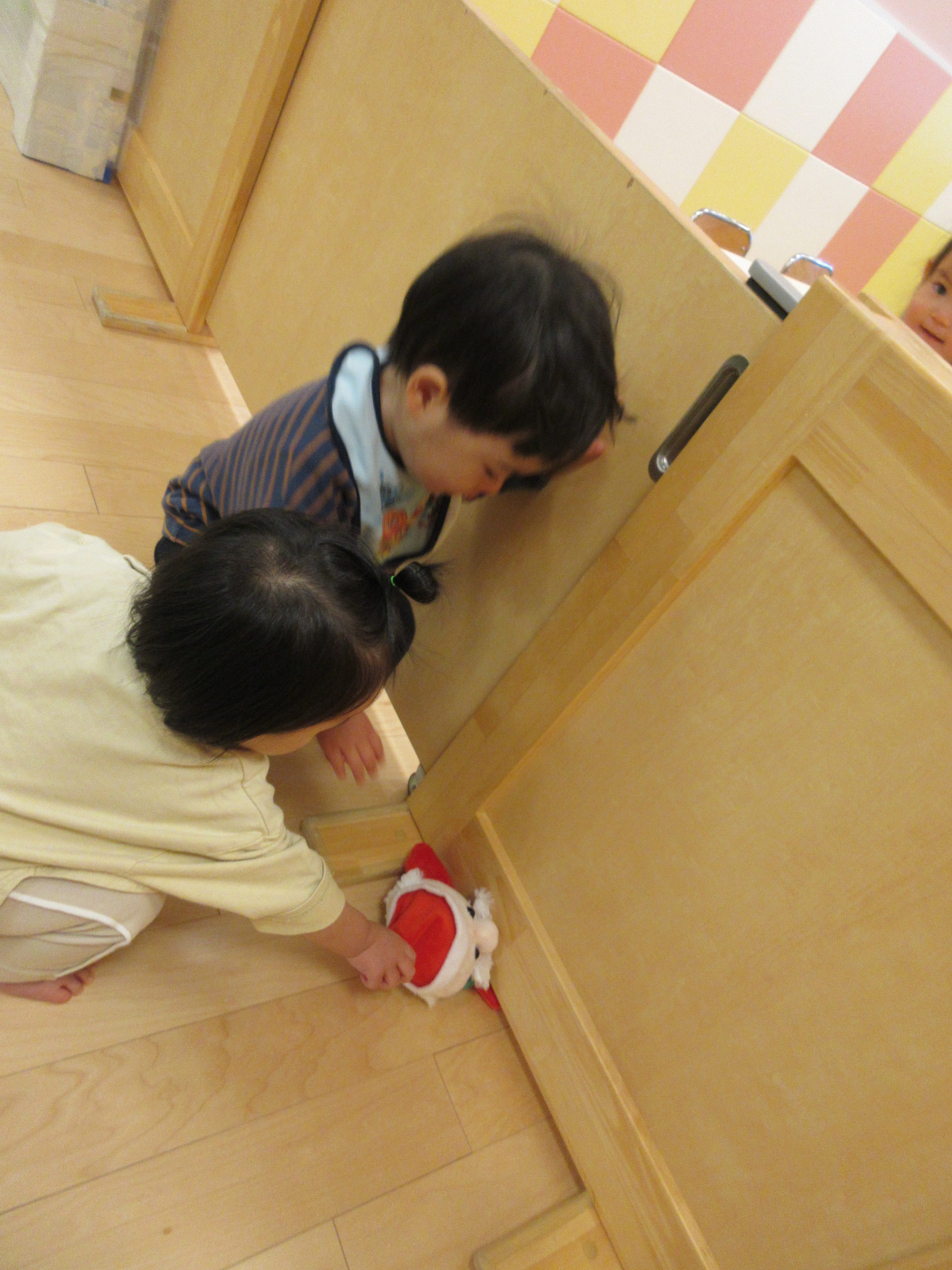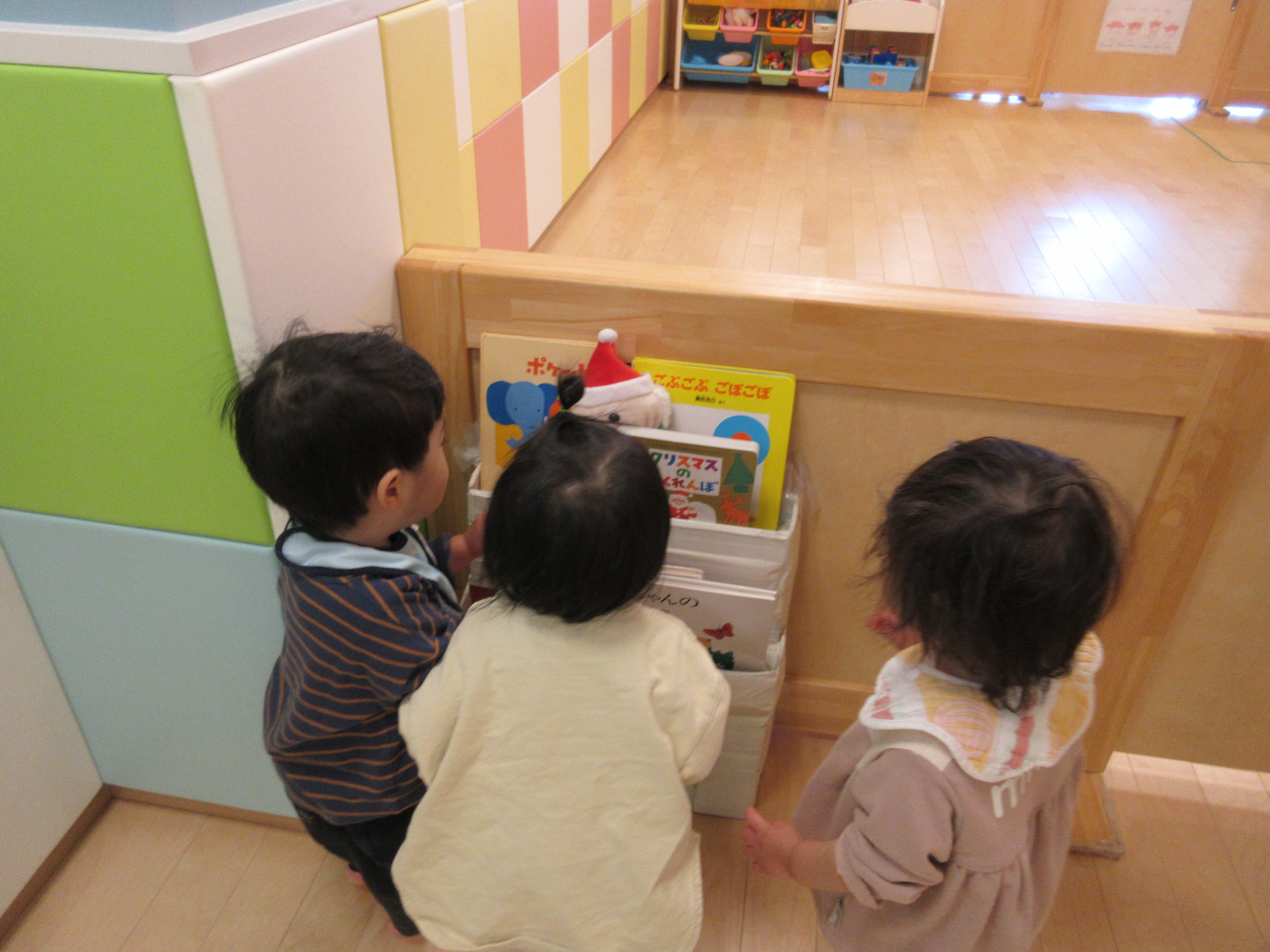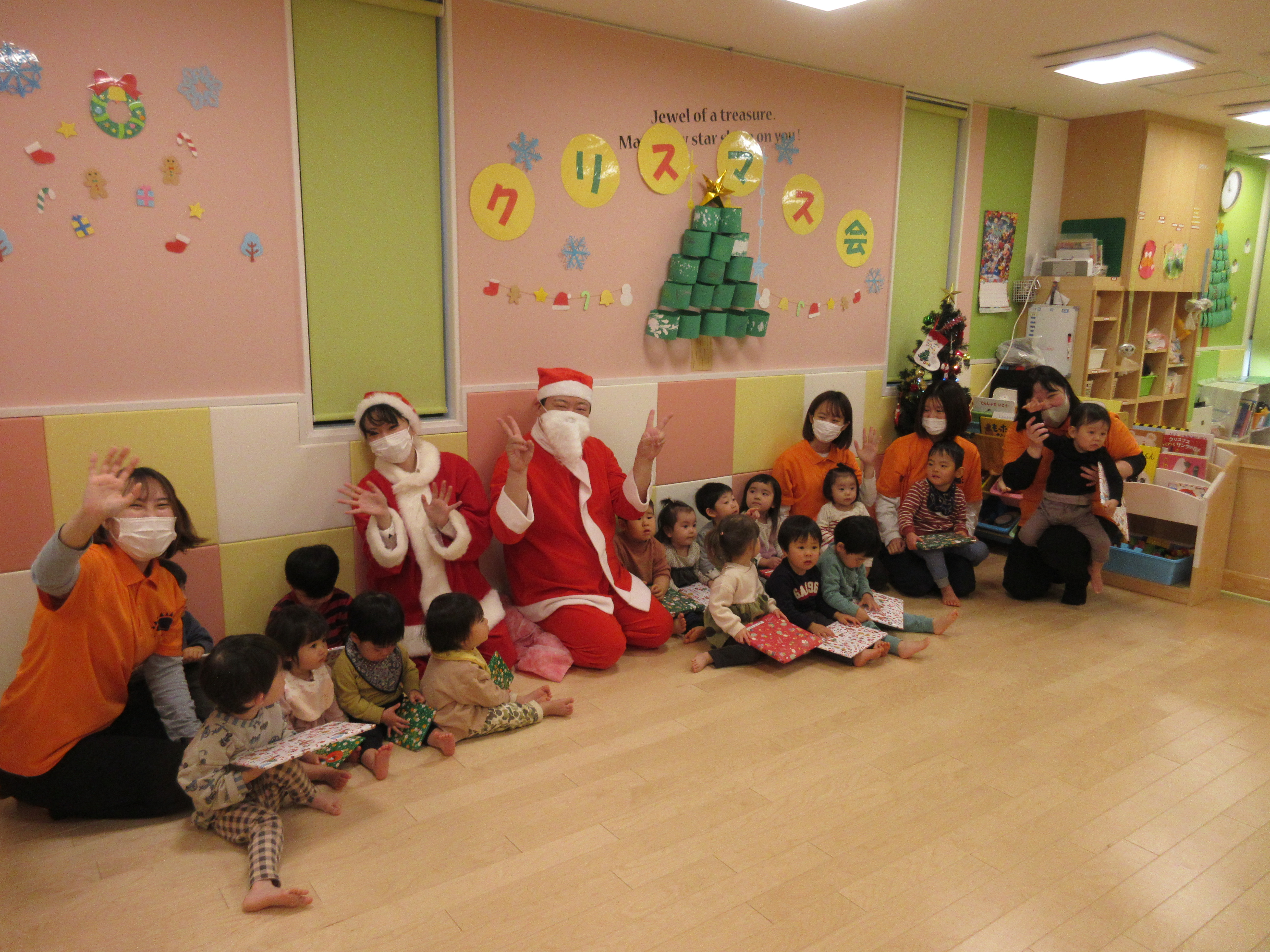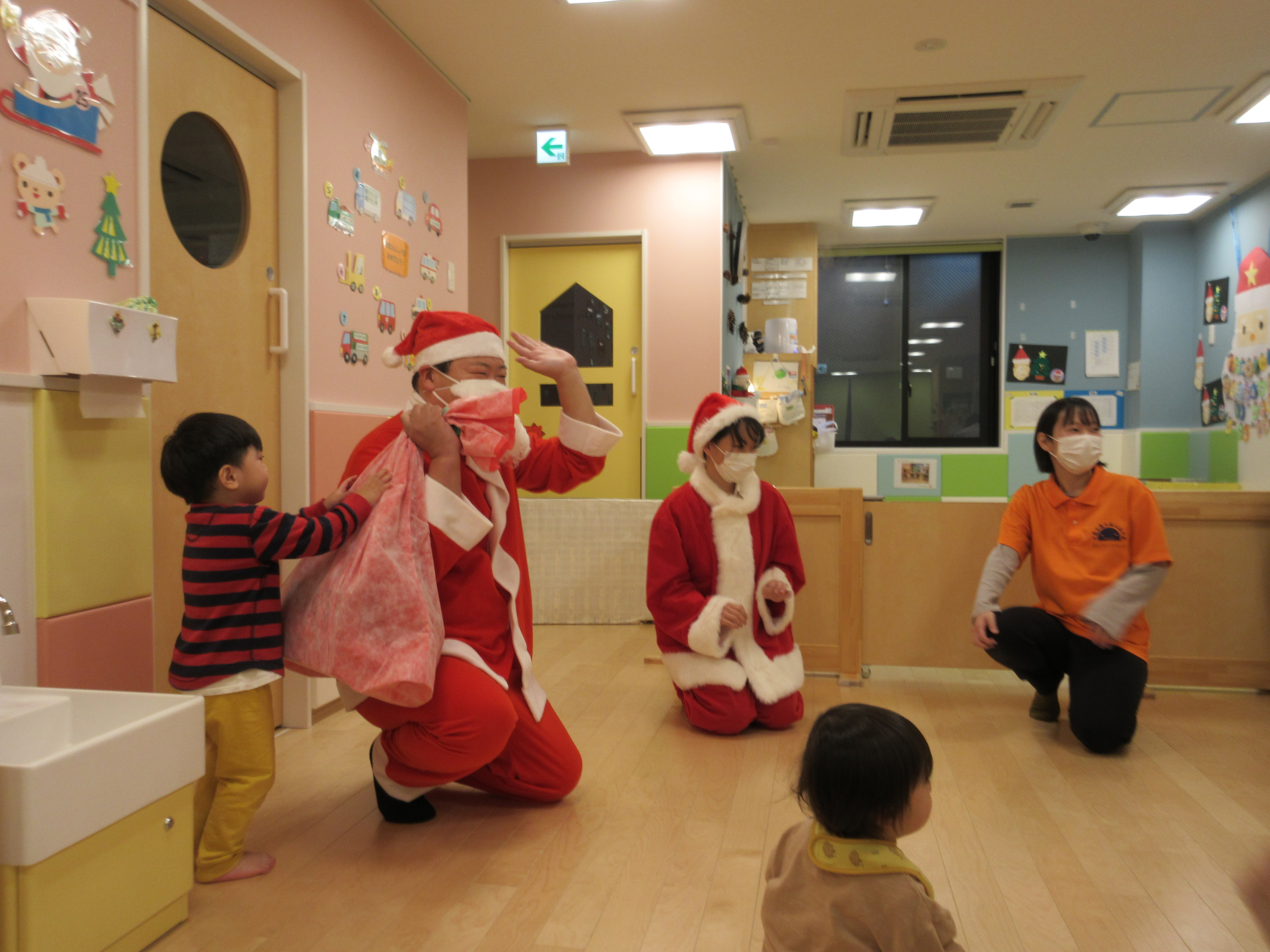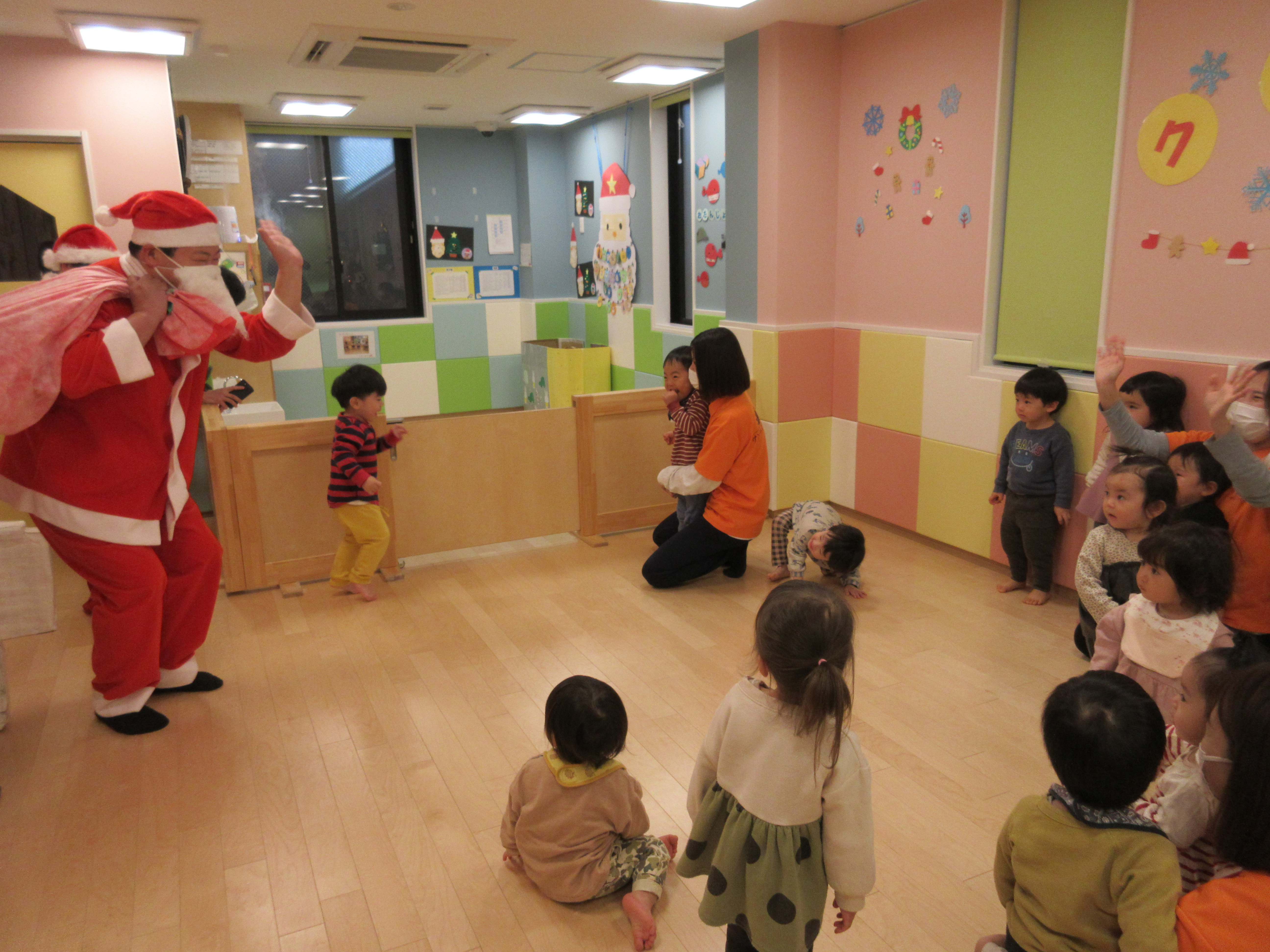 先生が「サンタさんどーこだ?」と声をかけると、急いでサンタさんを探す子どもたち