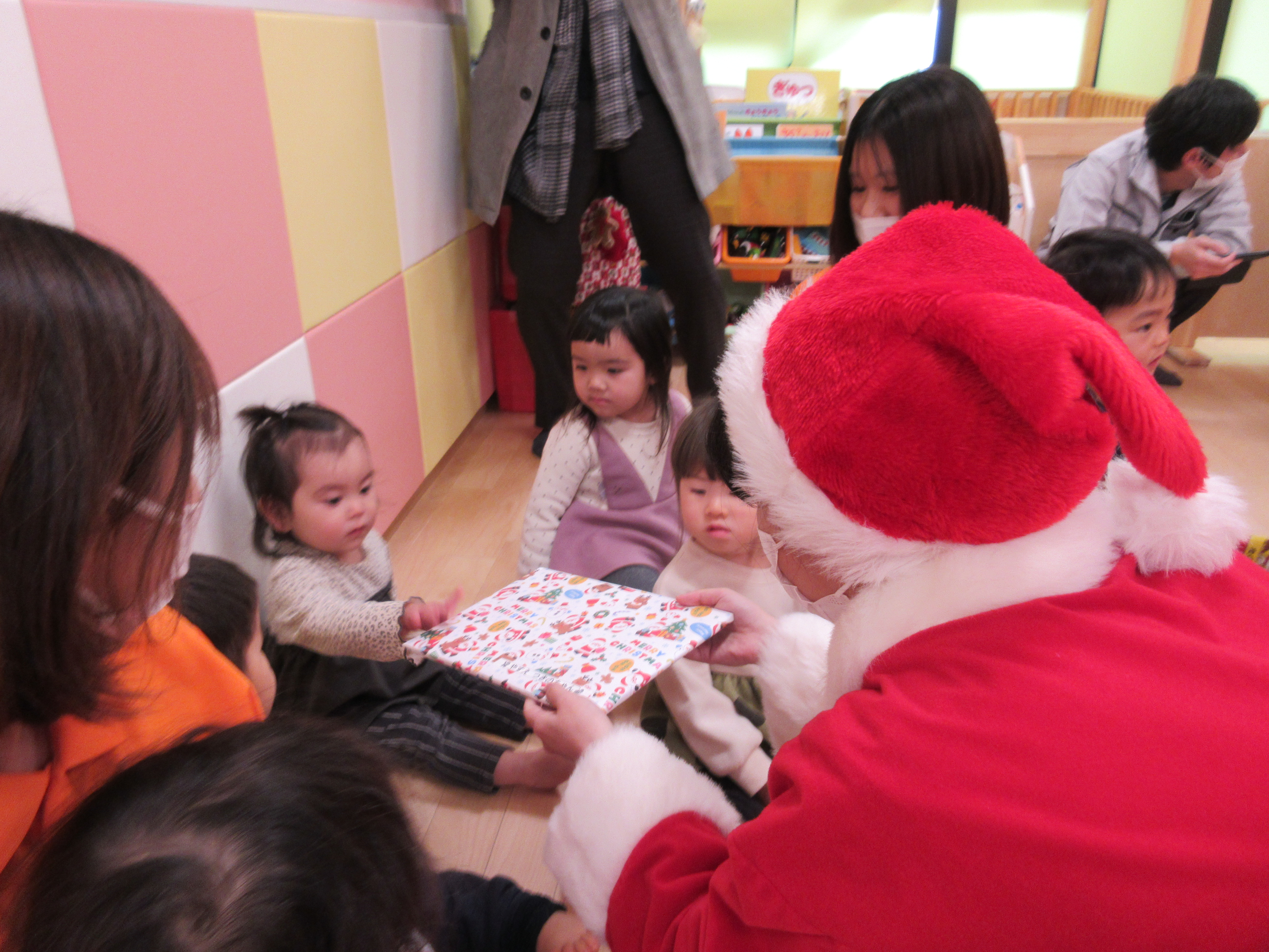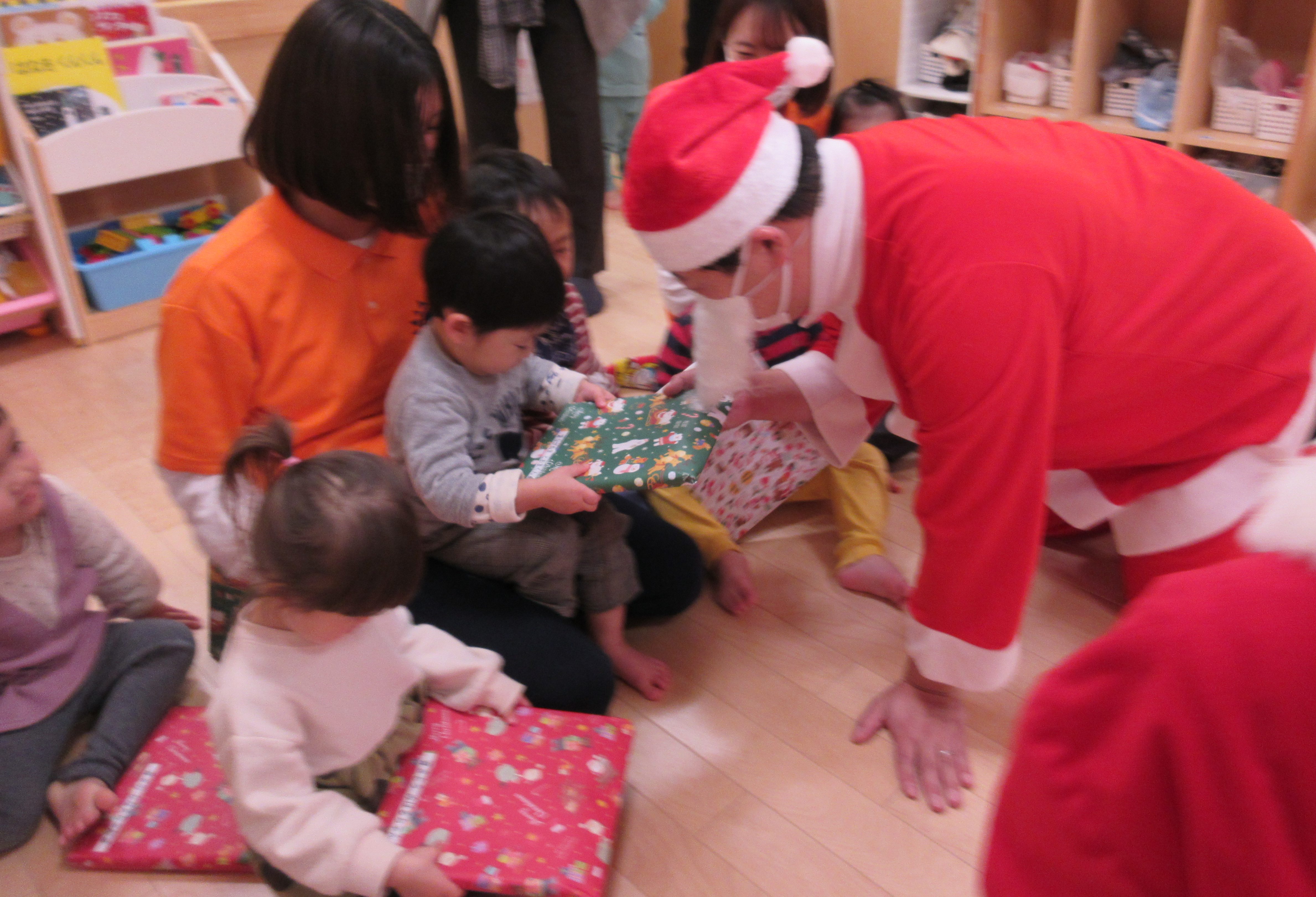 サンタさんの登場に驚いて涙する子や緊張を見せる子、またはサンタさんから距離をとる子・・・と様々な反応を見せてくれた子どもたち。