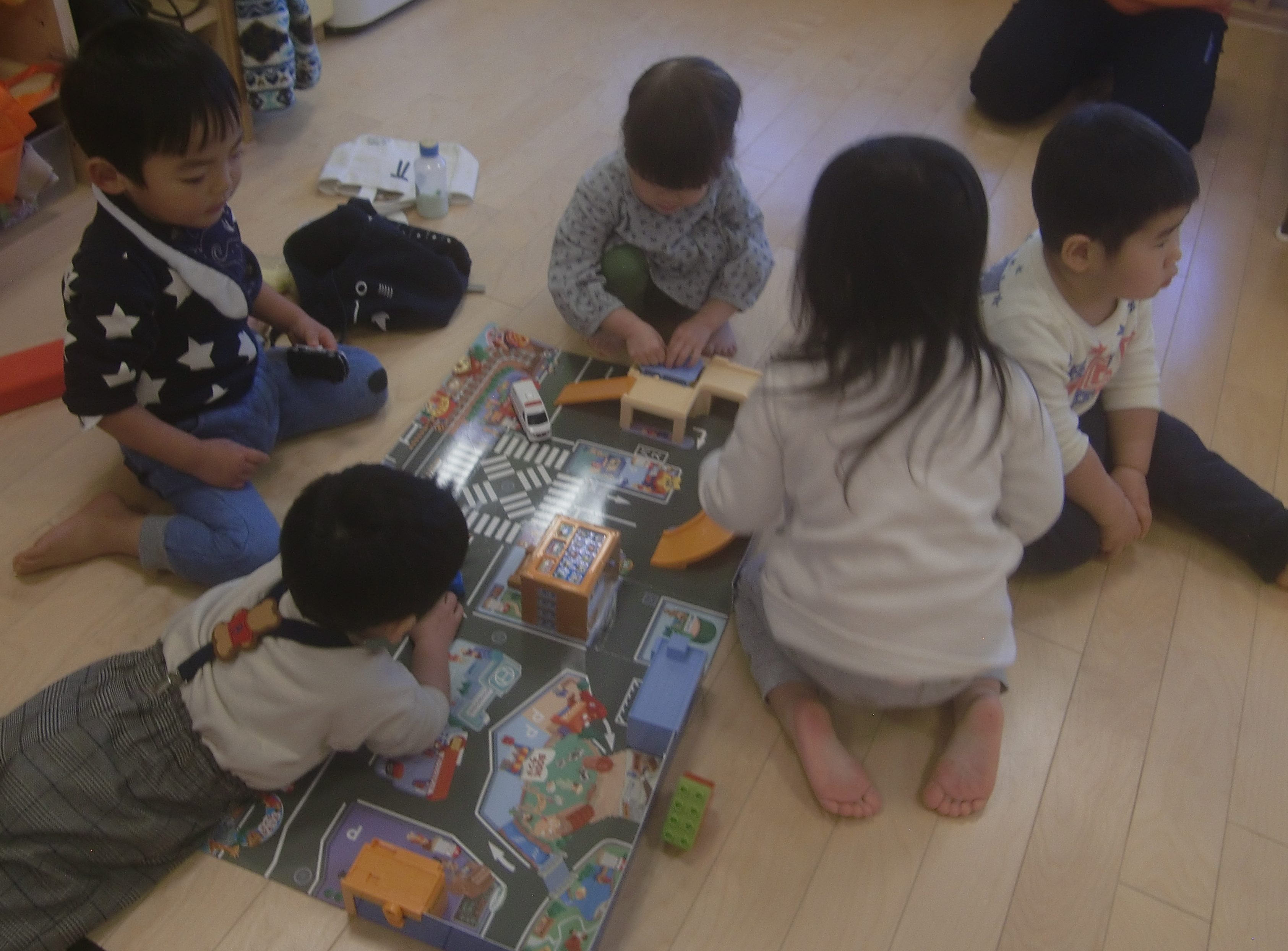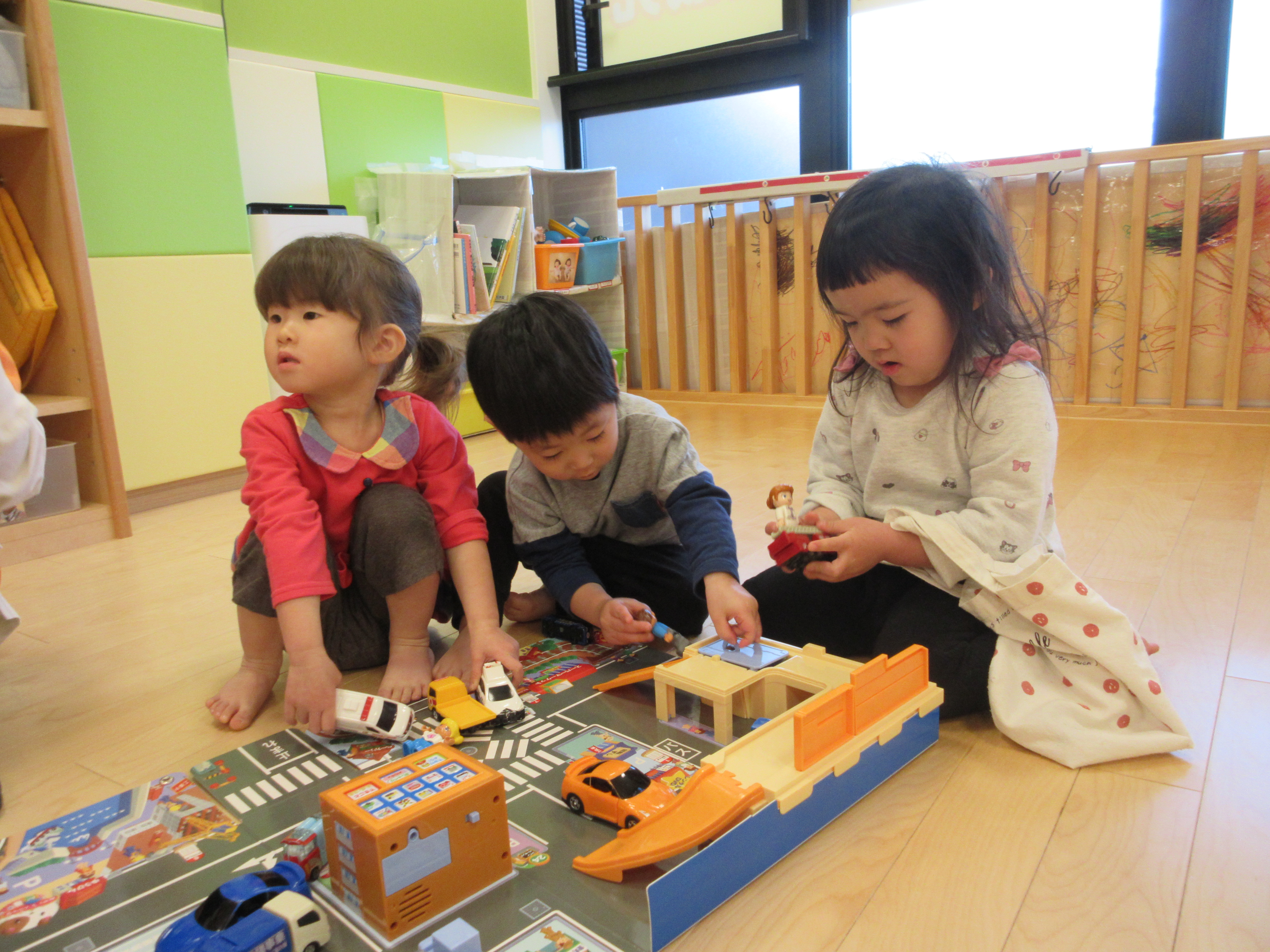 車のおもちゃを持ち寄って、早速遊んでいましたよ。