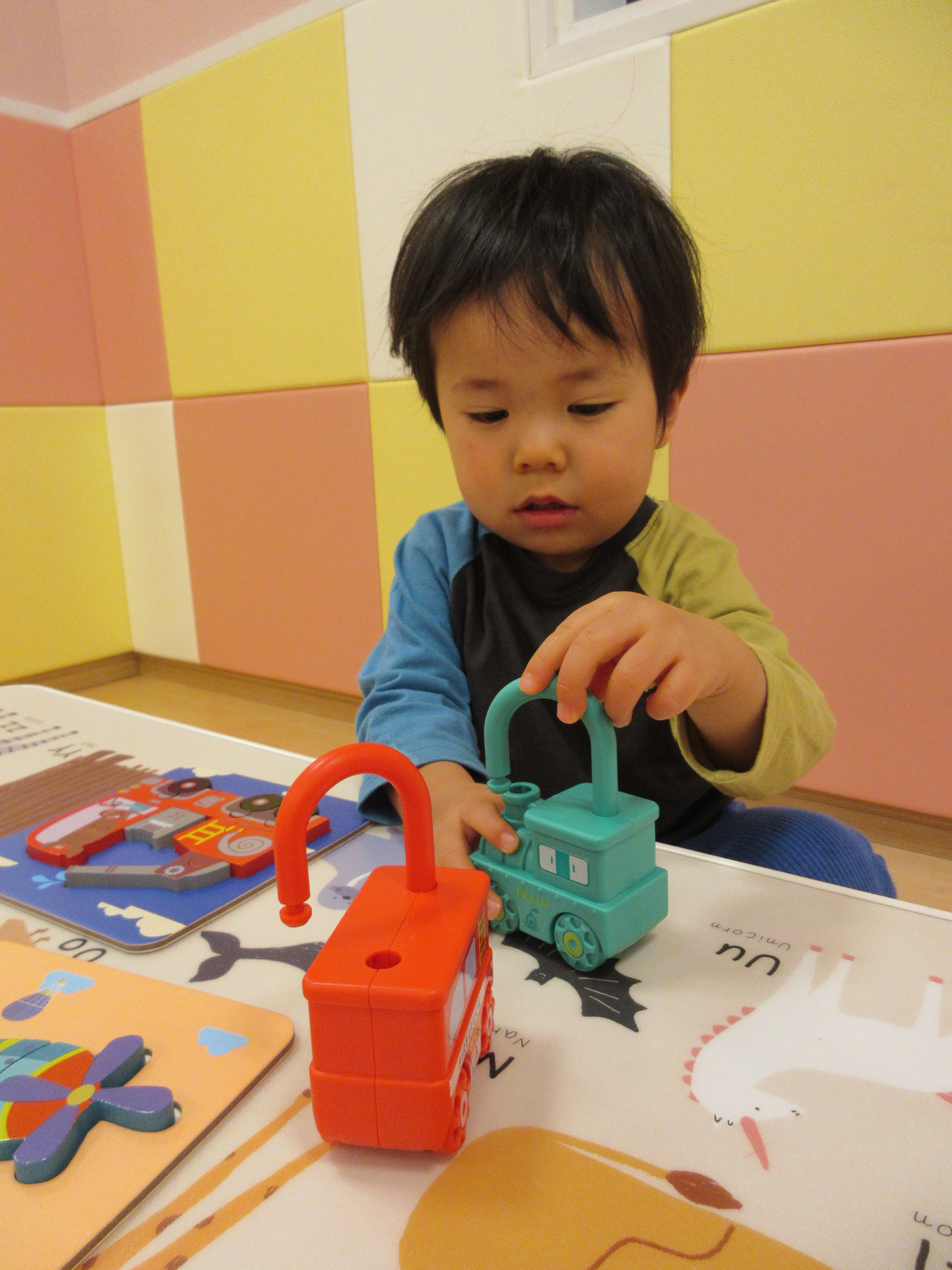 車のおもちゃはいくつかあるカギの中から同じ物を探してカギを回すとロックが取れるようになっています![]()