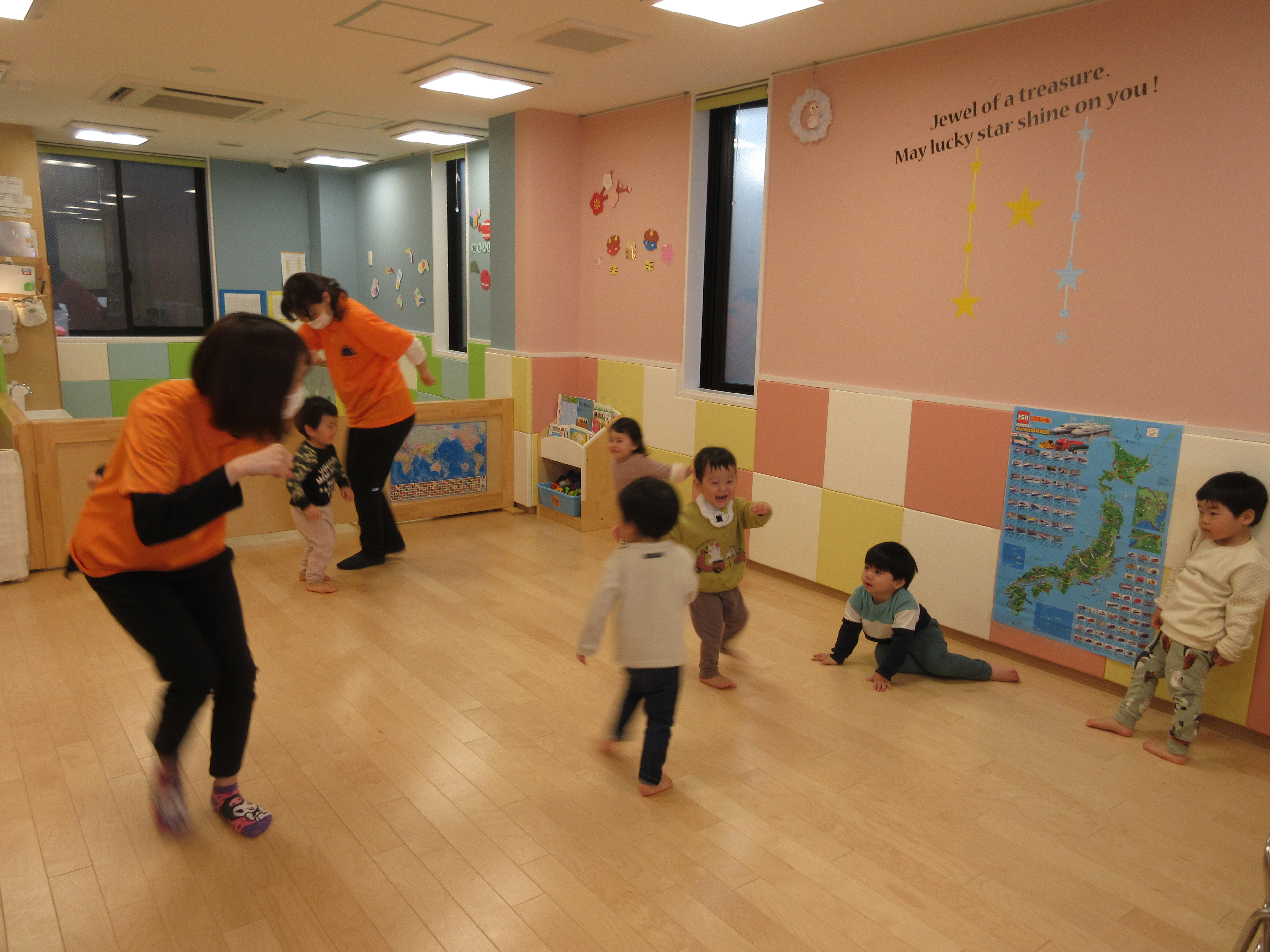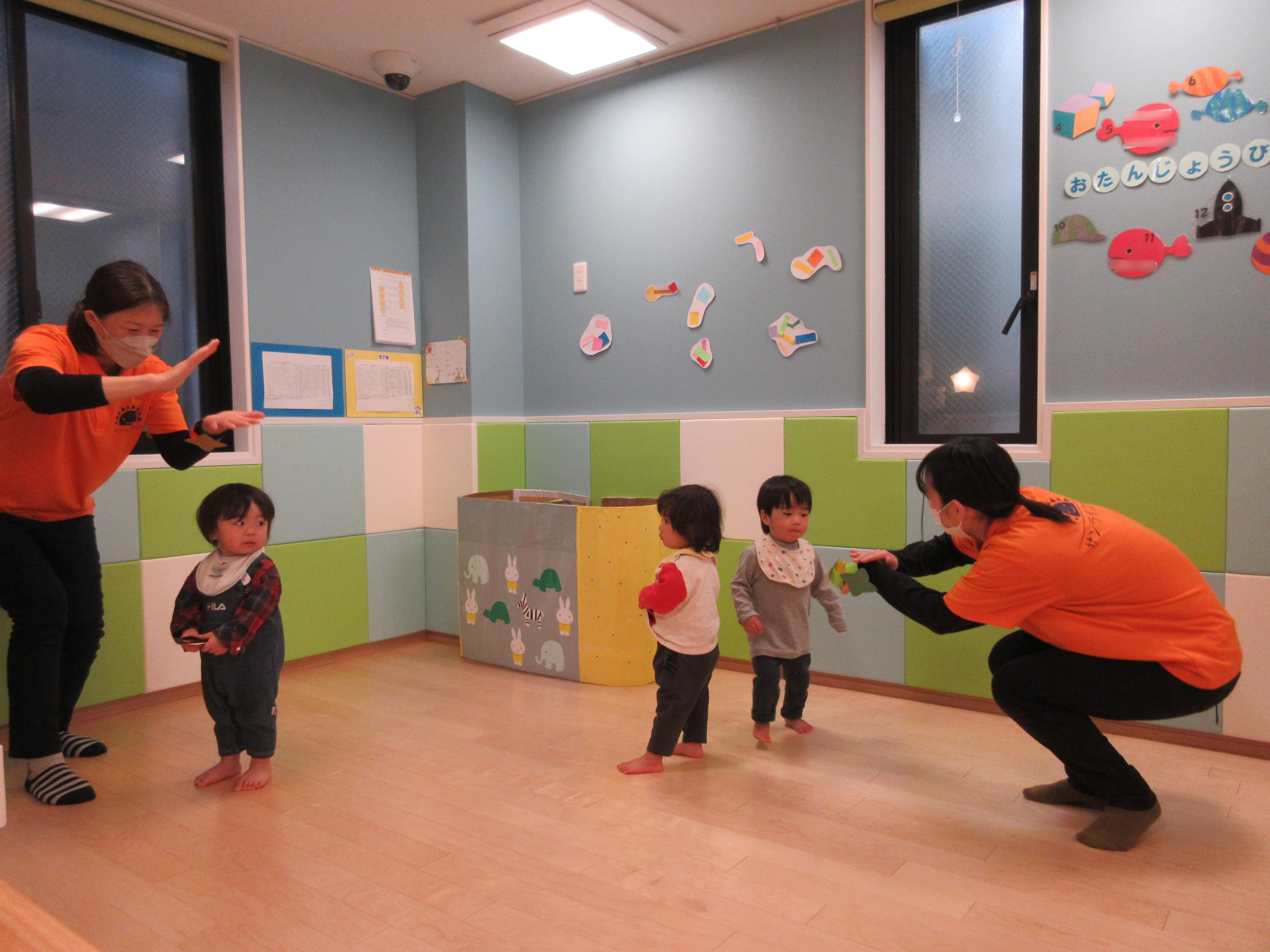 先生たちの動きを見て真似し、部屋の中を活発に動いている子どもたち♪