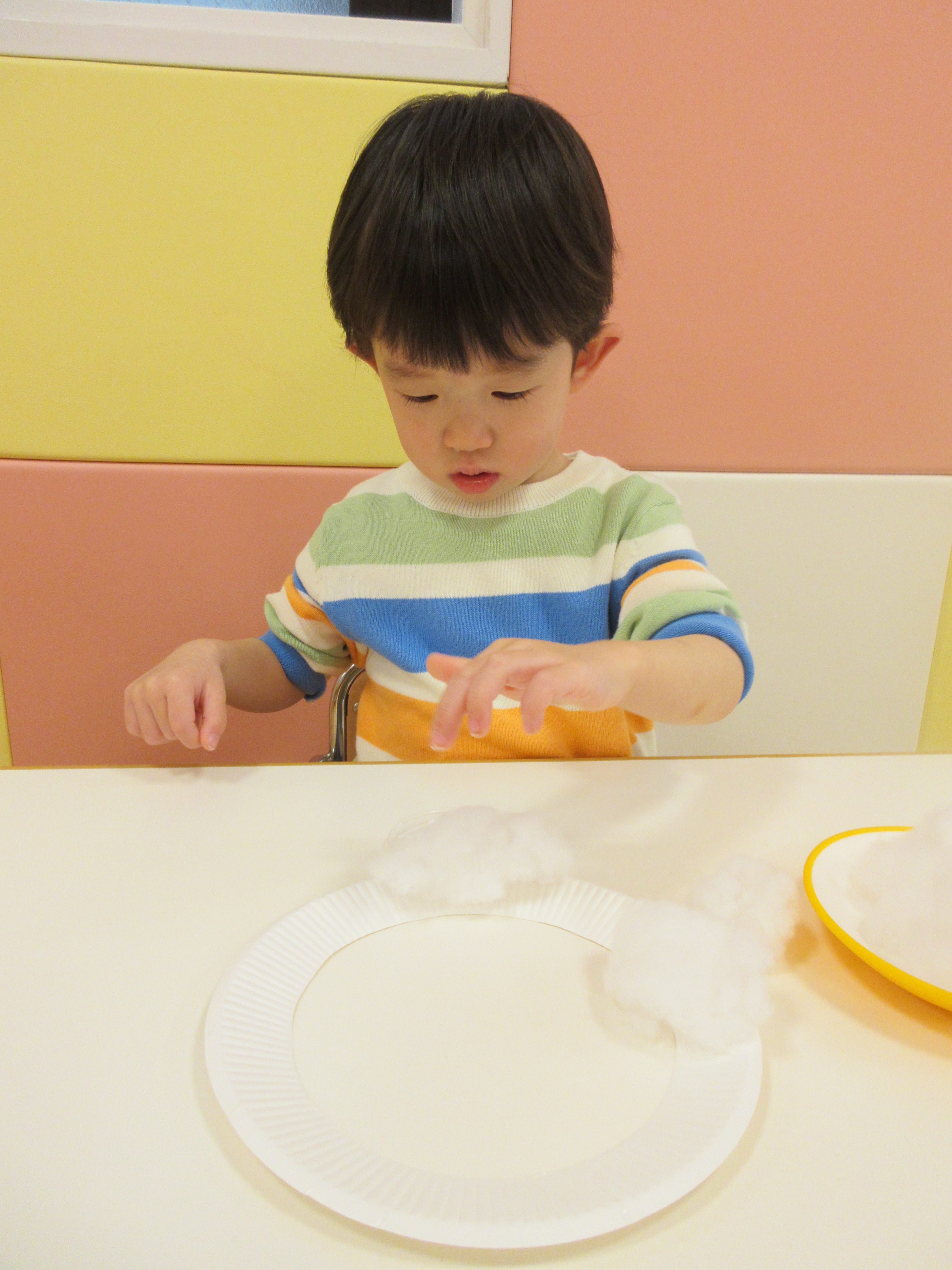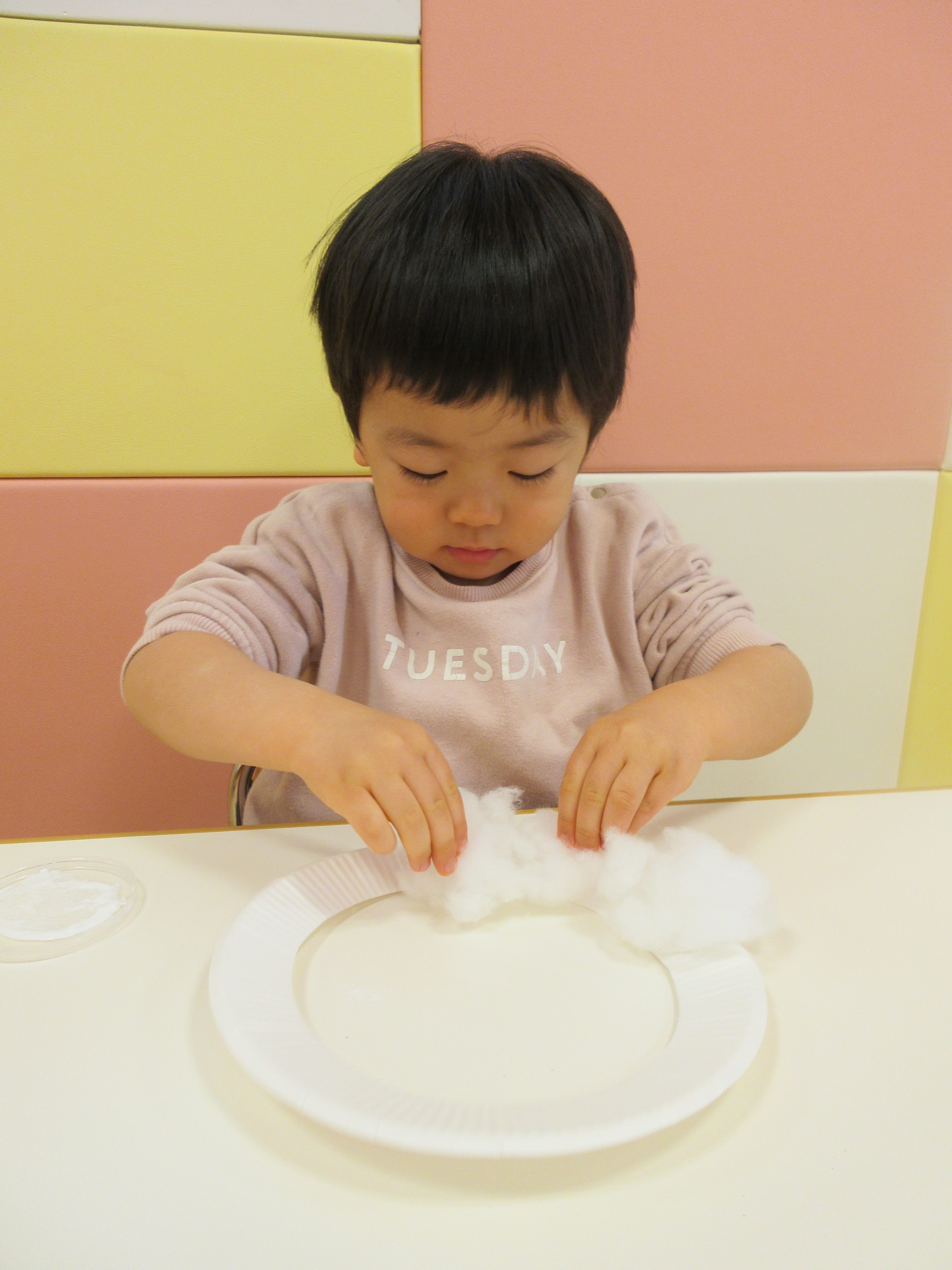 綿をちぎって丸め、丸めた綿をボンドを使って紙皿に貼ります。