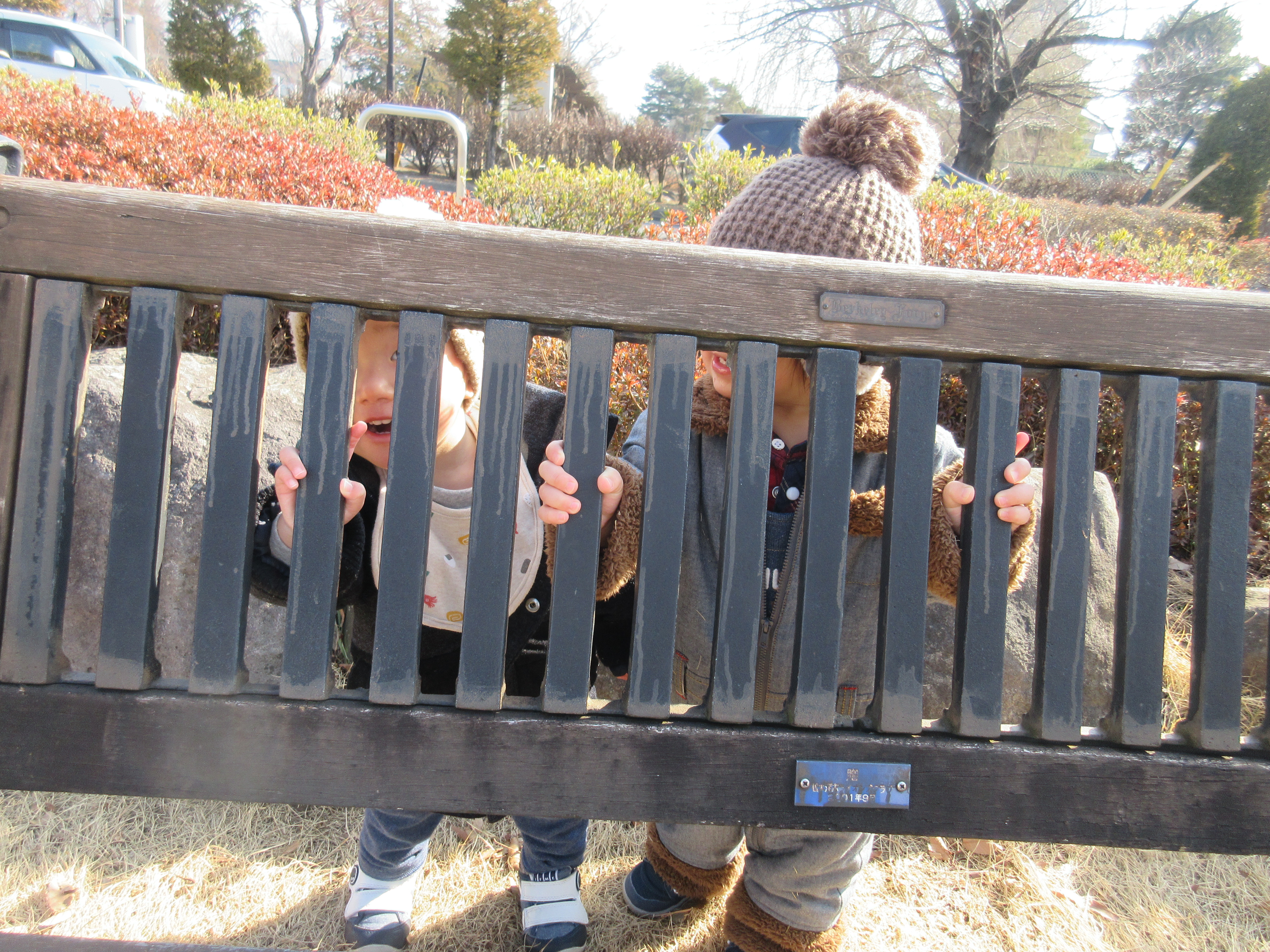 また、ベンチの後ろに隠れてみたりと公園で様々な遊びを楽しむ子どもたち。