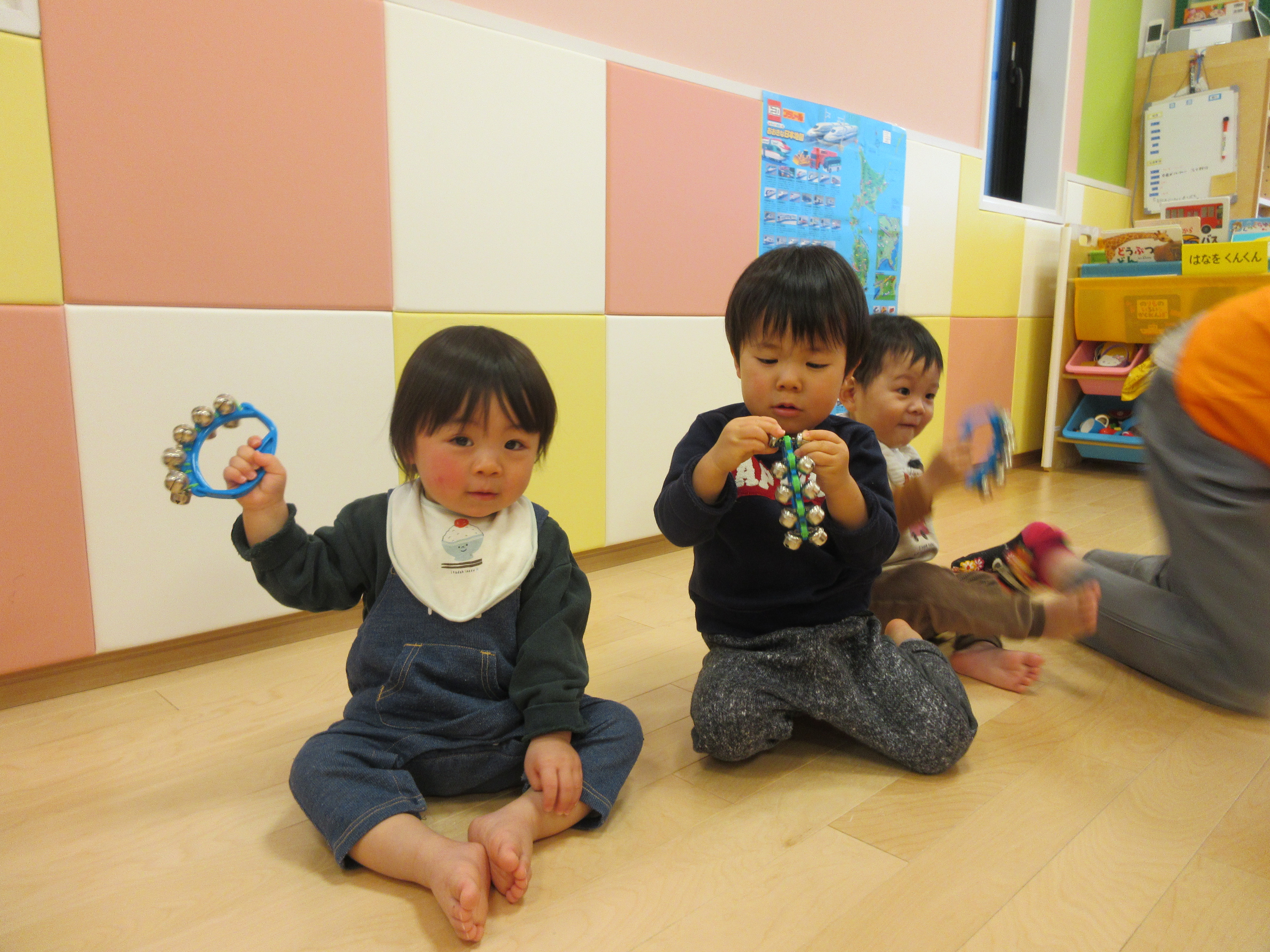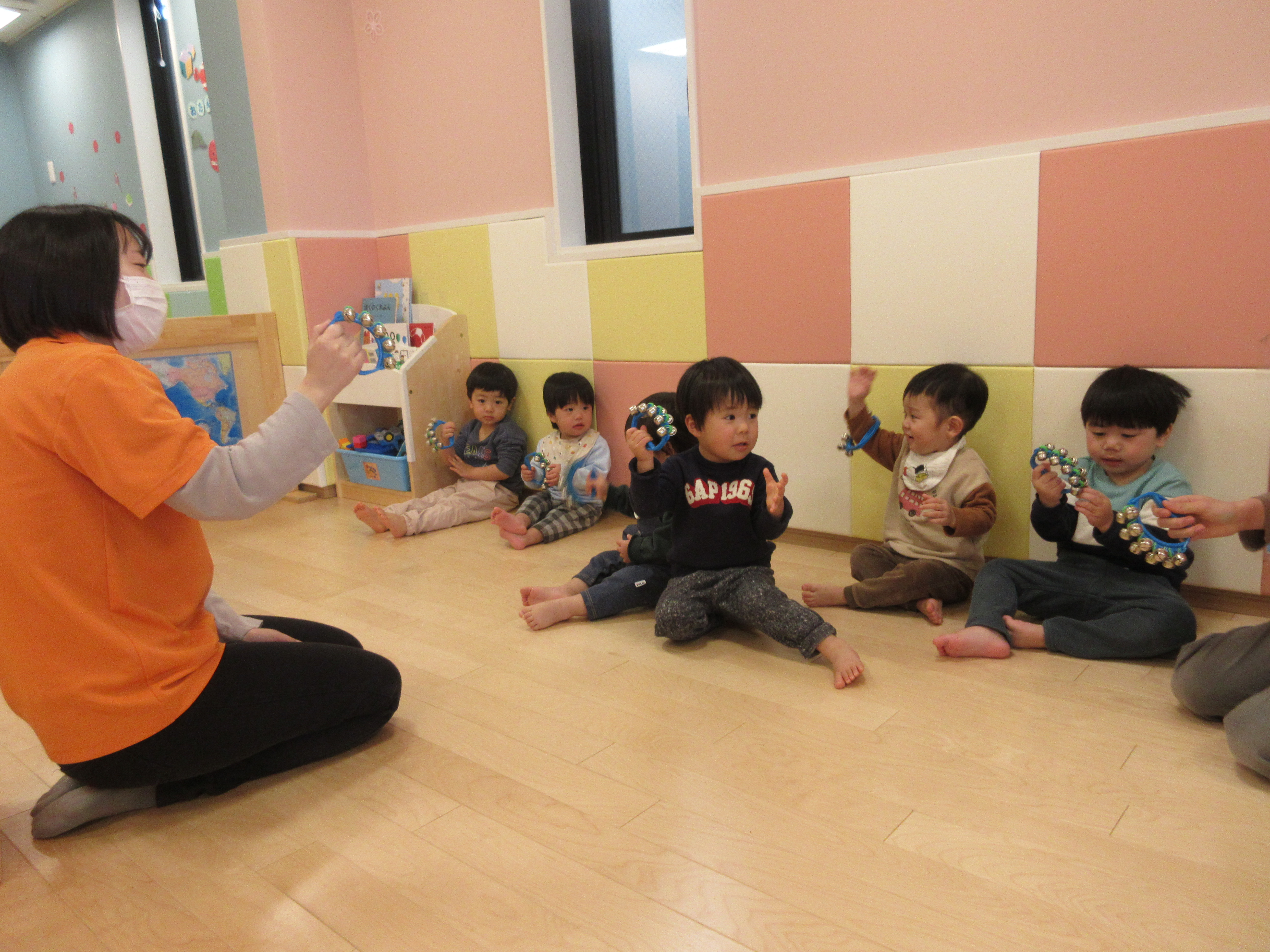 先生と一緒に♩のリズムに合わせて、鈴を鳴らしたり歌ったりと思い思いに表現してくれました。