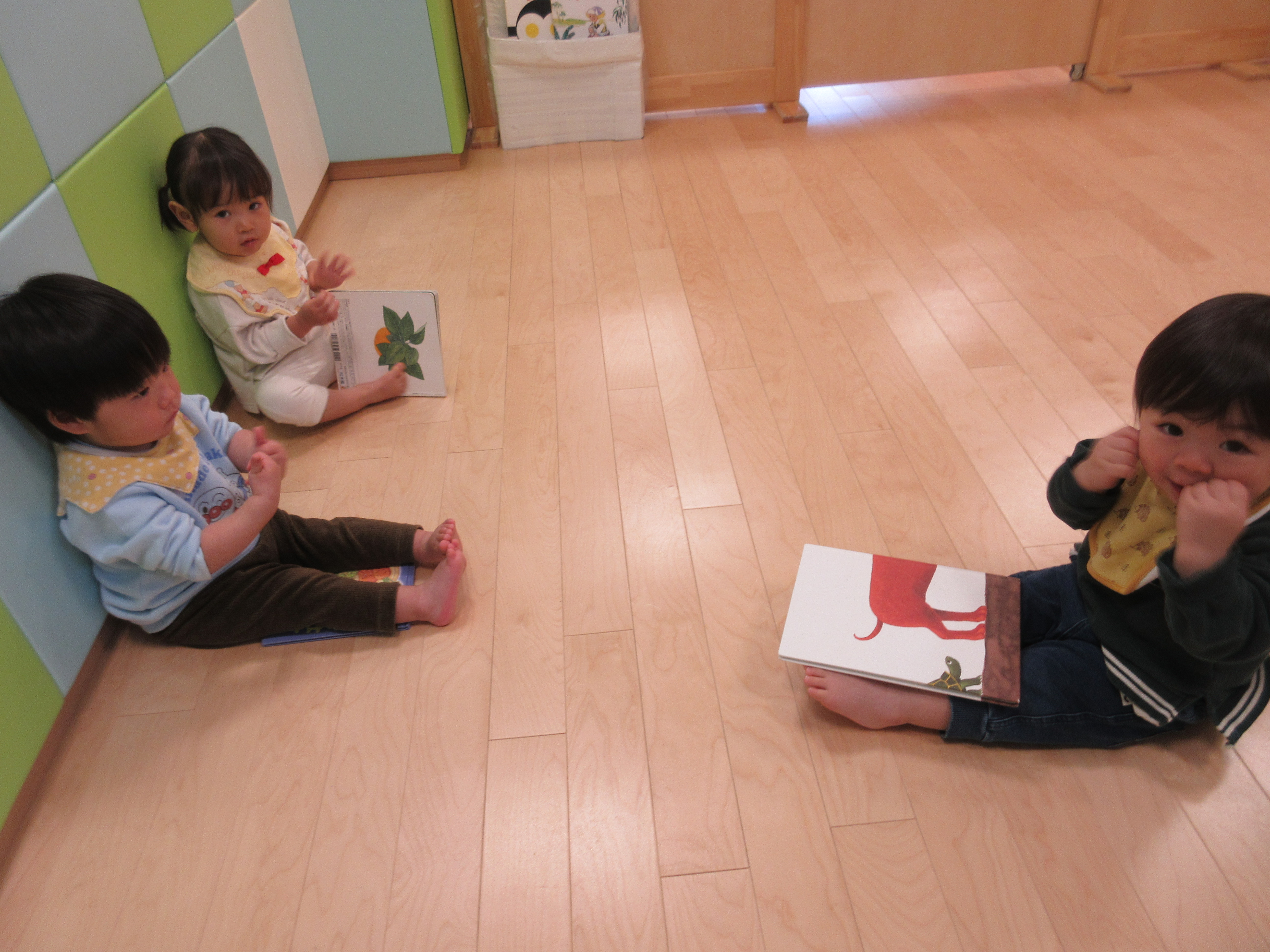 最近のももぐみさんは真似っこが上手で、⇩先生が絵本の読み聞かせをする姿を真似しています。