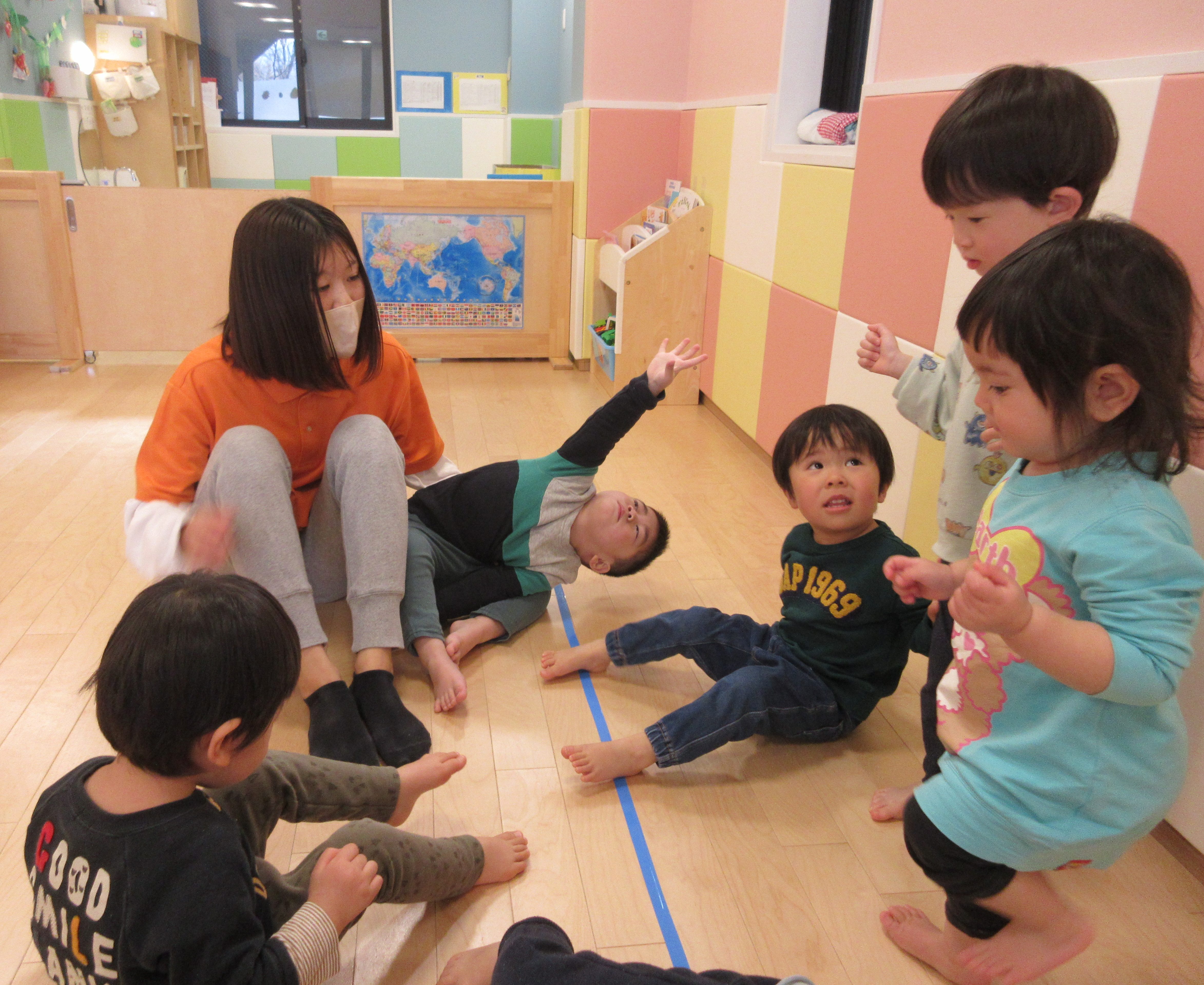 『手をたたきましょう』の時は、立ち上がって足踏みもしていて、