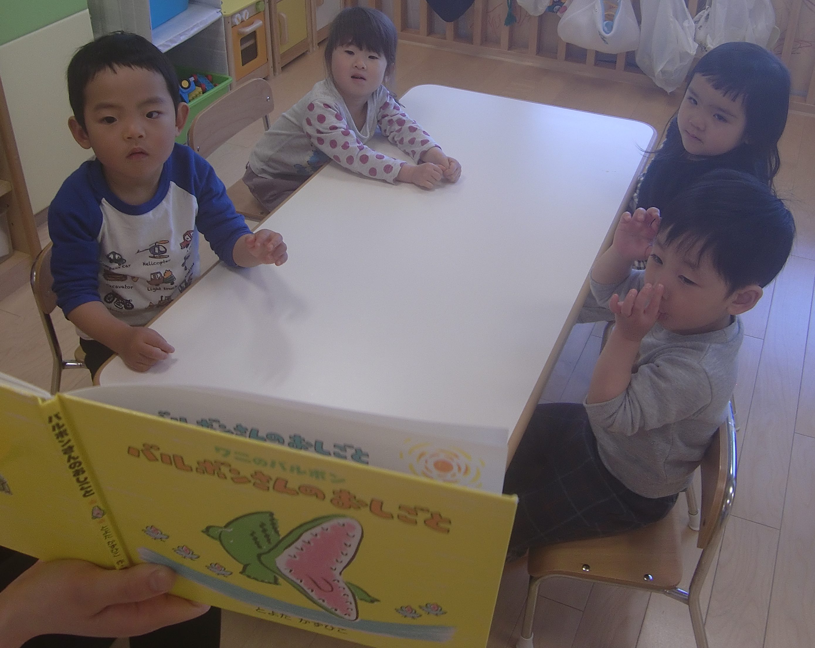 絵を見てお話しするだけでなく、次の展開やページ内にいないものについても想像を膨らませ、たくさん話しながらみていましたよ![]()