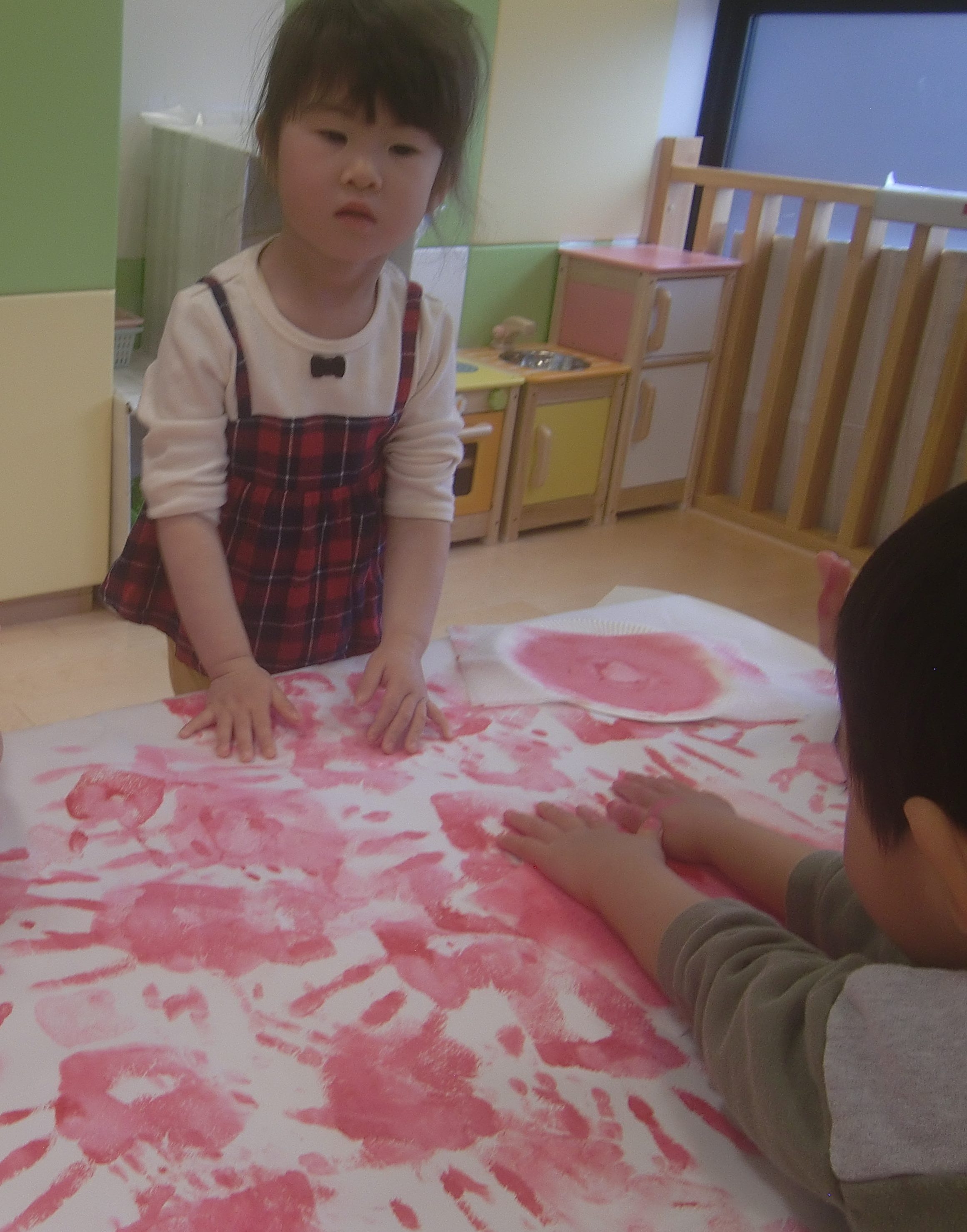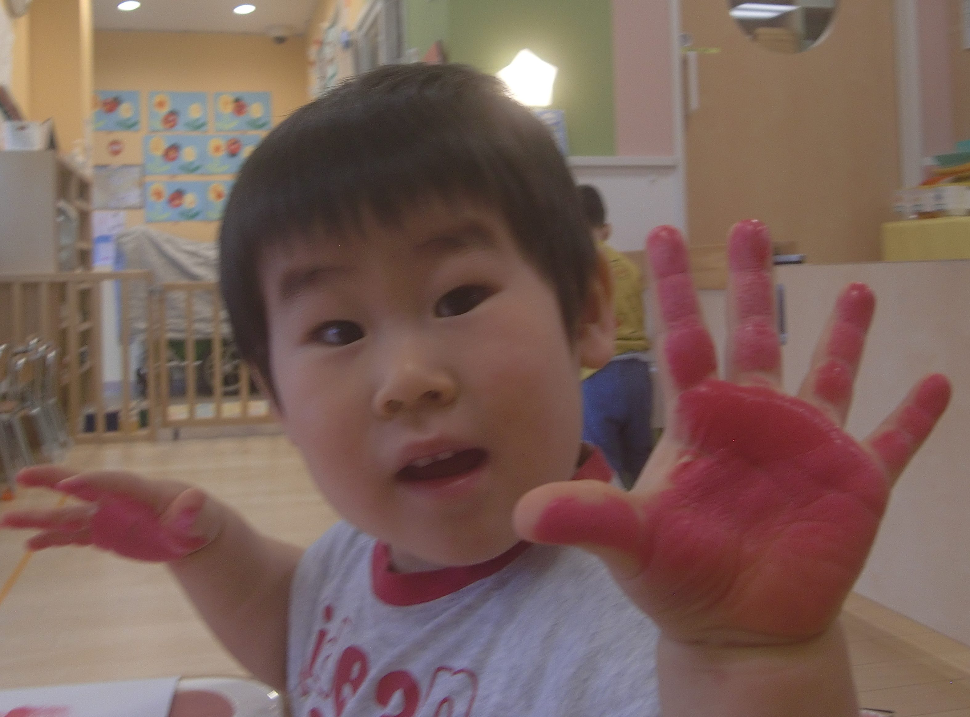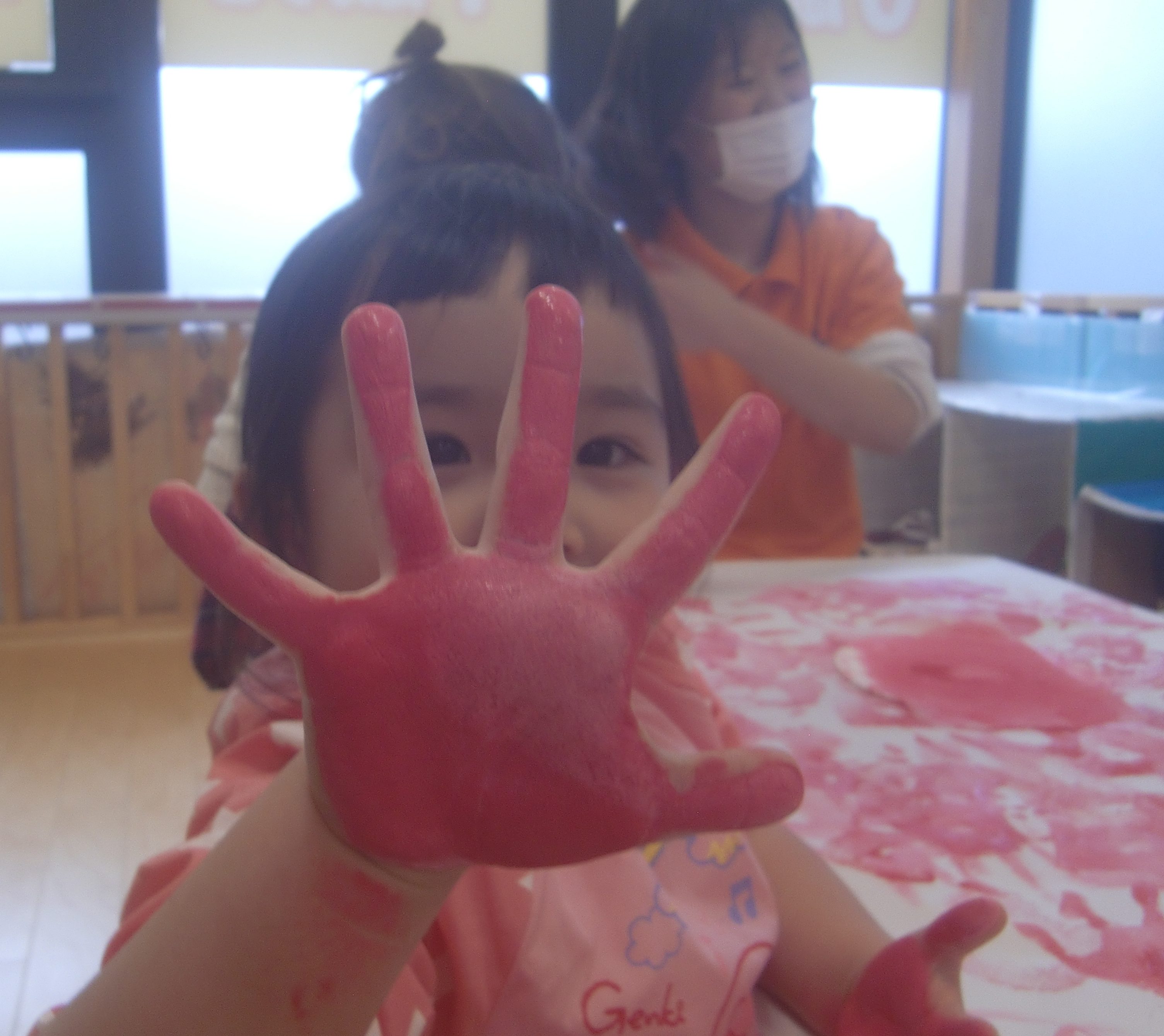 」と驚きつつも、絵の具の感触がおもしろいようで笑っていた子どもたちです![]()