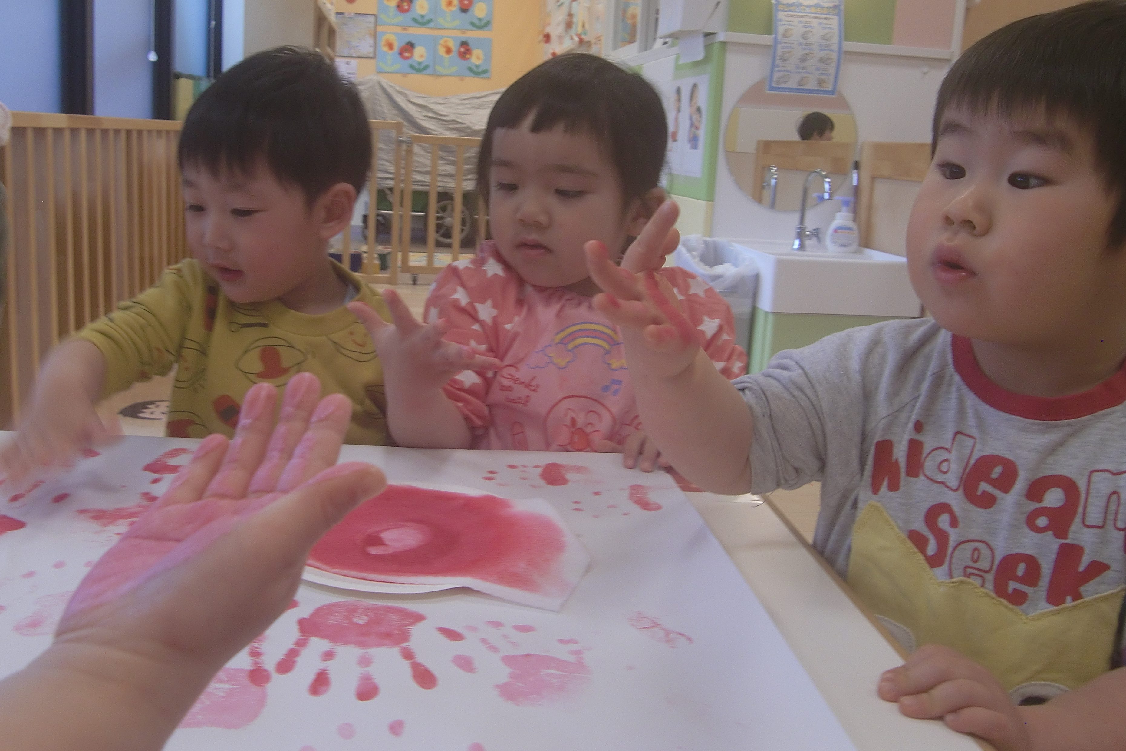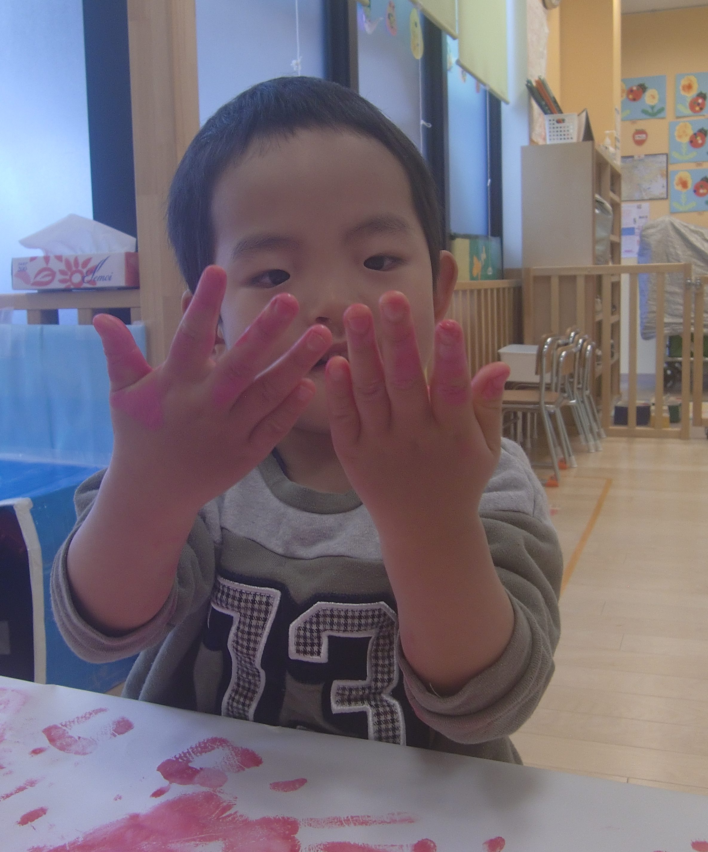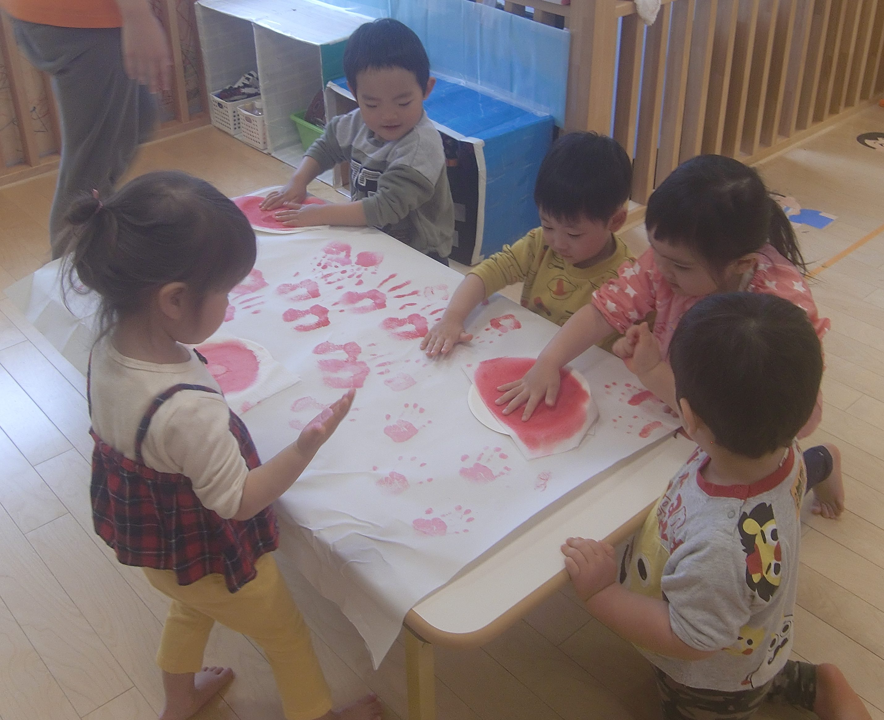 」と驚きつつも、絵の具の感触がおもしろいようで笑っていた子どもたちです![]()