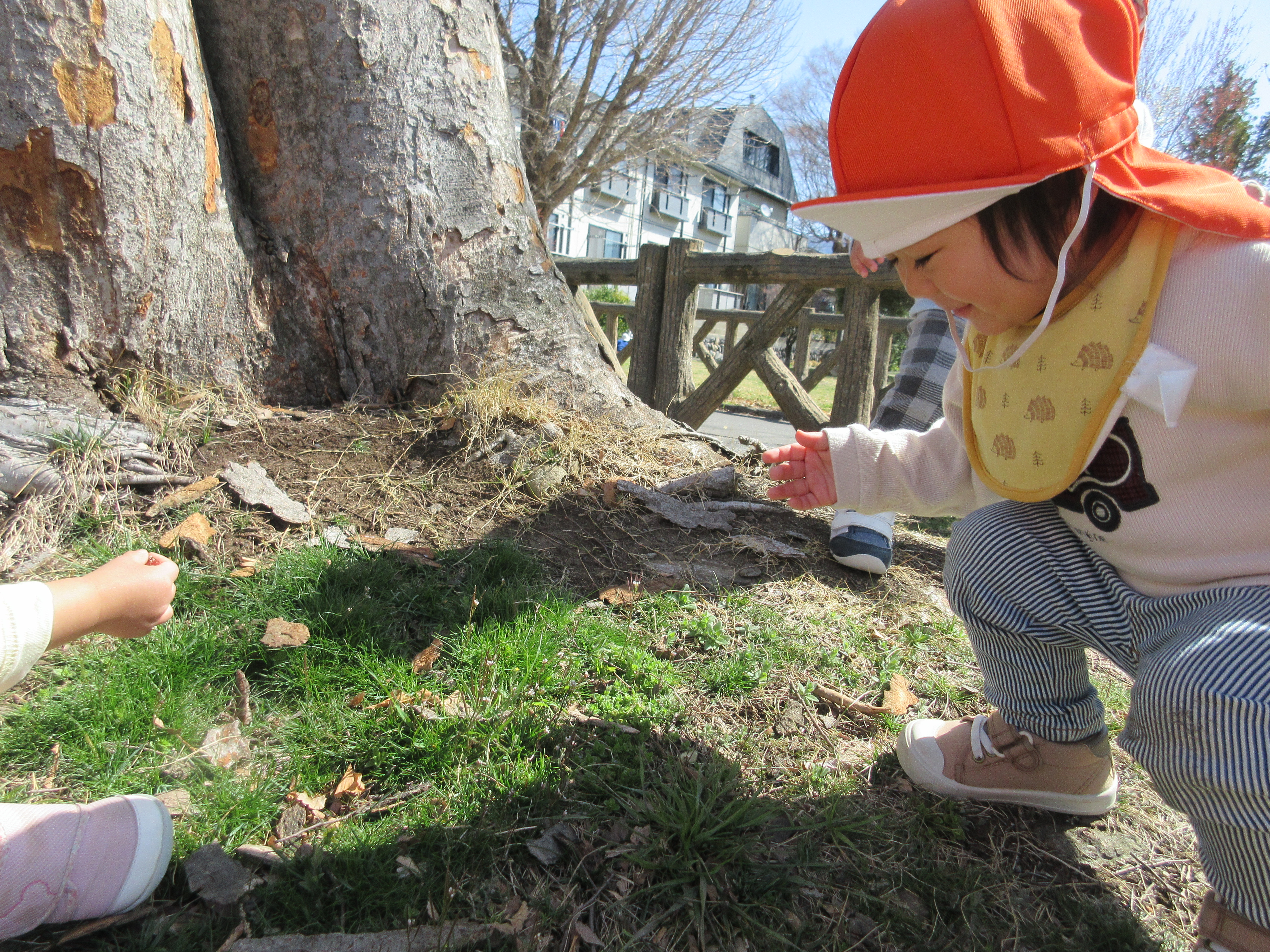また、木の根っこの側で小さなお花を見つけると嬉しそうに「はな!」と口にする子もいました。