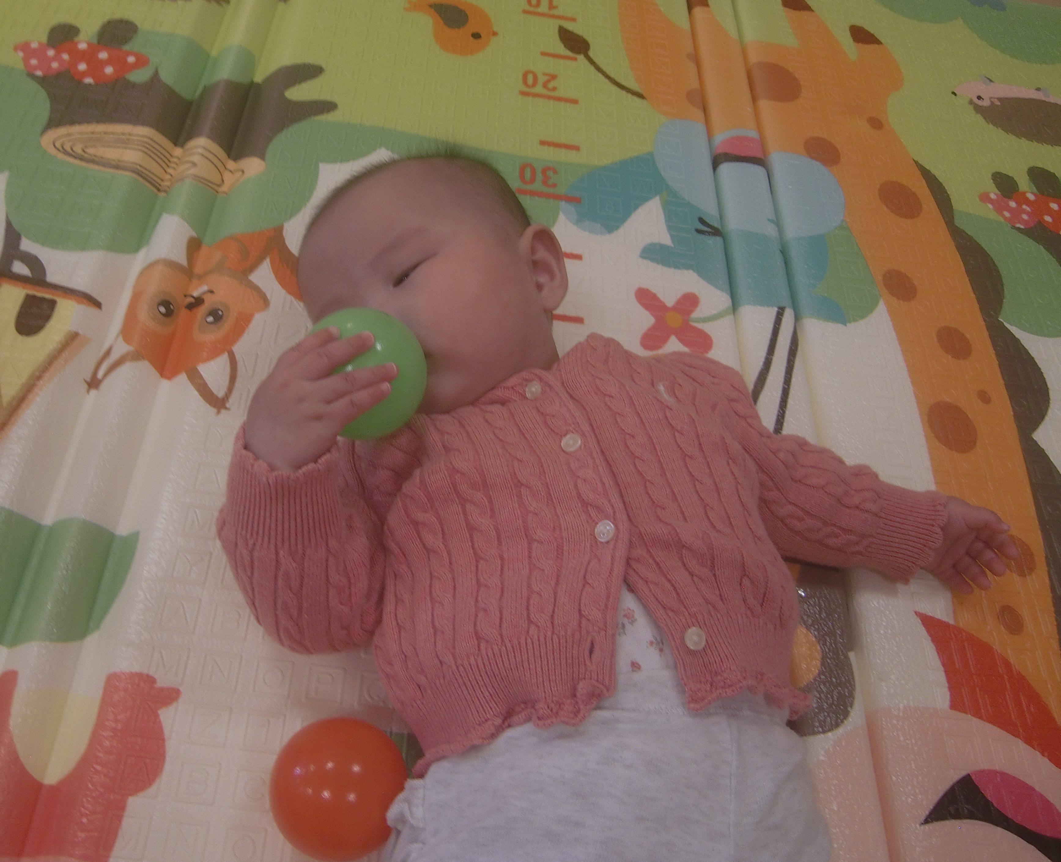 「ボールはどこだろう?」寝転がりながら、近くのボールを探してみています![]()