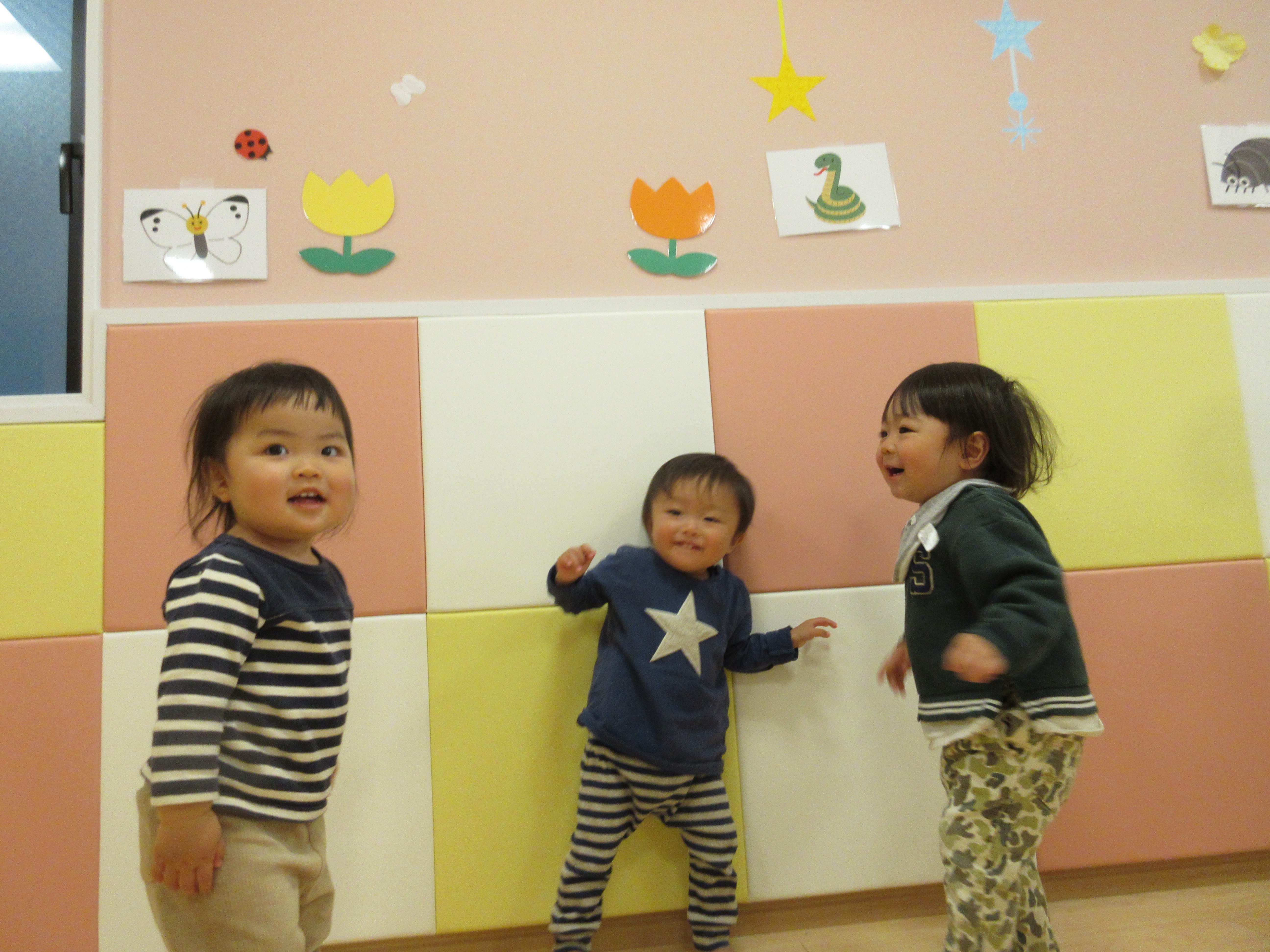 壁にフラッシュカードを貼って、「ちょうちょのところまでよーいドン