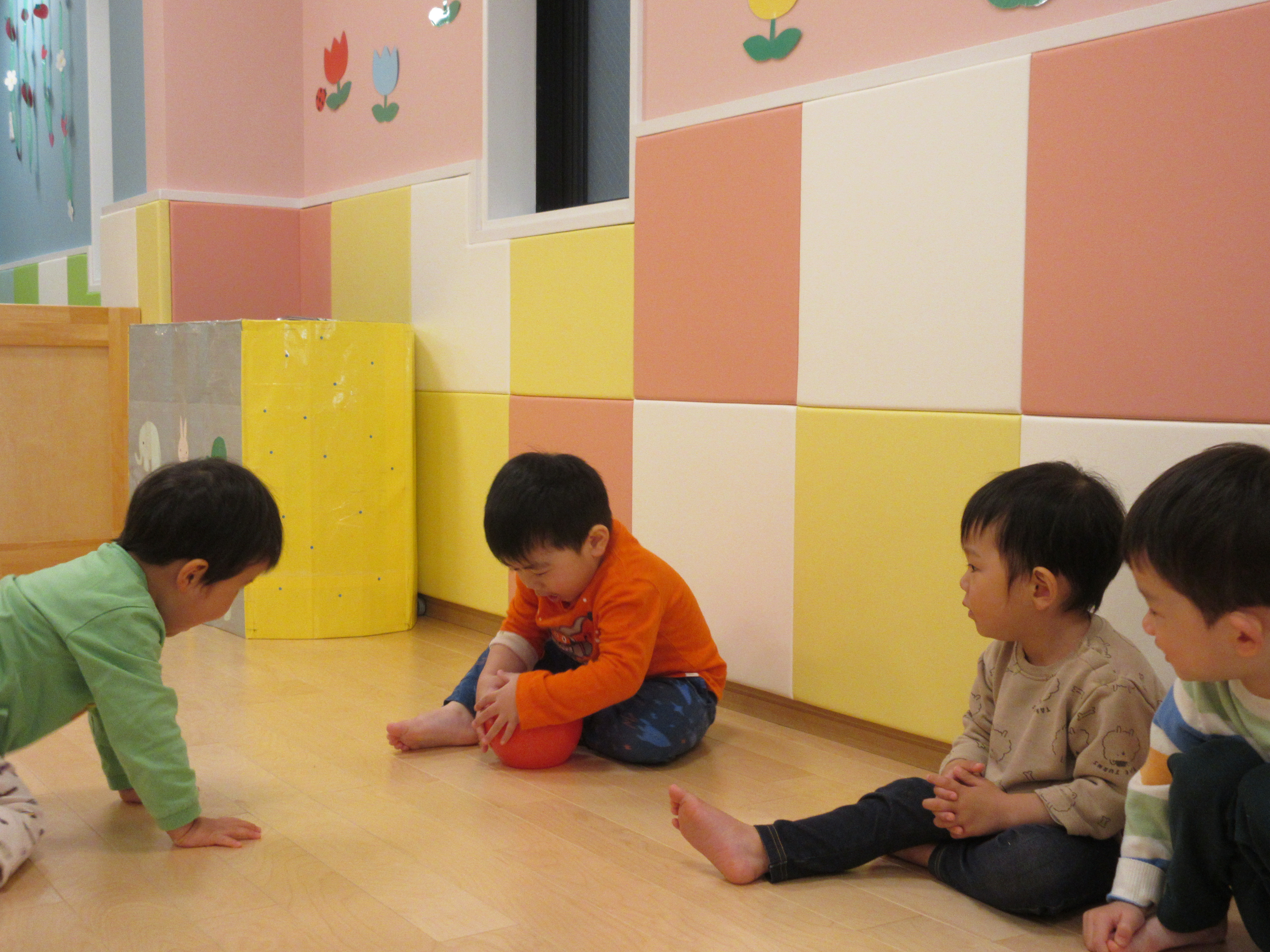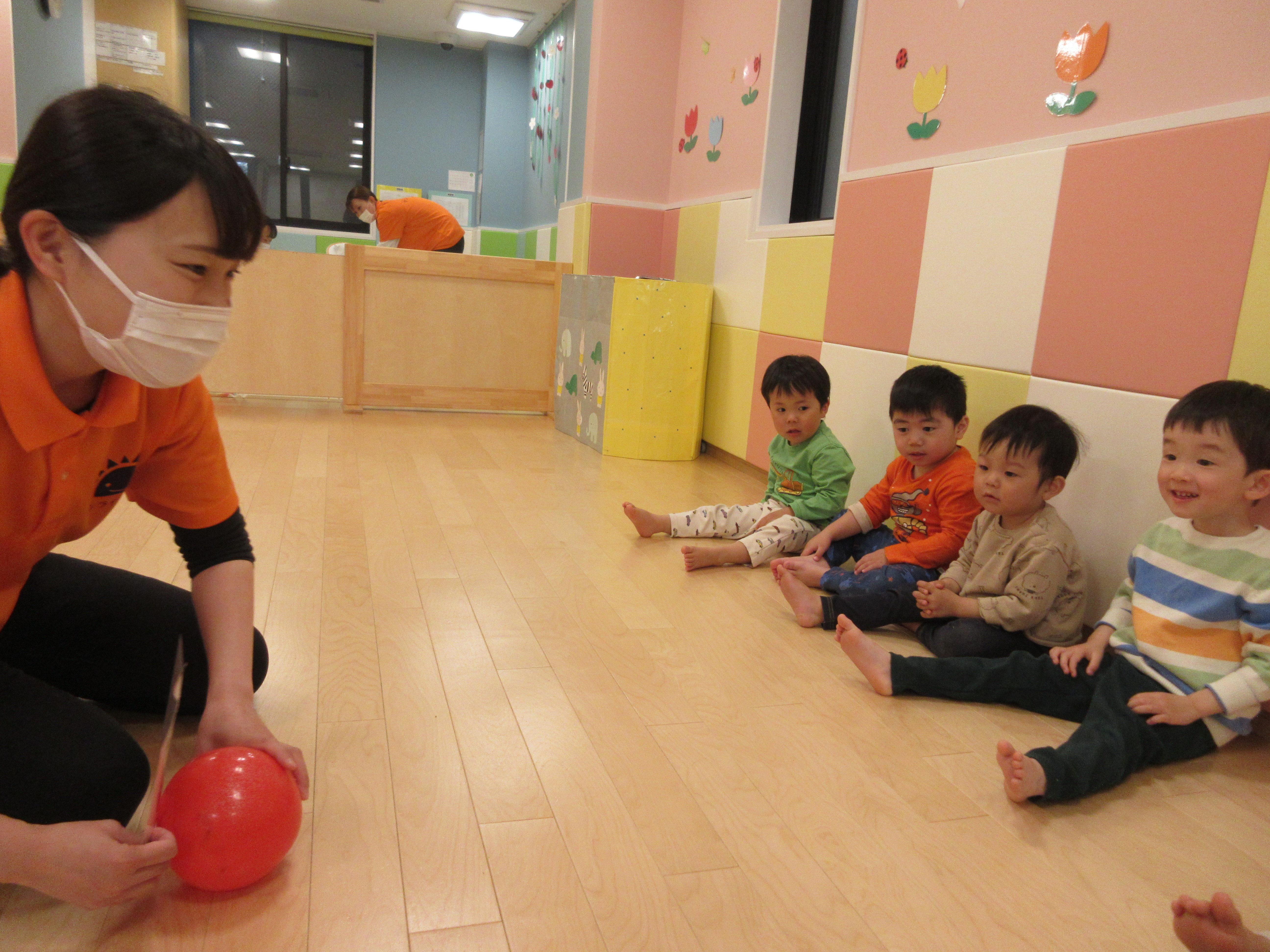 みんなで壁のところへ座り、先生が転がしたボールをキャッチ![]()