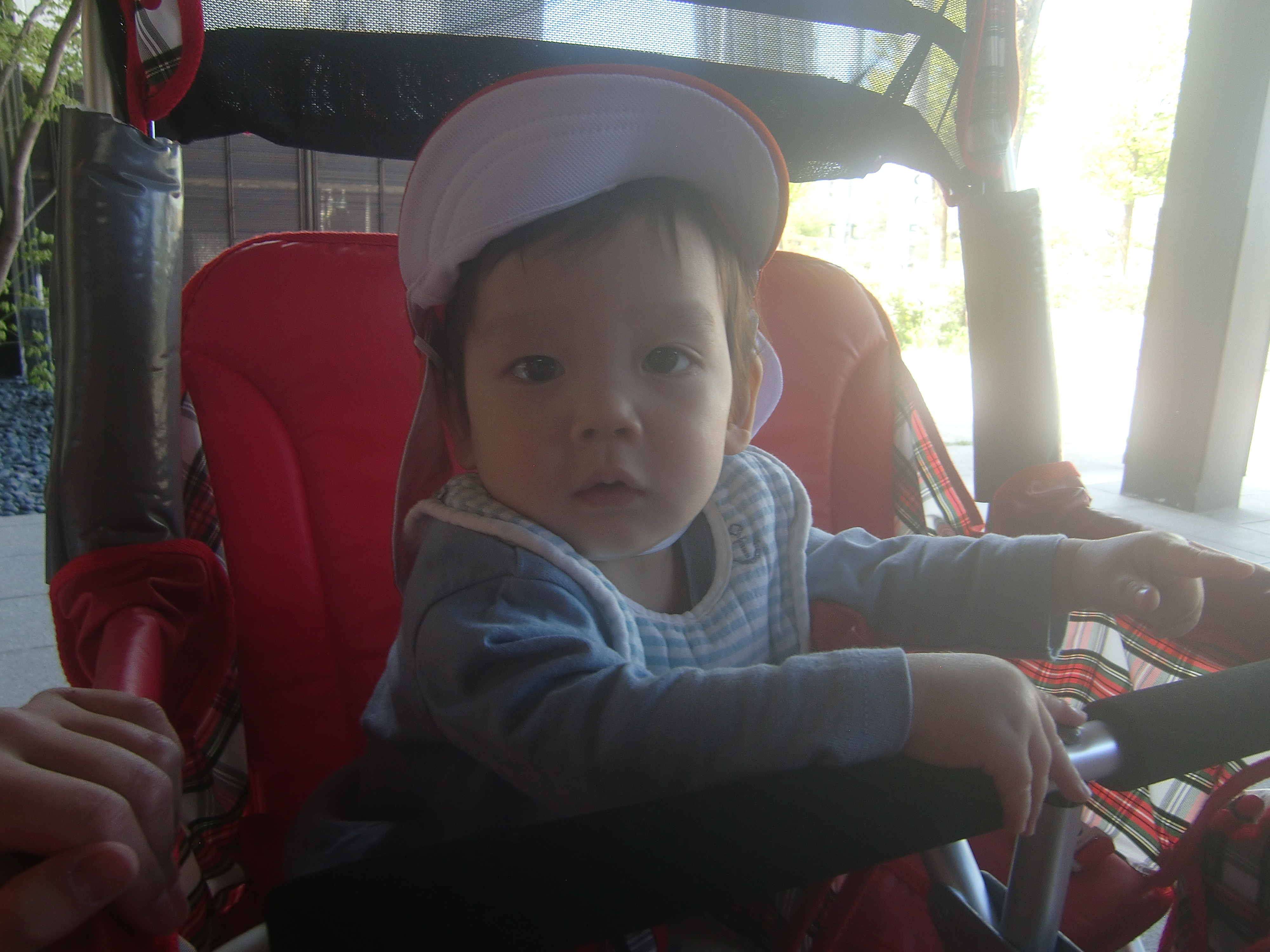 オレンジ帽子を被り靴下を履き、カートに乗って保育園をしゅっぱ~つ![]()