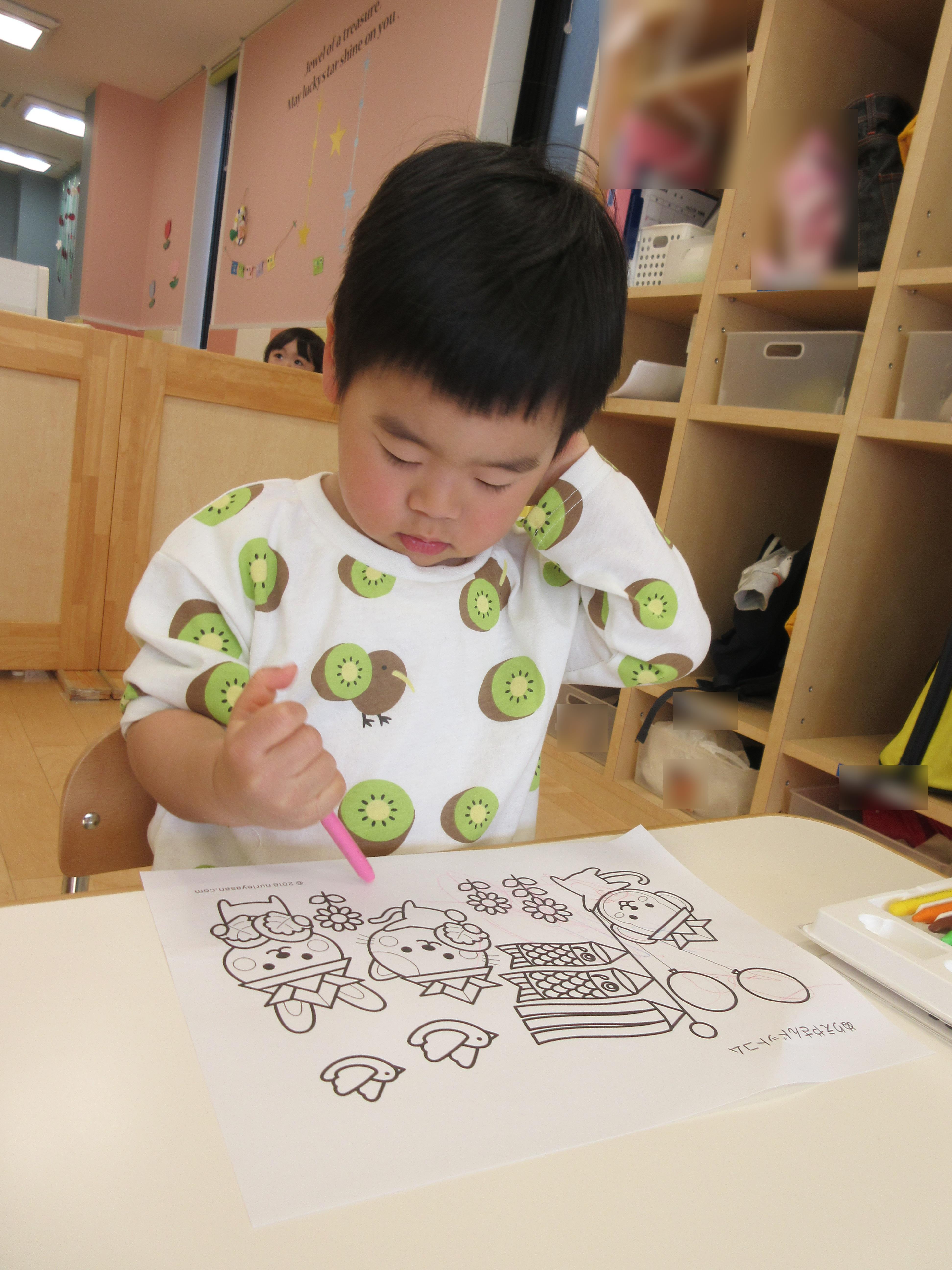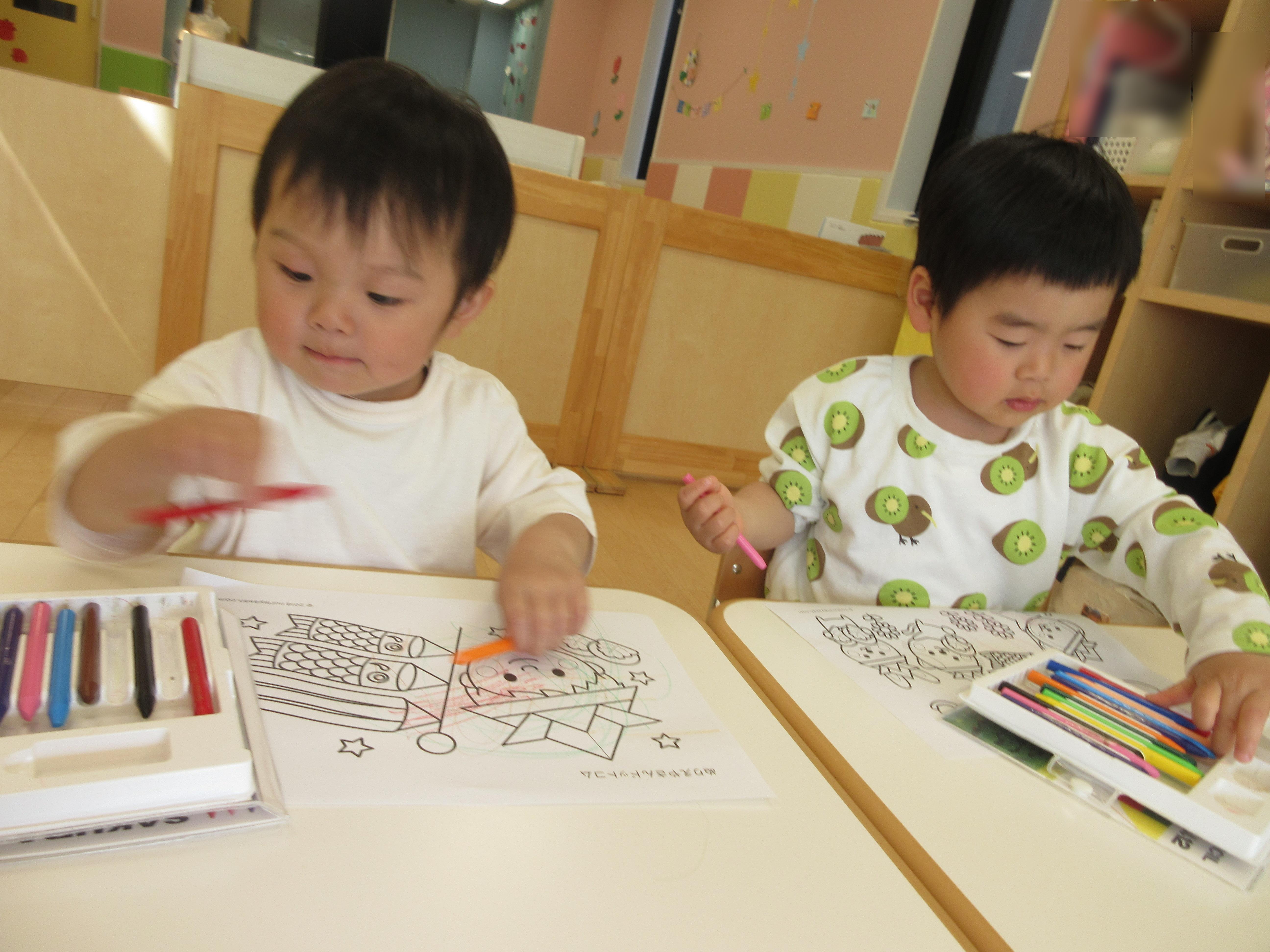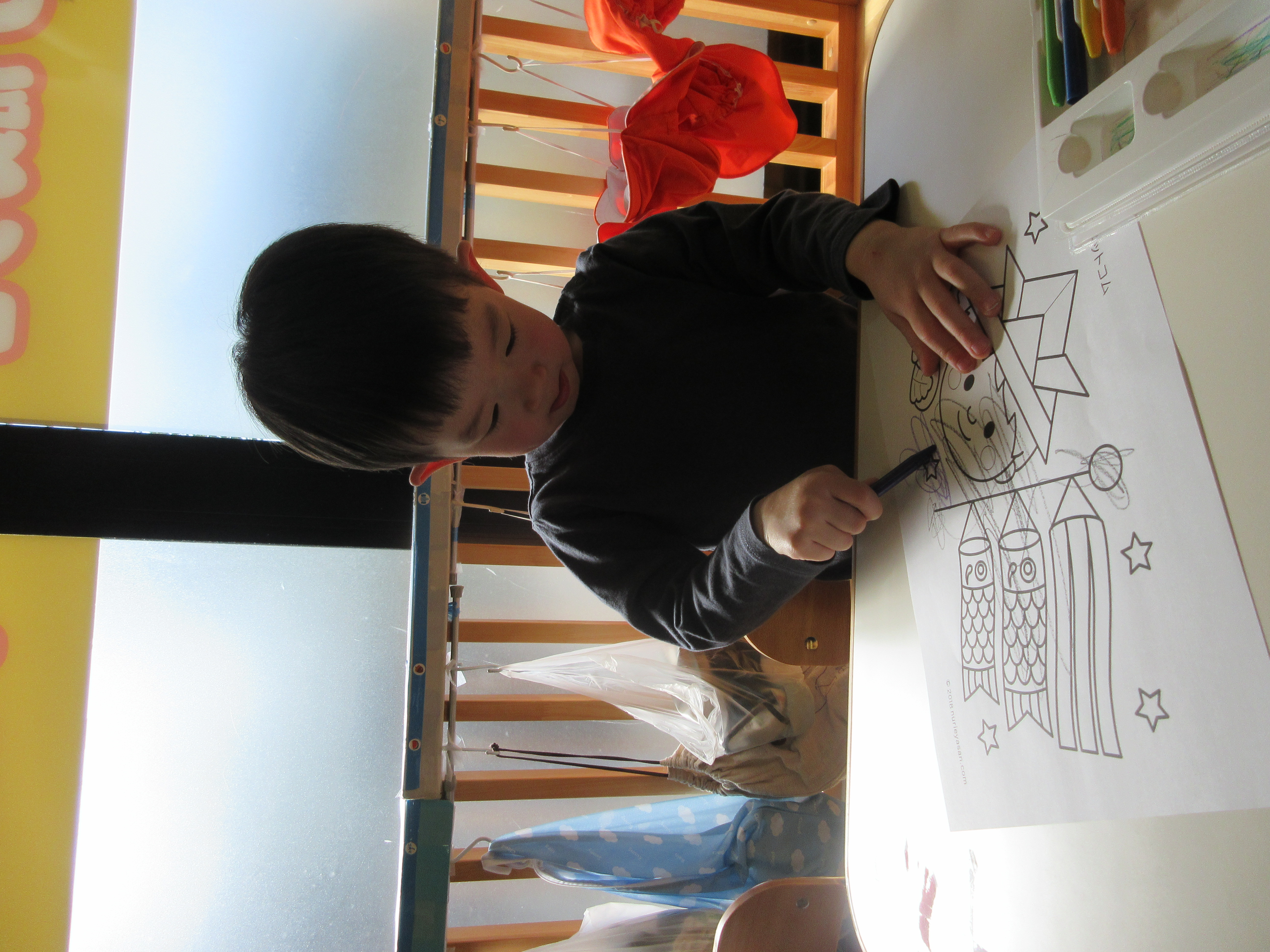 木曜日には、「子どもの日」がもう少しということで、制作をする前に3種類の中から好きなこいのぼりのイラストを選んでもらい、色塗りをしました。