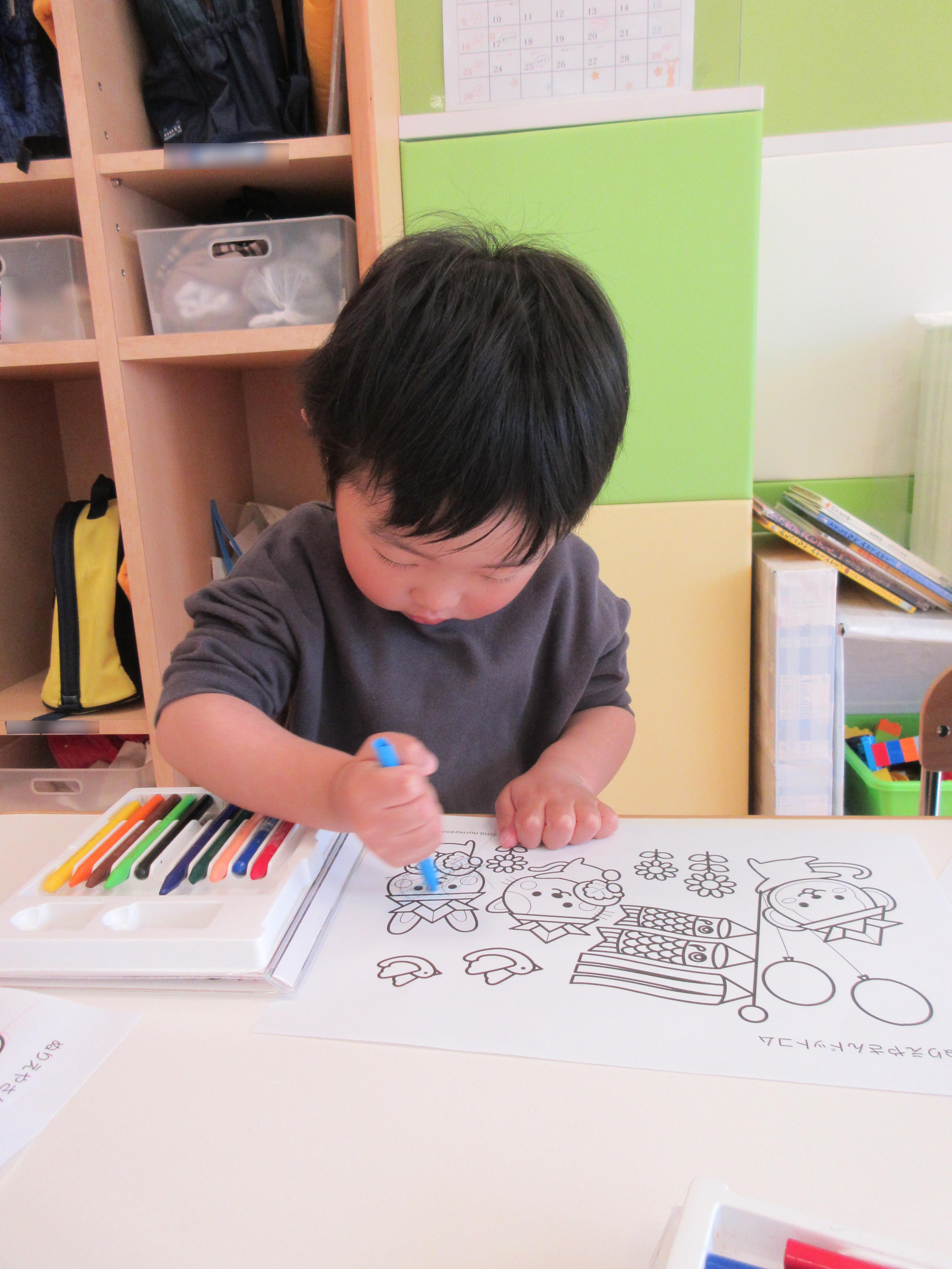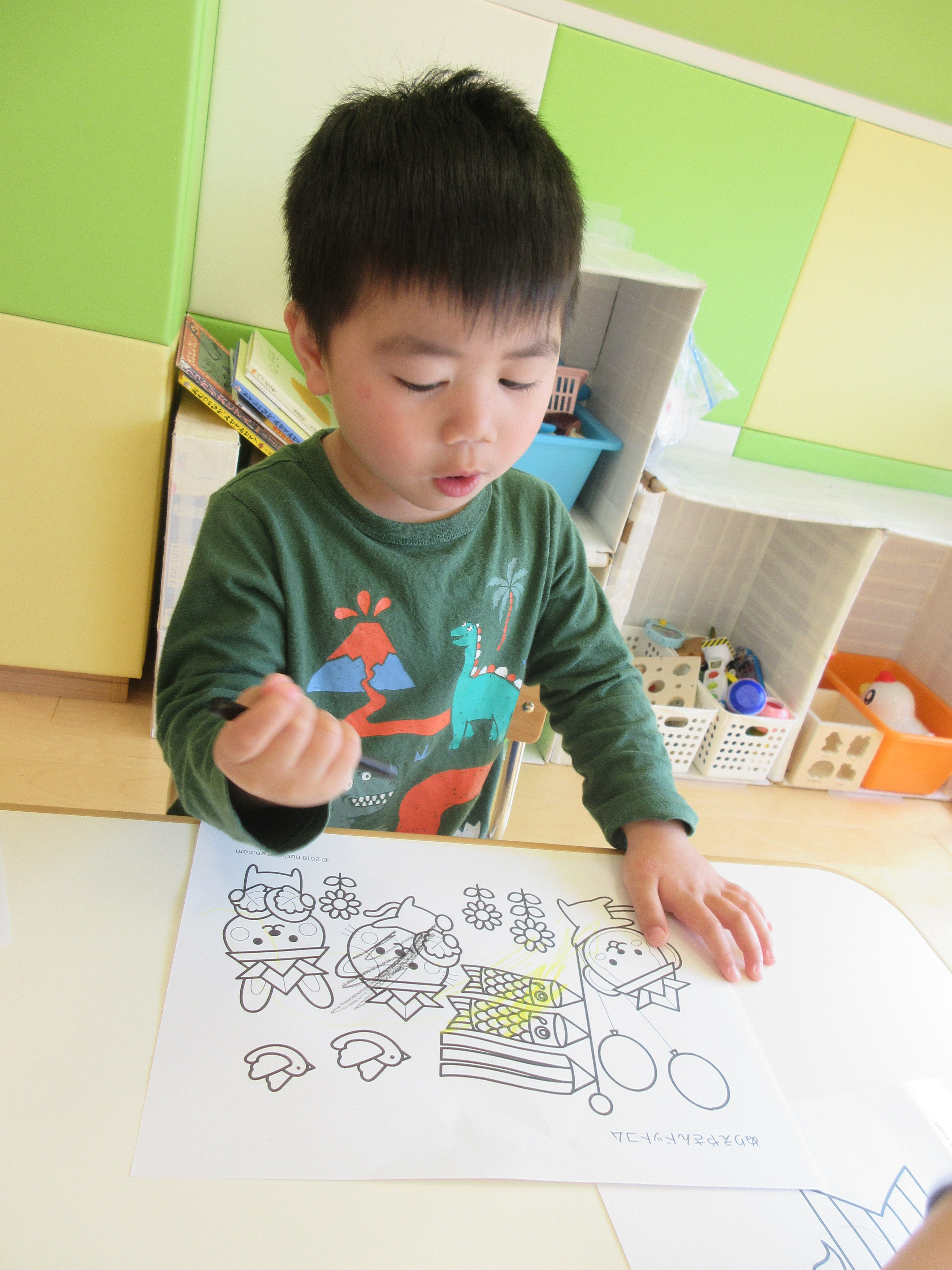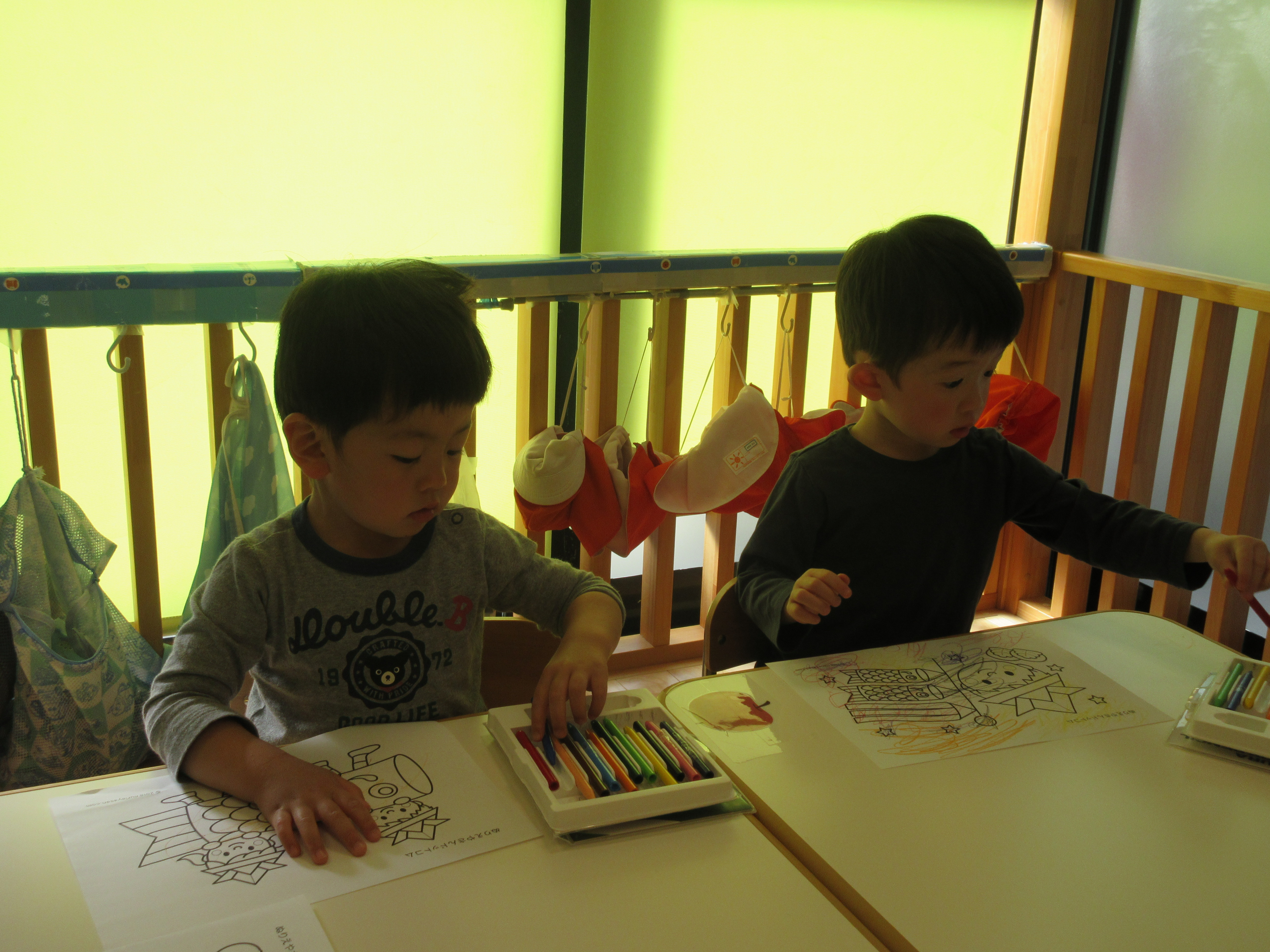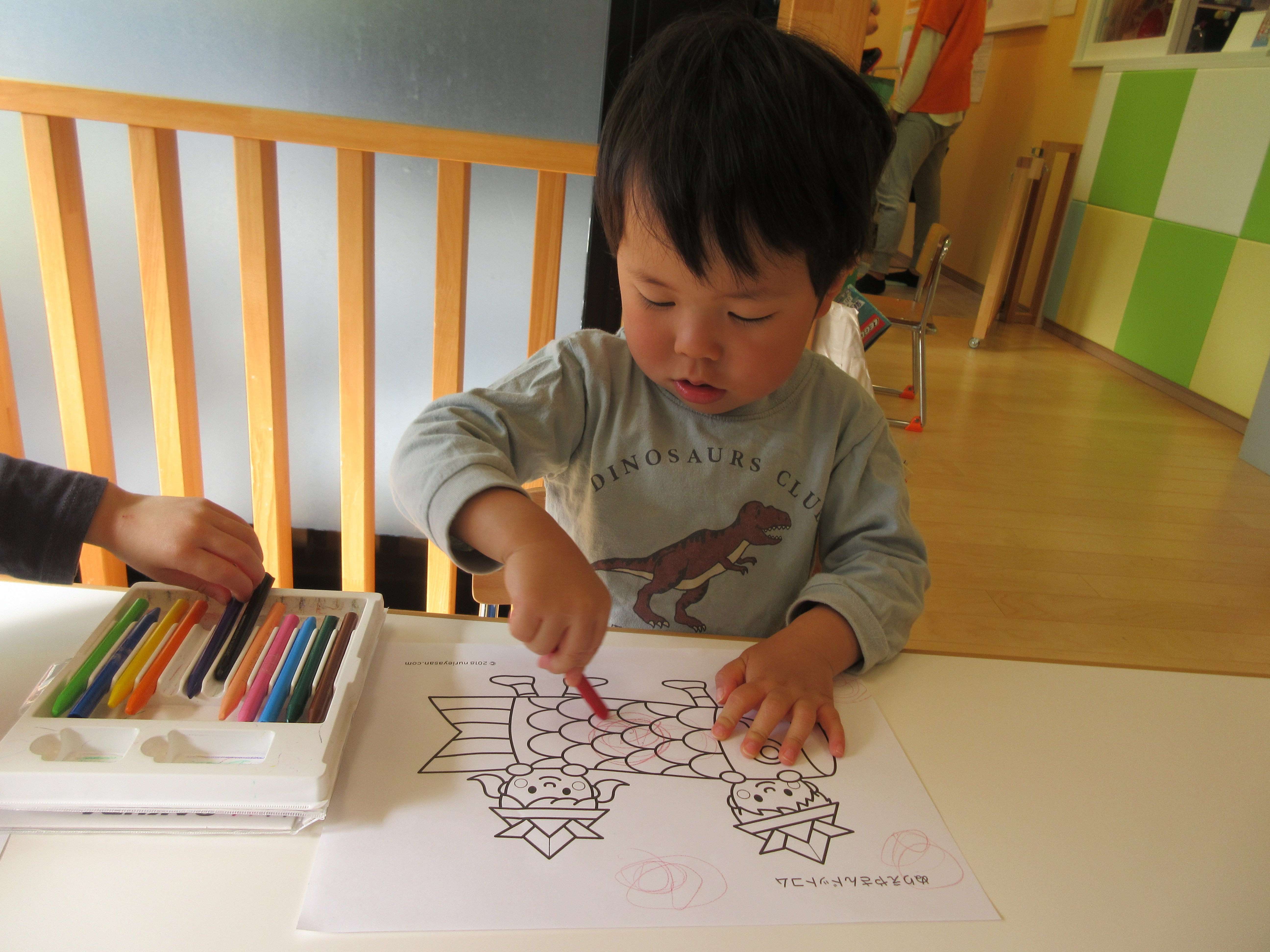 木曜日には、「子どもの日」がもう少しということで、制作をする前に3種類の中から好きなこいのぼりのイラストを選んでもらい、色塗りをしました。