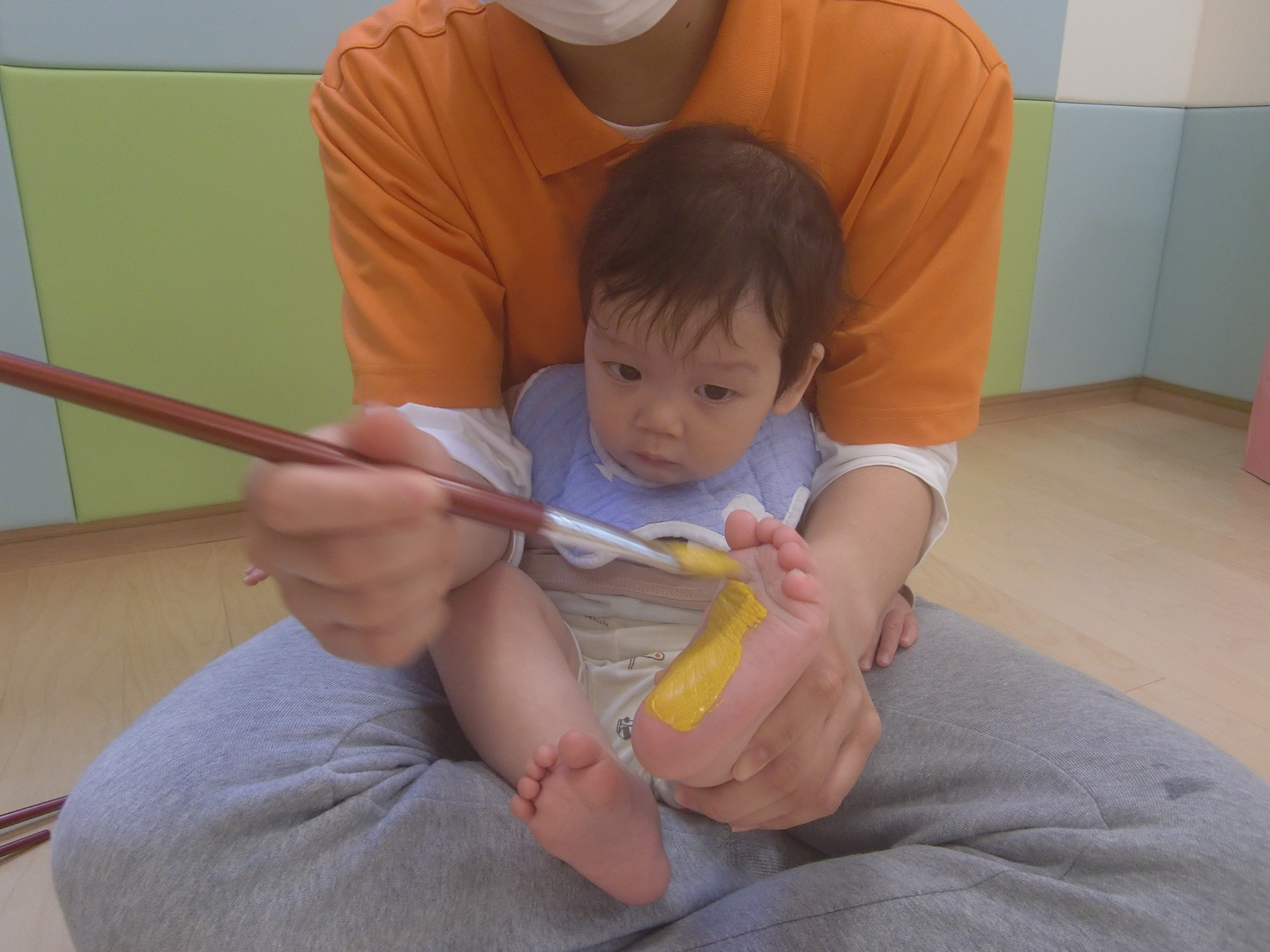 手に付く感触が苦手で指を動かして一生懸命、指から剝がそうとしていました