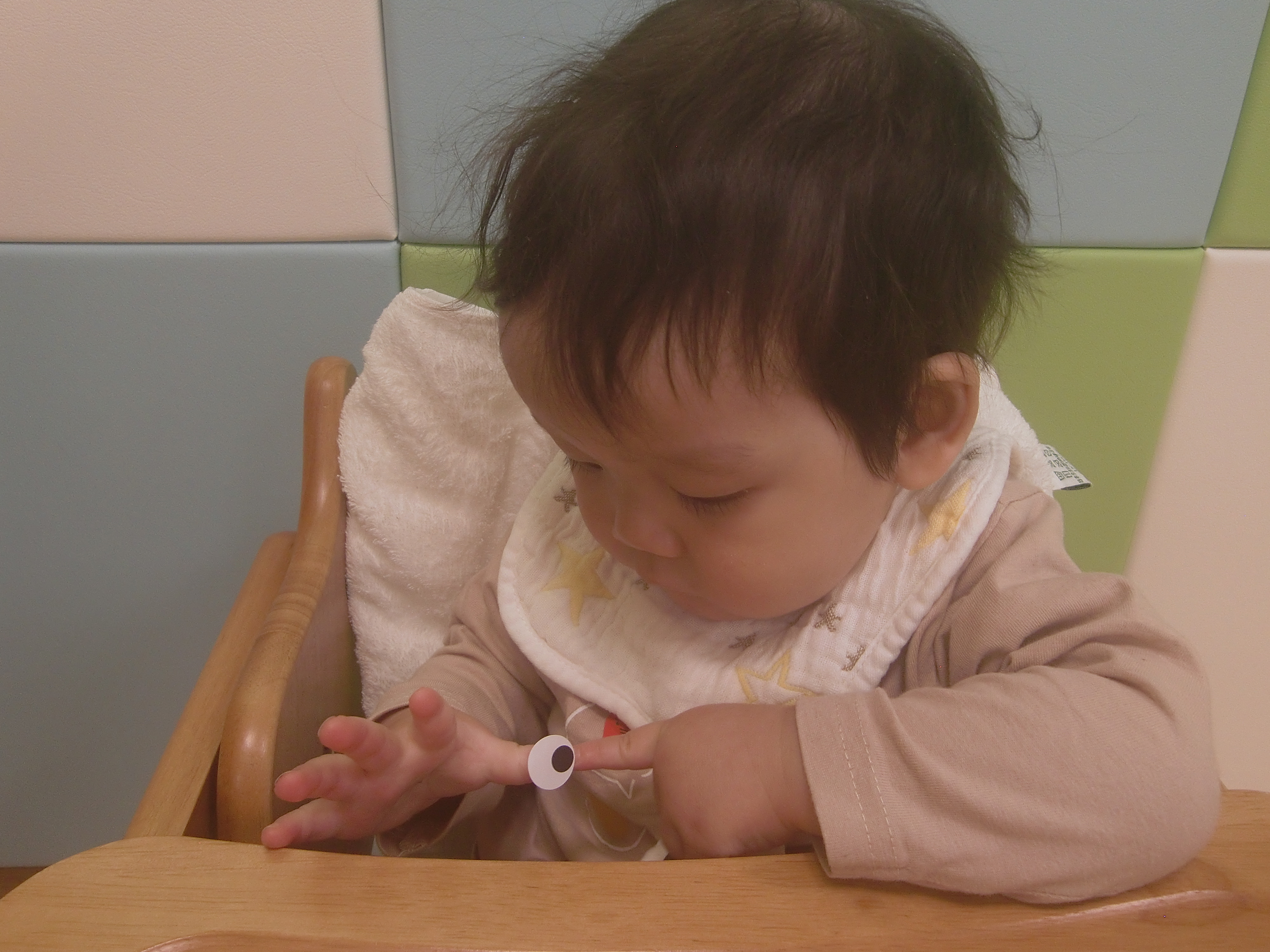 ↓少しお兄さんの子には目玉シール貼りに挑戦してもらいました