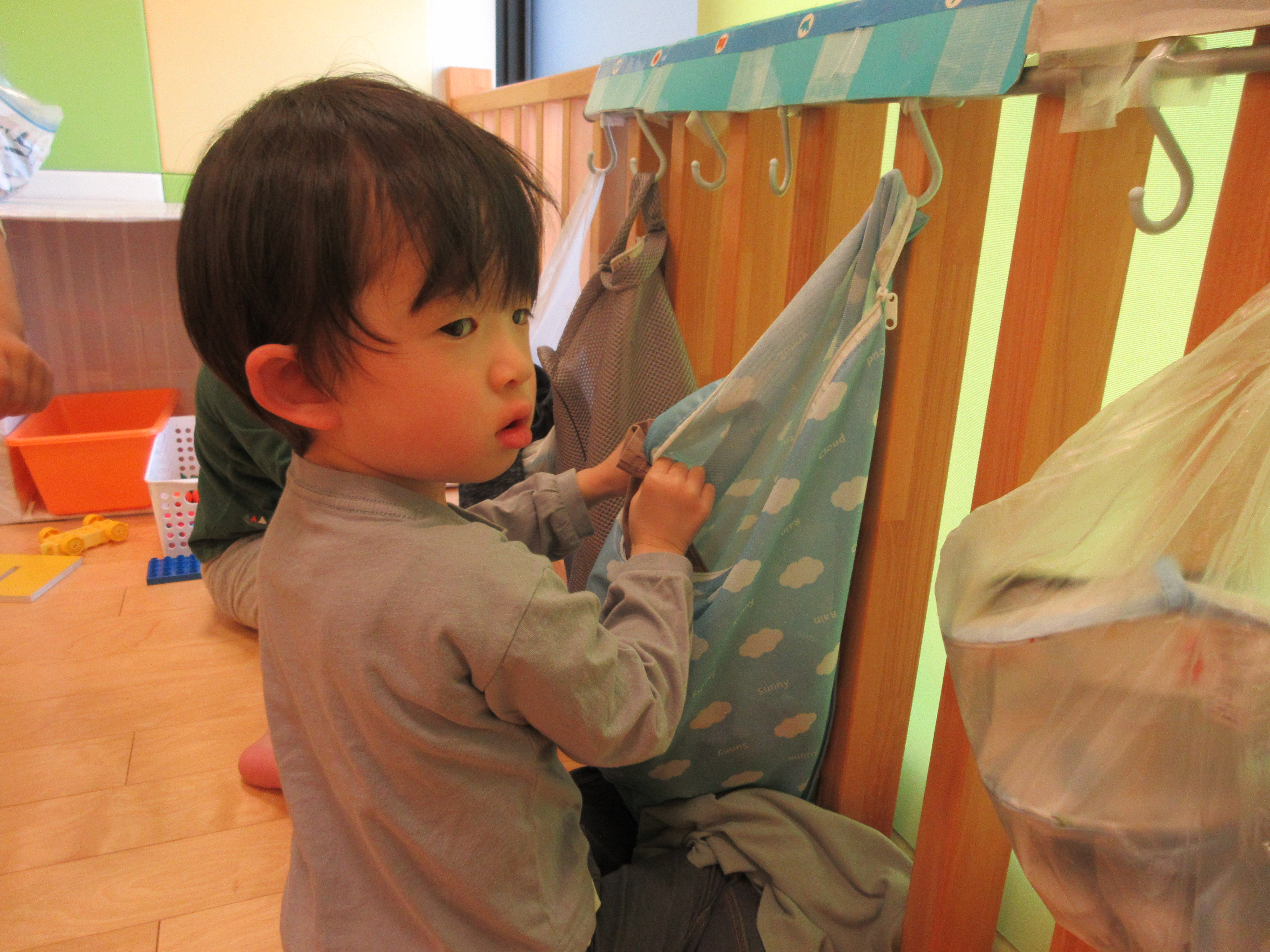 持って帰ってきたお着替えは、自分のマークのところにある袋へ入れますよ。