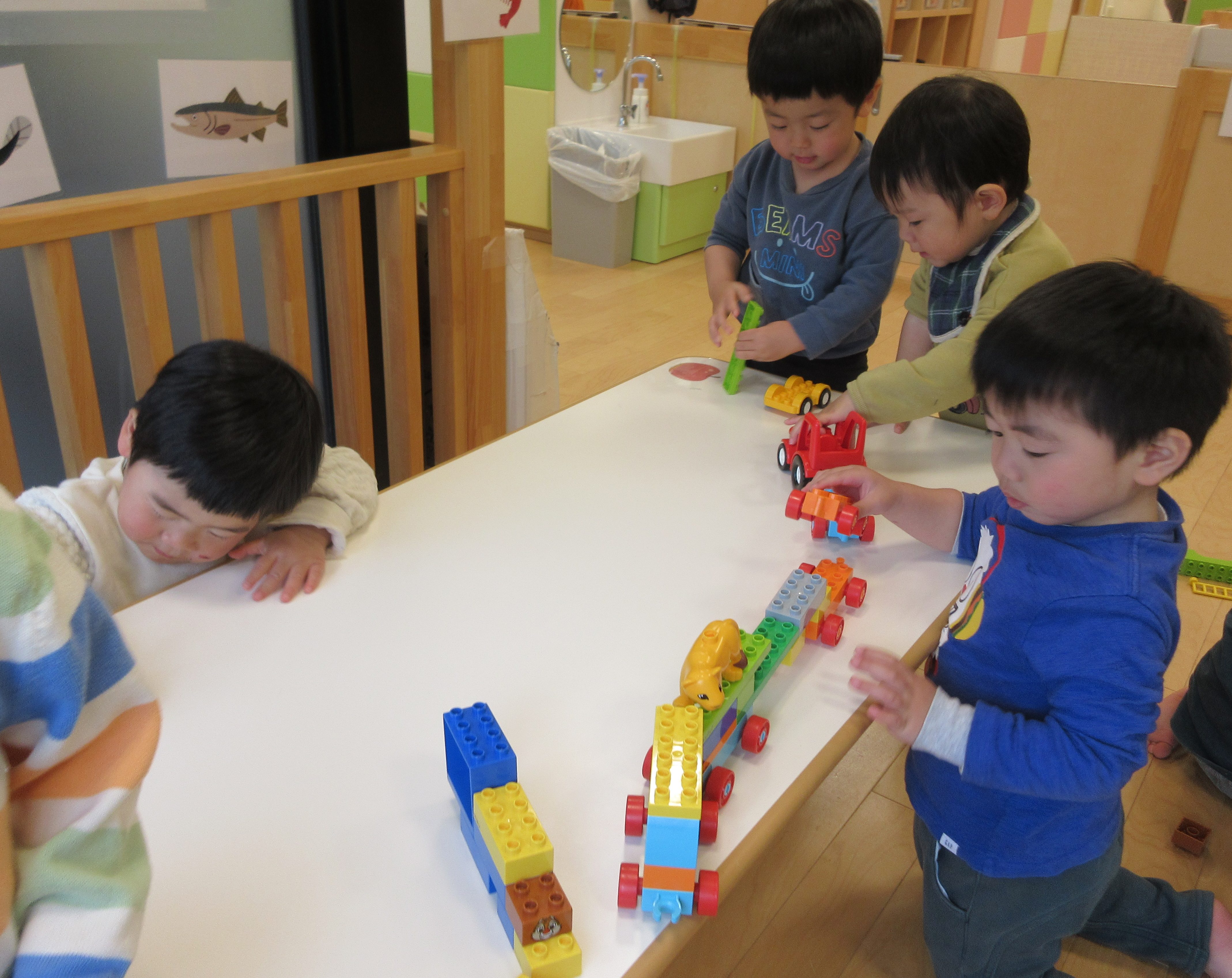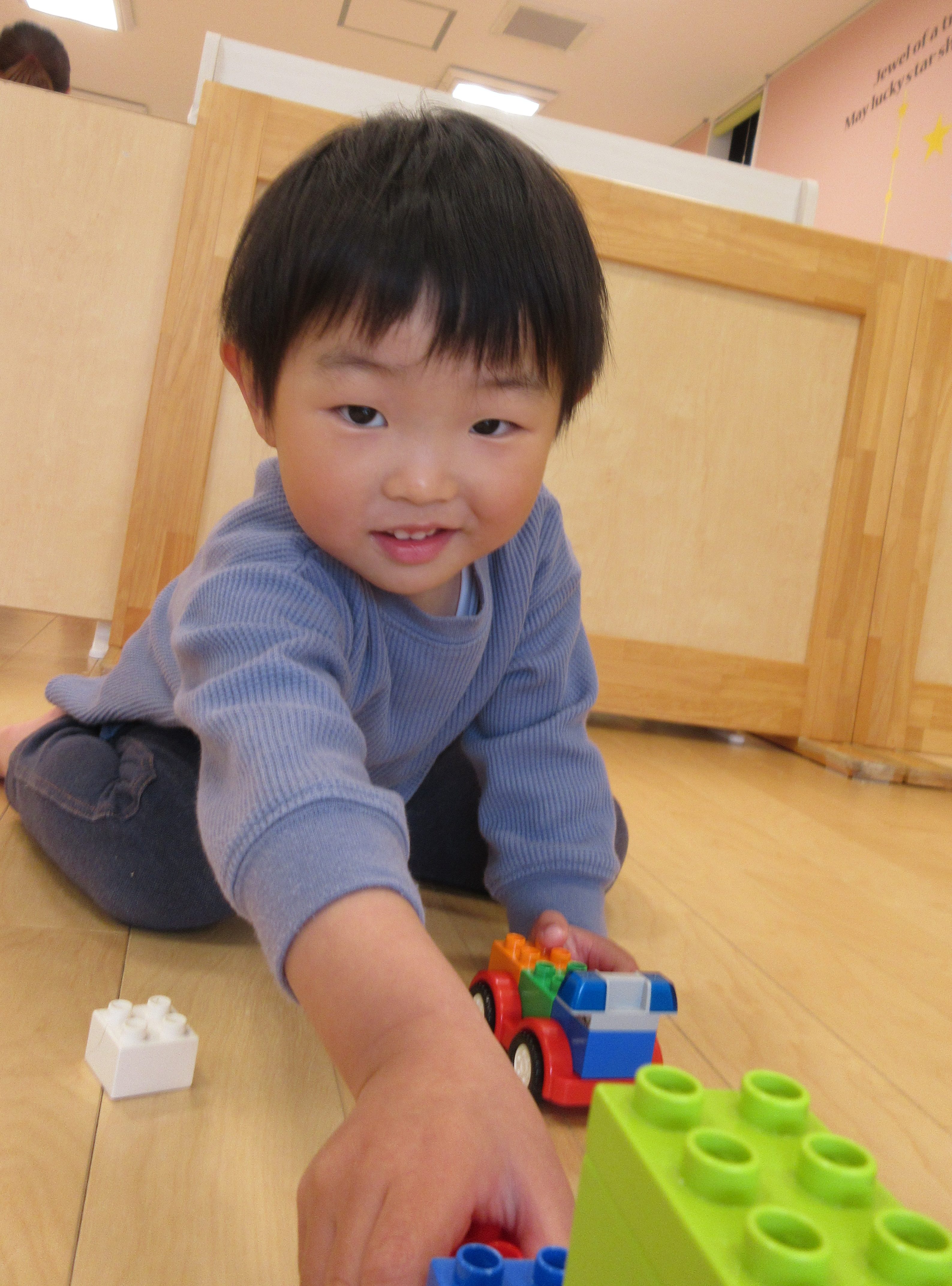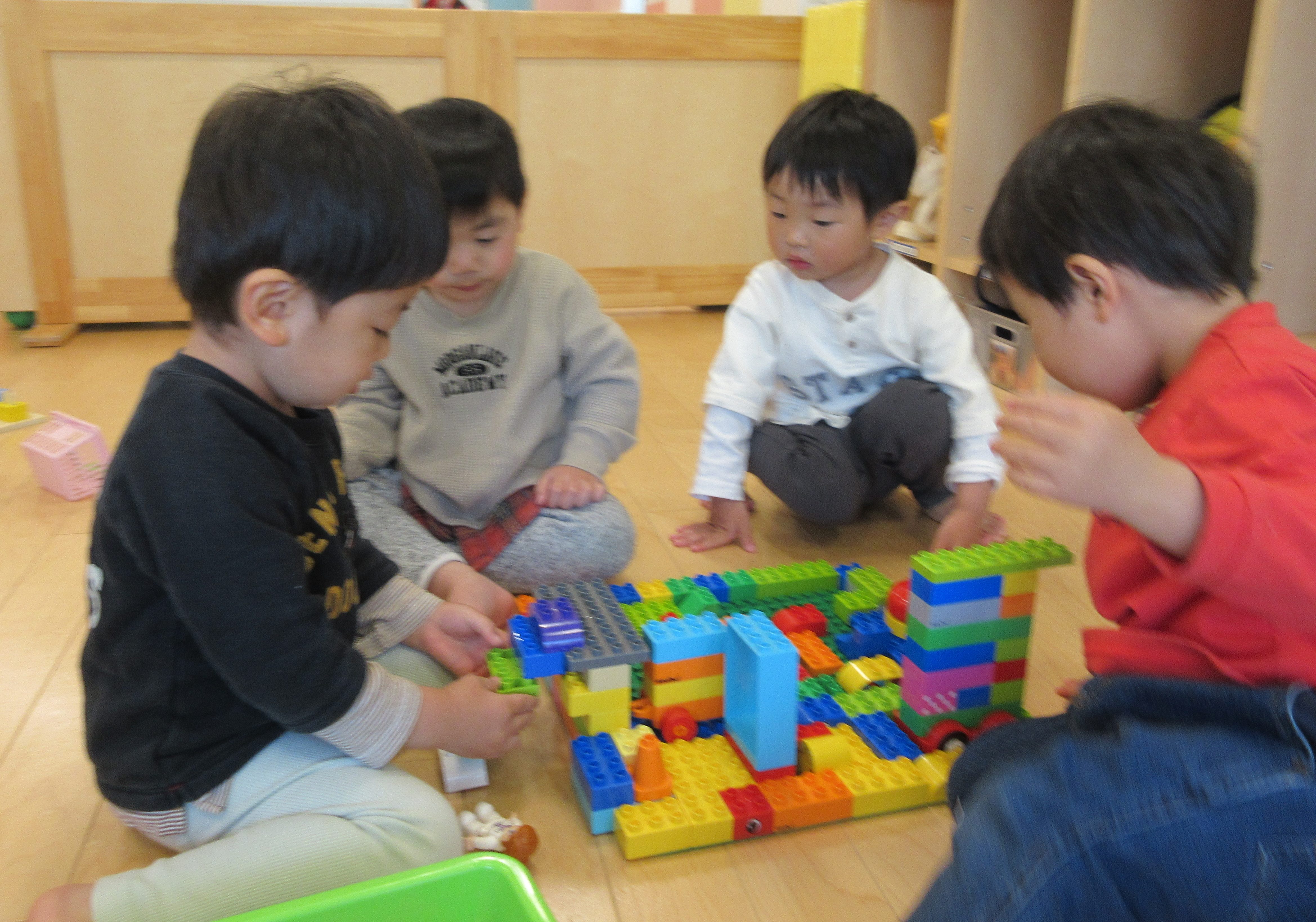ブロックを組み立てることが上手になってきたりんごぐみさんたち。想像して遊ぶ力もついてきているので、ごっこ遊びが盛り上がっています