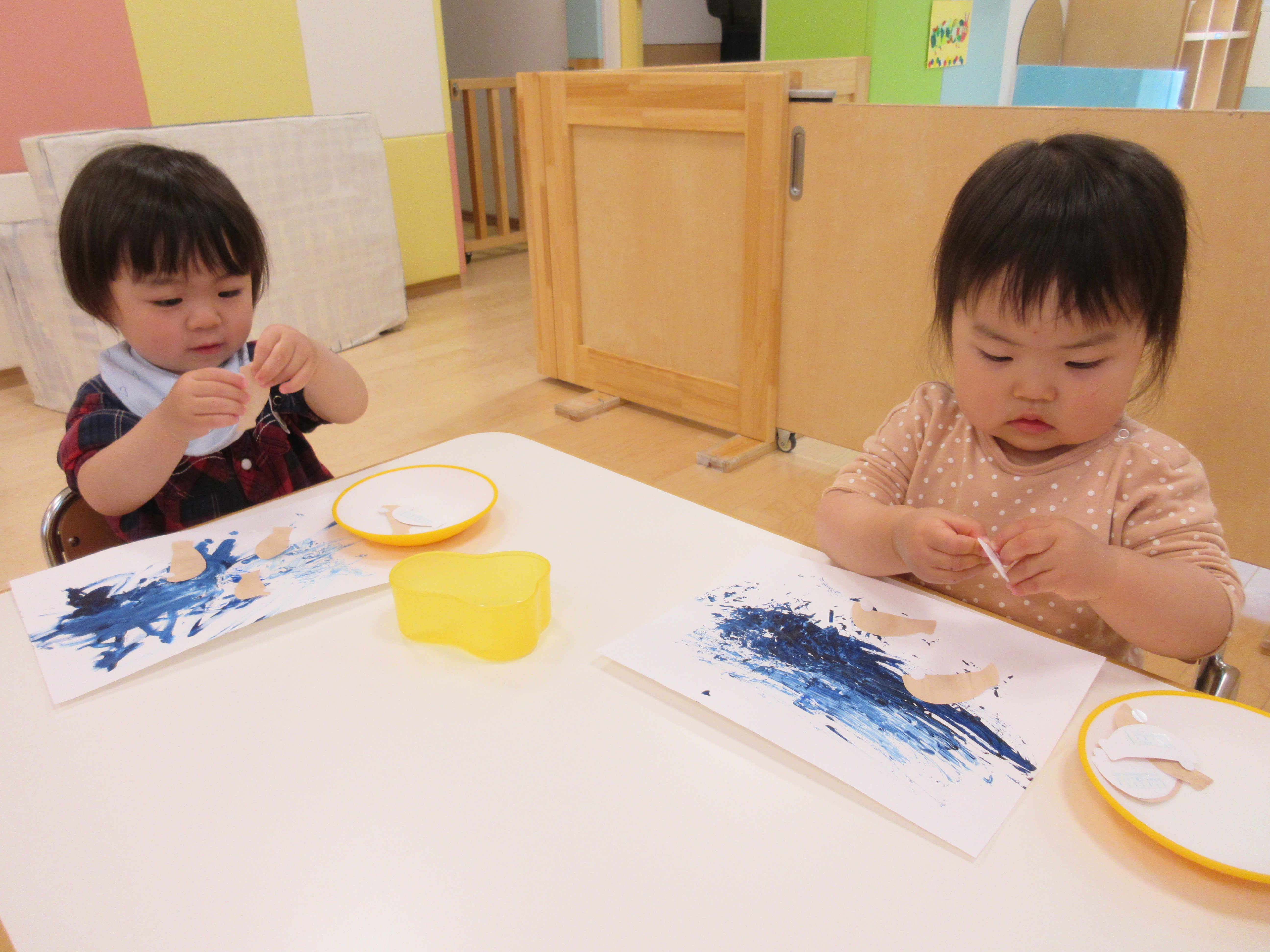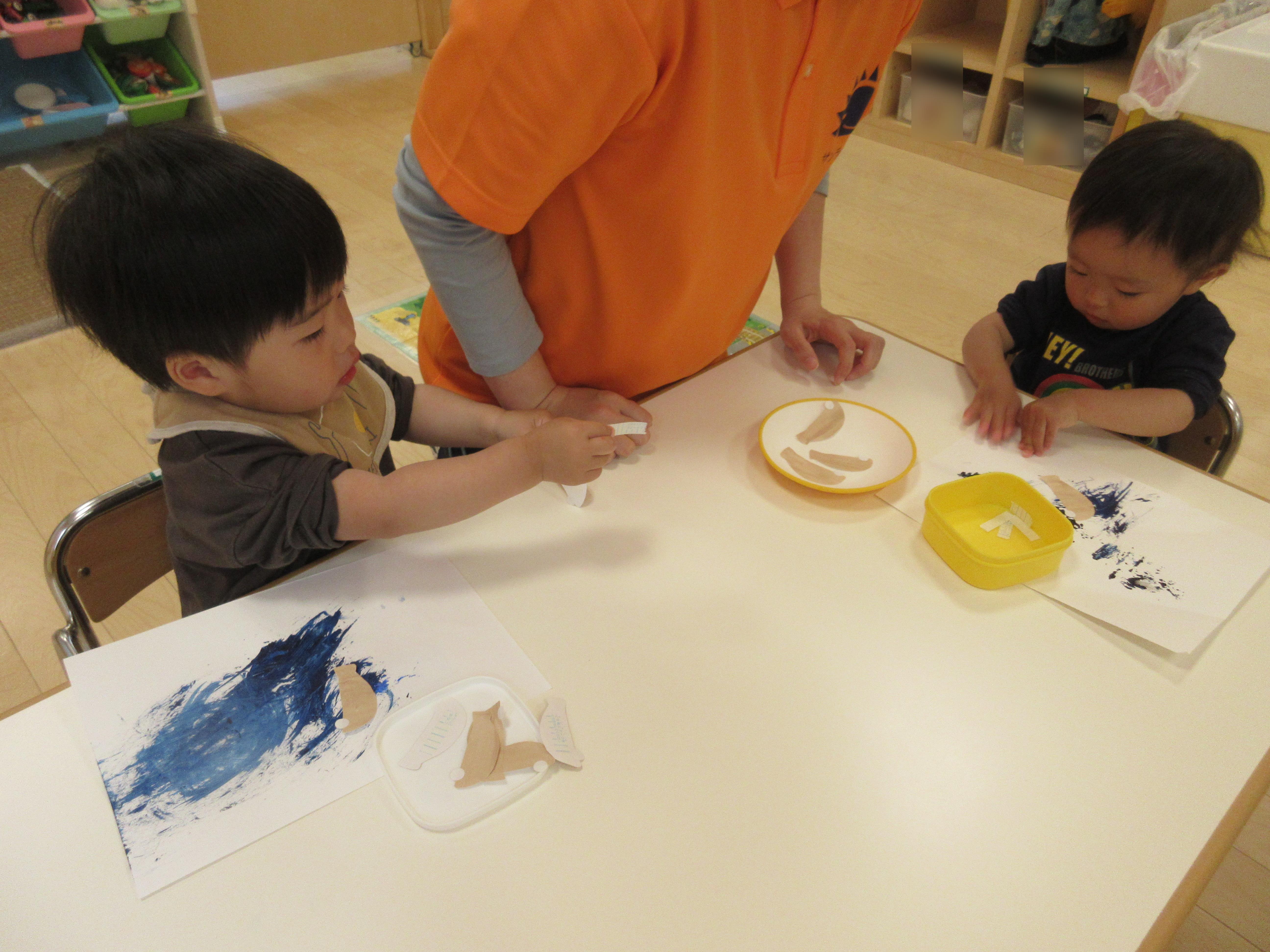 完成すると「じゃーん」と言いながら先生に見せてくれる子や作品を両手で大事に持って見つめる子など完成後もそれぞれ違った姿が見られました![]()