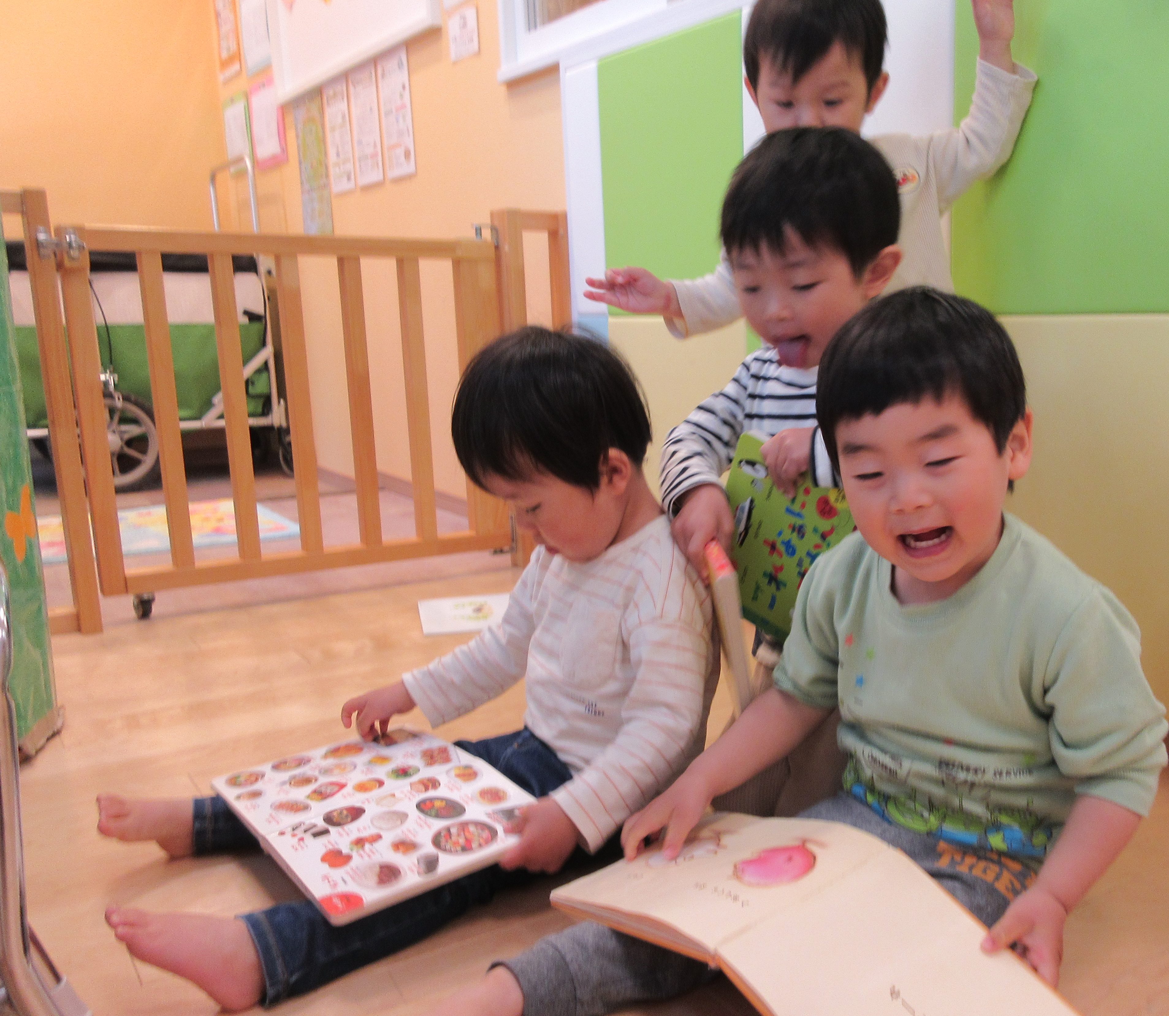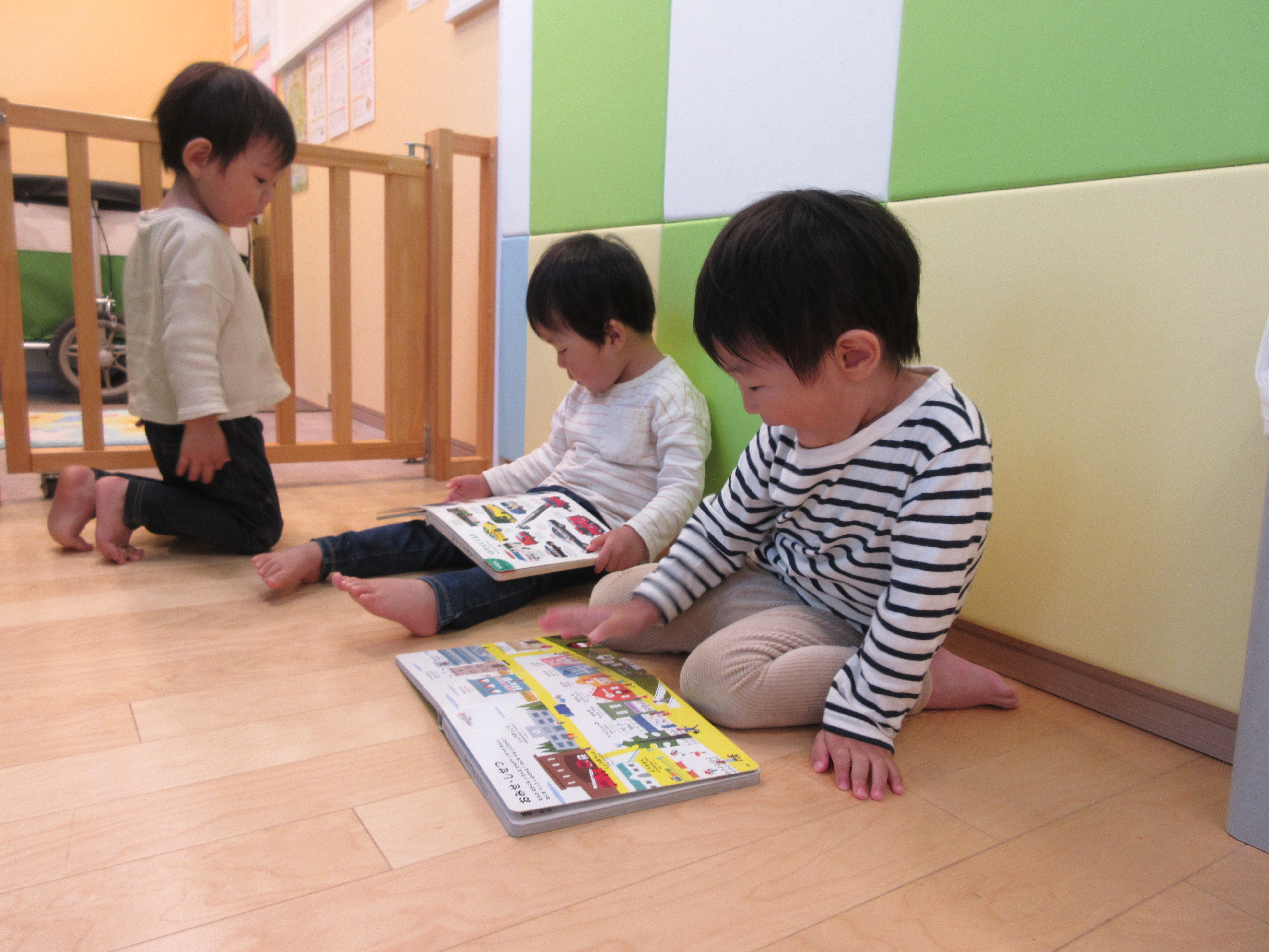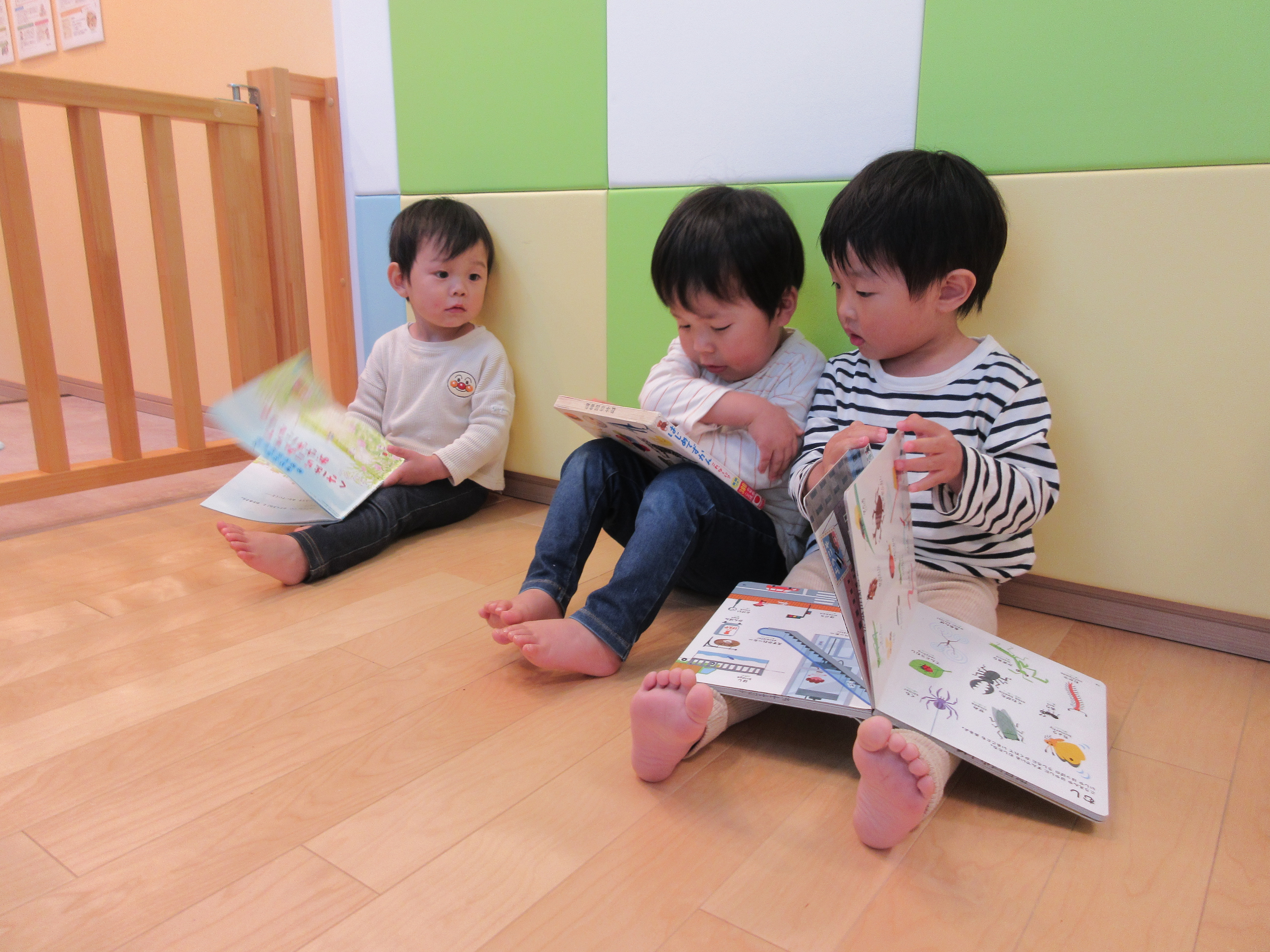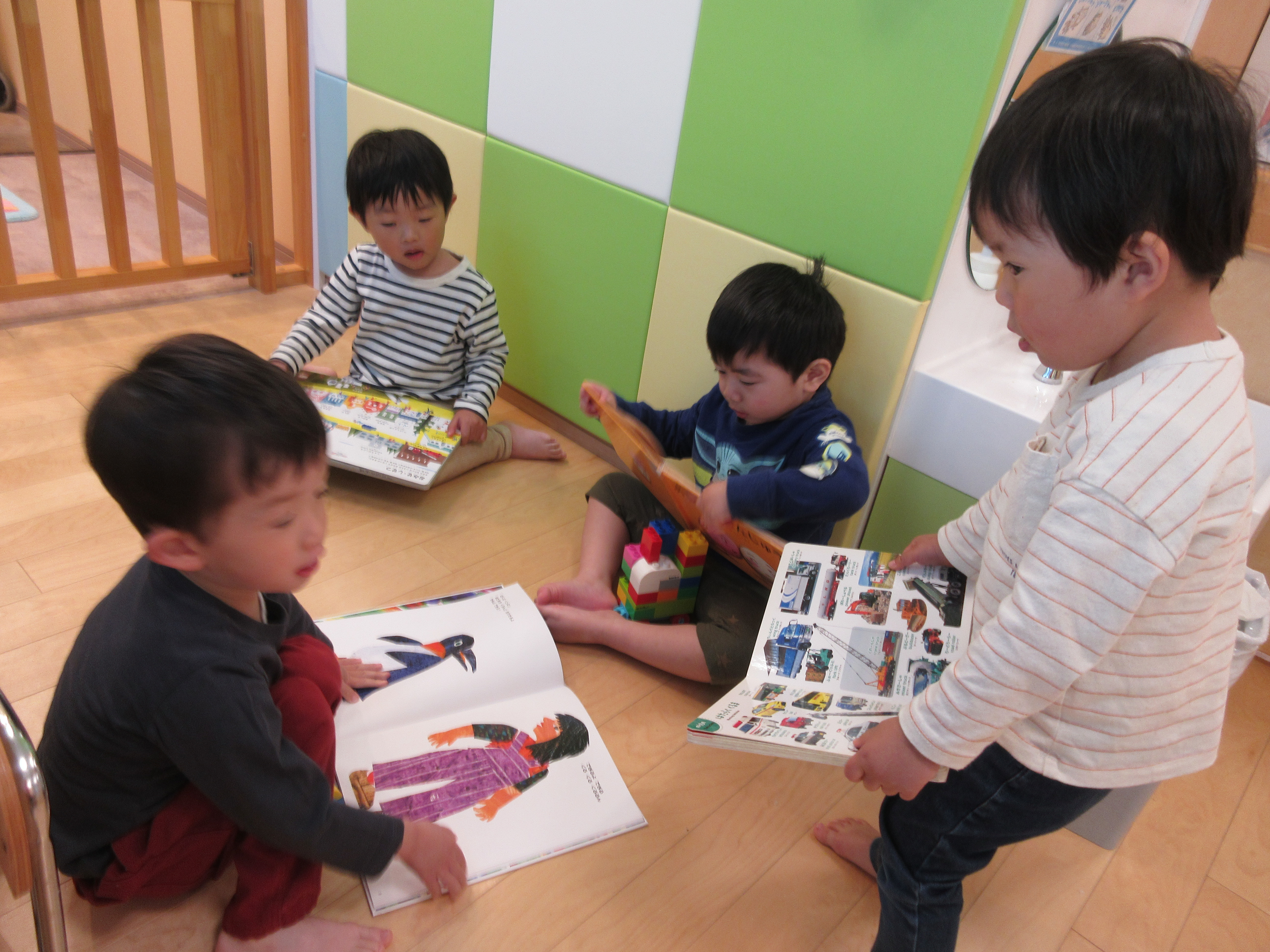 楽しそうに絵本を読むお友だちにつられて、他のりんごぐみのお友だちも絵本を持って次々に集まってきました![]()