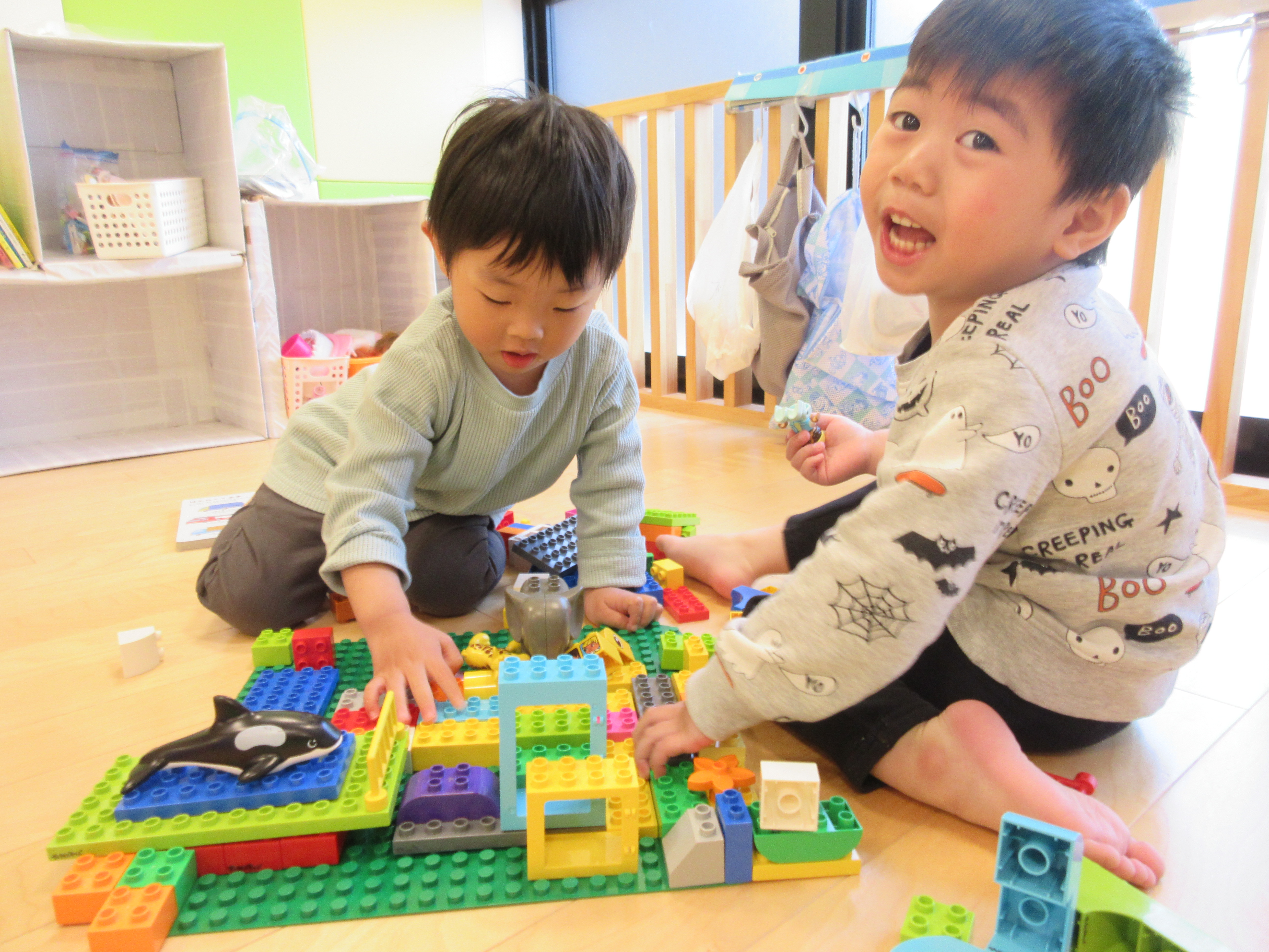 ⇧こちらは、二人で一生懸命作っていたものです。動物をブロックで囲んでみたり、台に乗せてみたり…動物園の様にも見えますね![]()