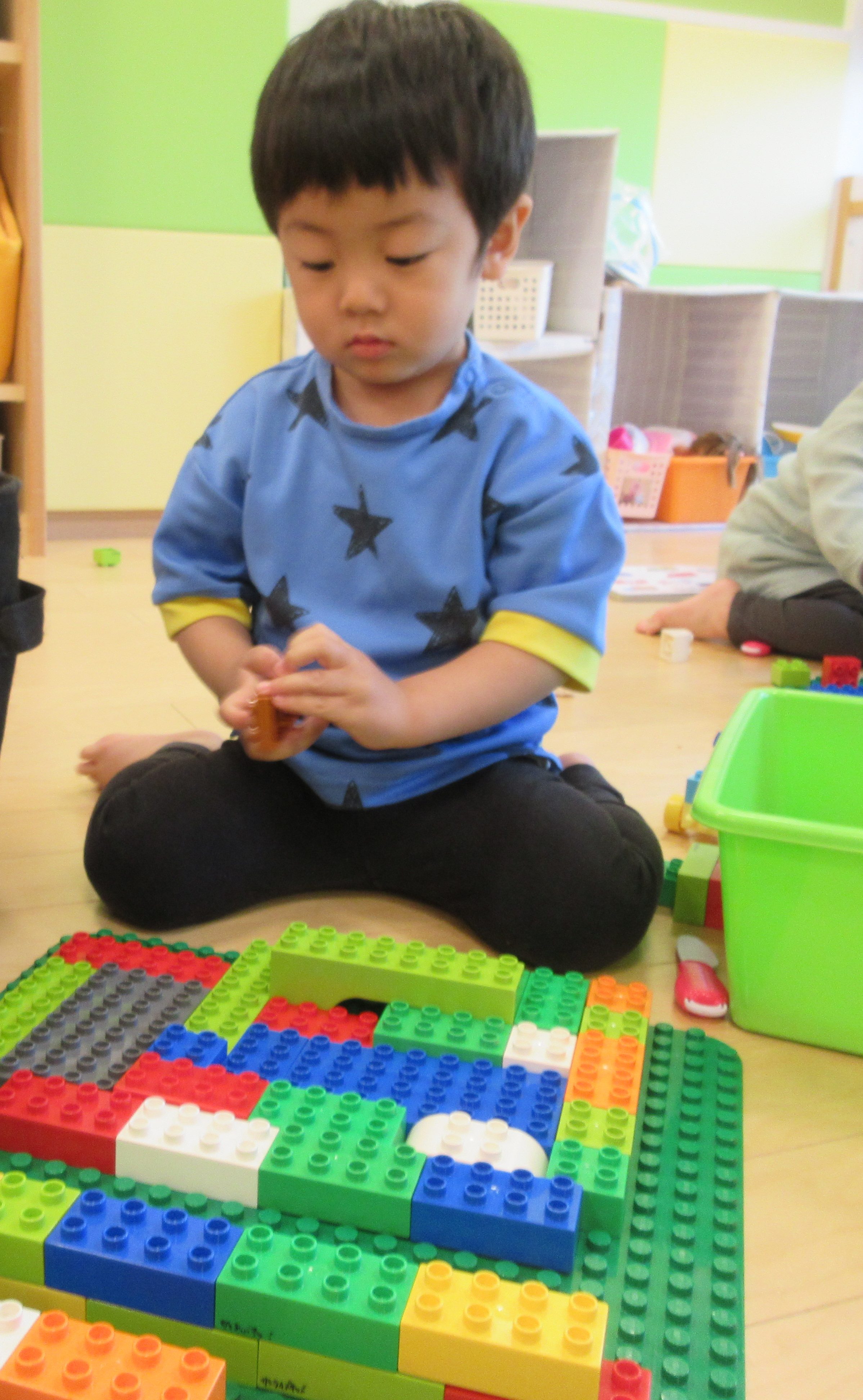 ⇧こちらは黙々とブロックを並べていた力作です。何を作っているのか聞いてみると「工事中だよ