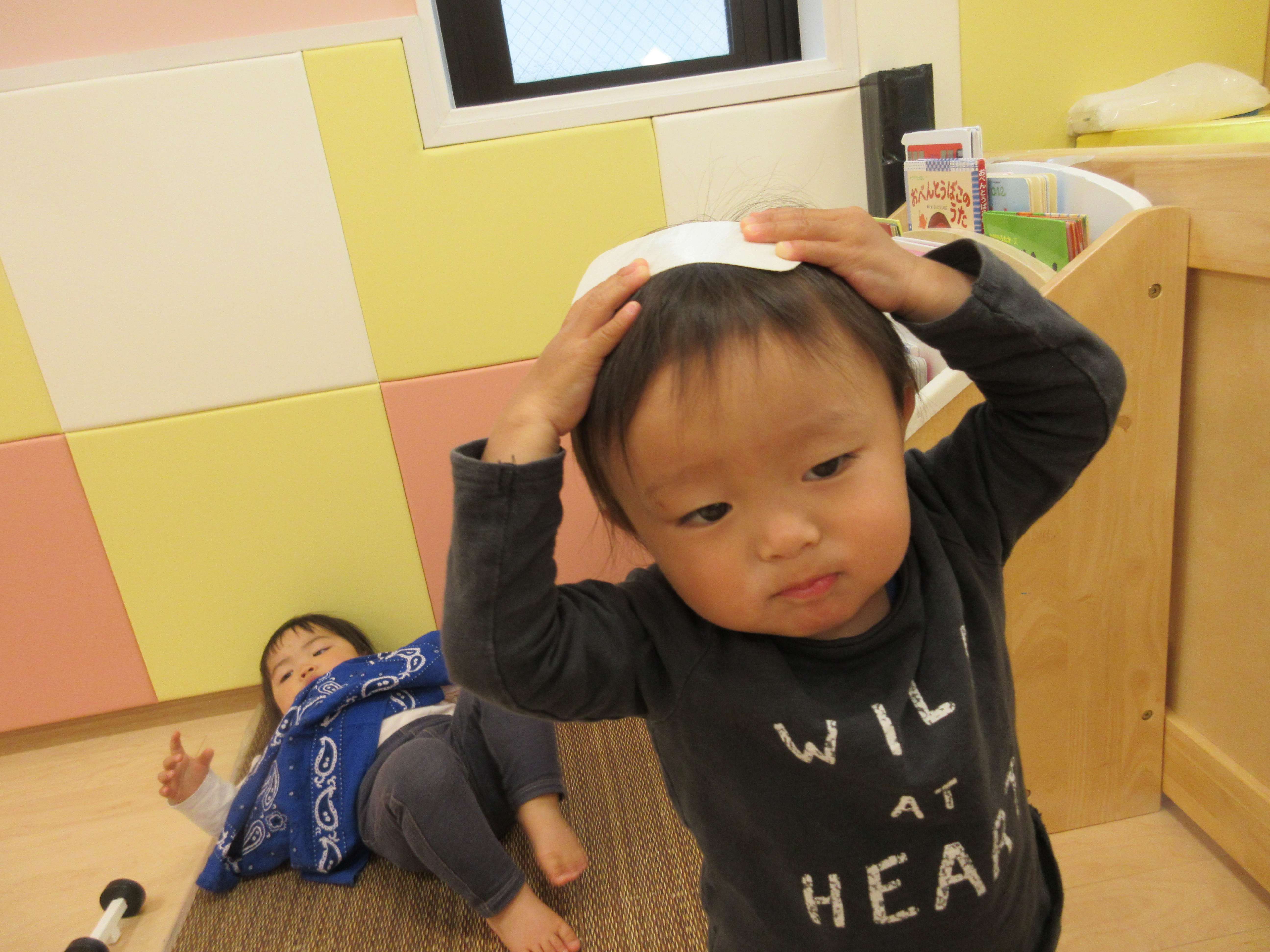 熱冷ましのシートのおもちゃを頭や首にペタペタ![]()