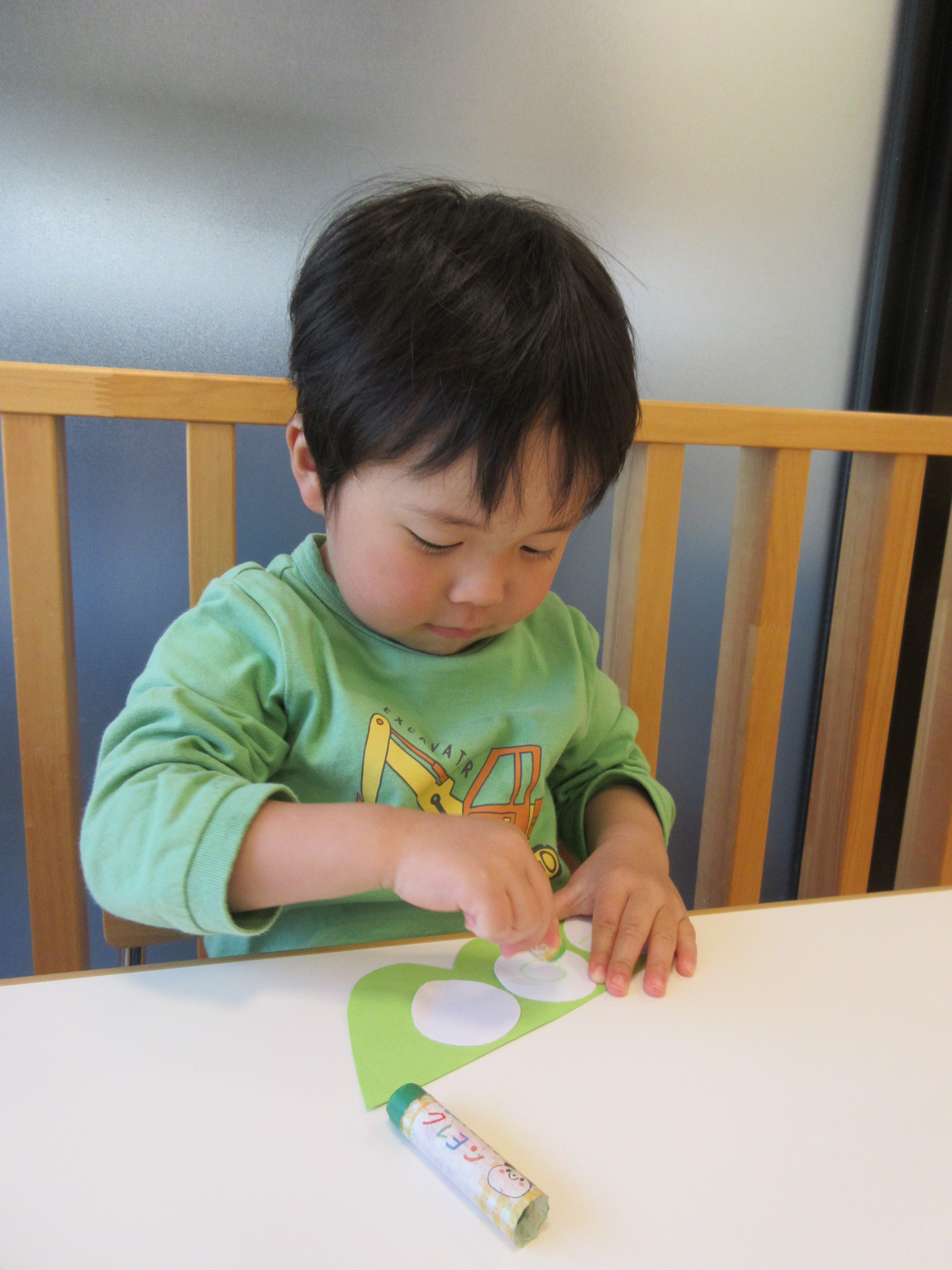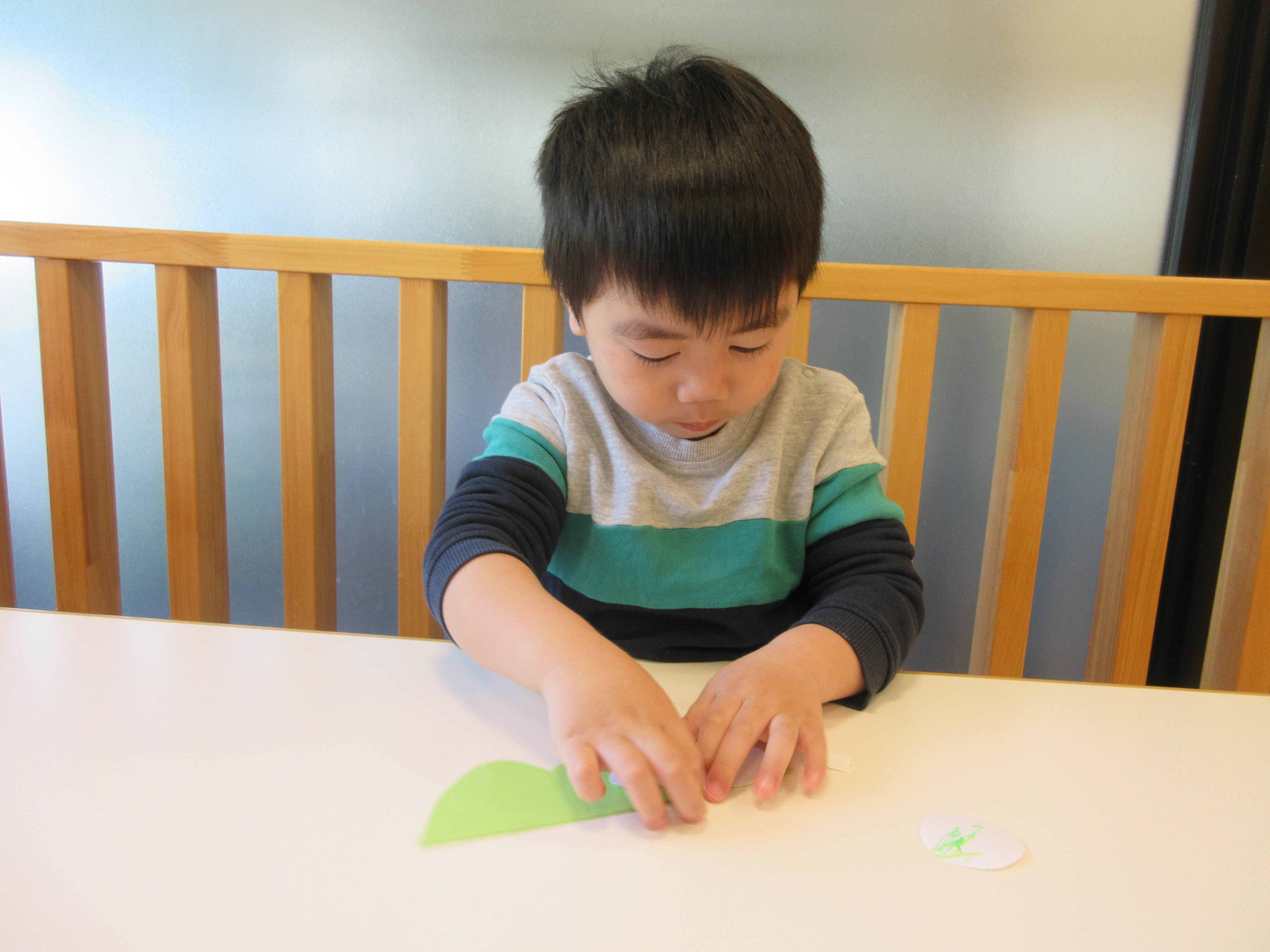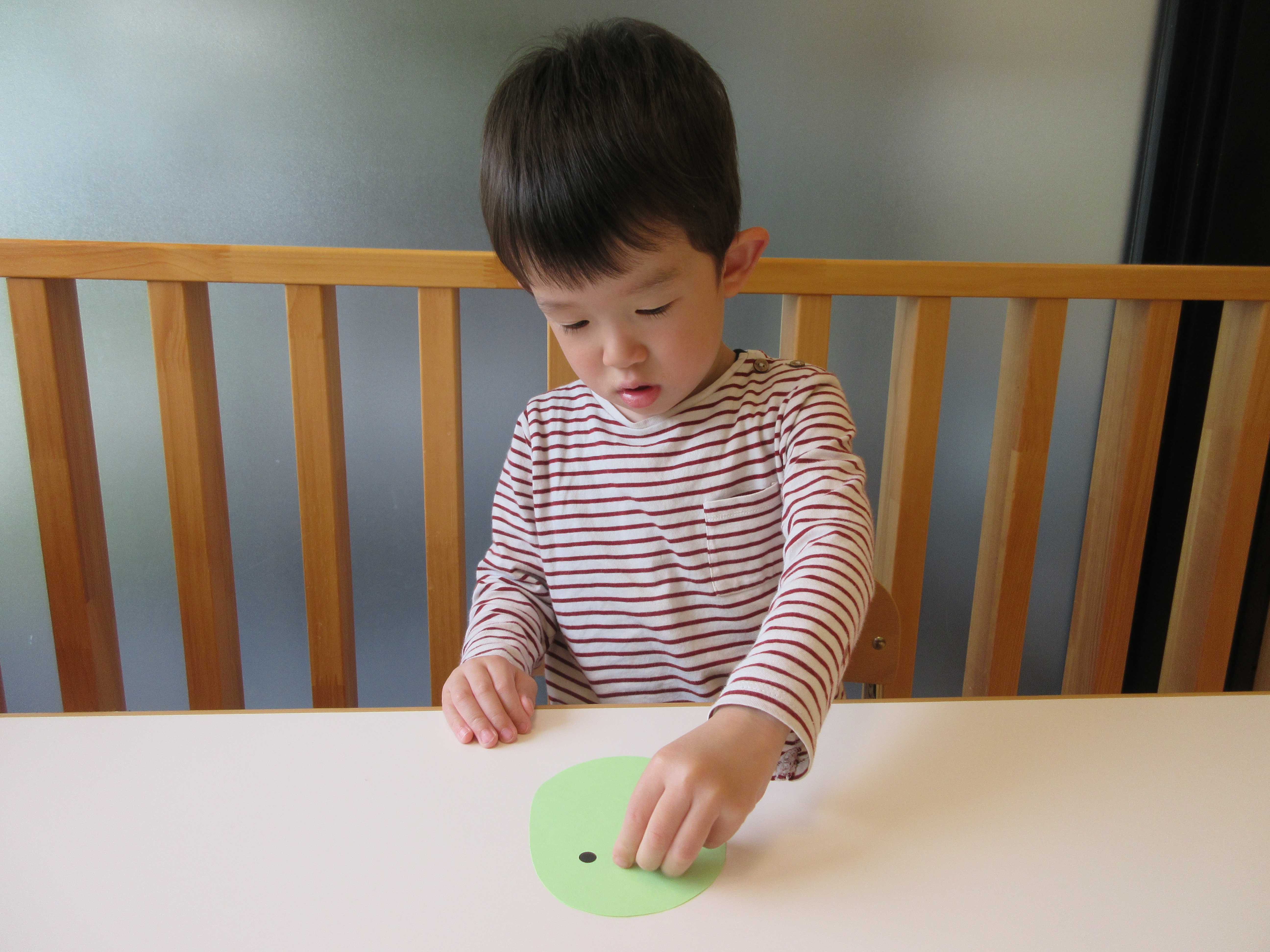 そら豆は、まず丸シールを使って目、口を貼ってもらいました。