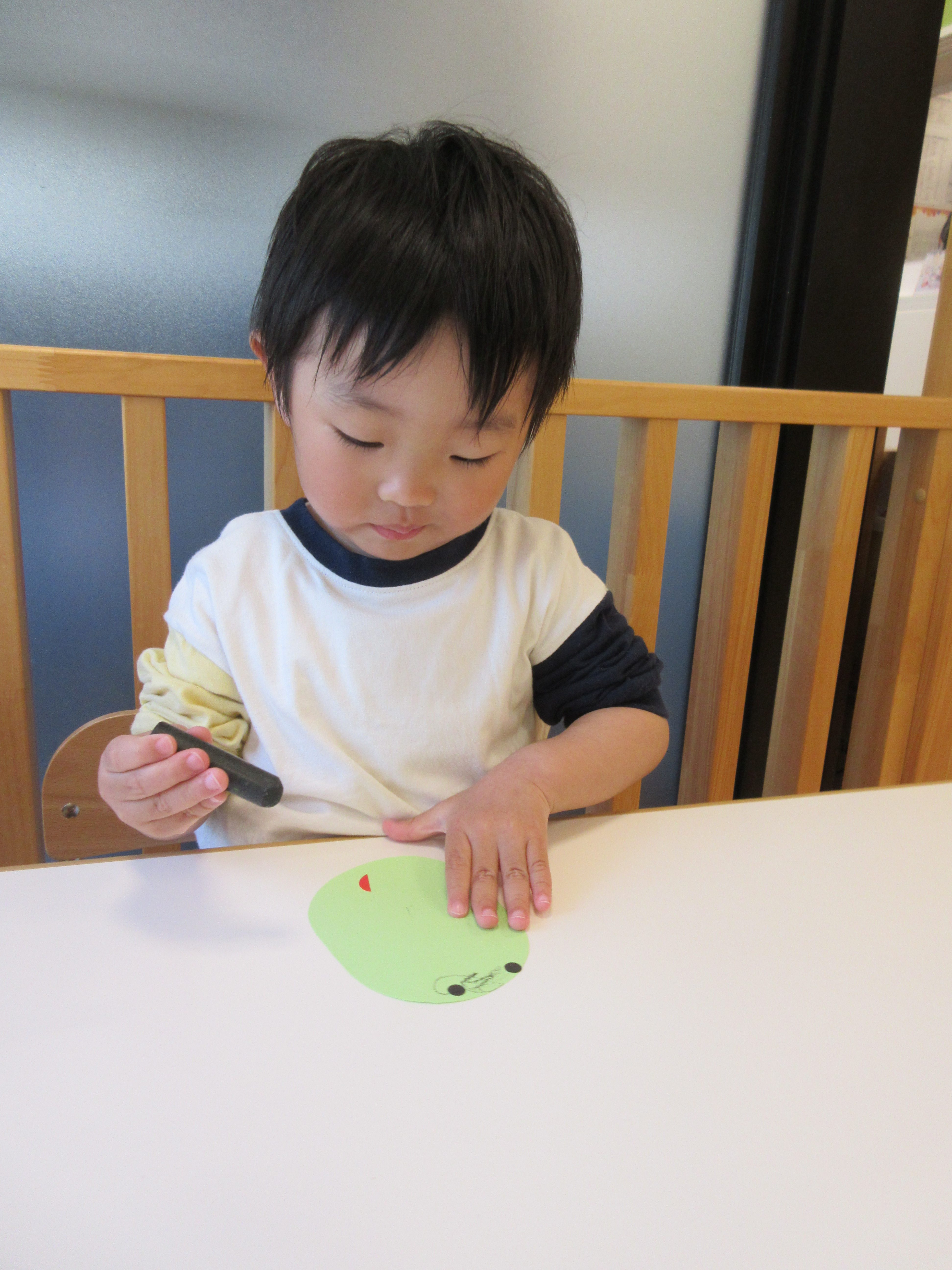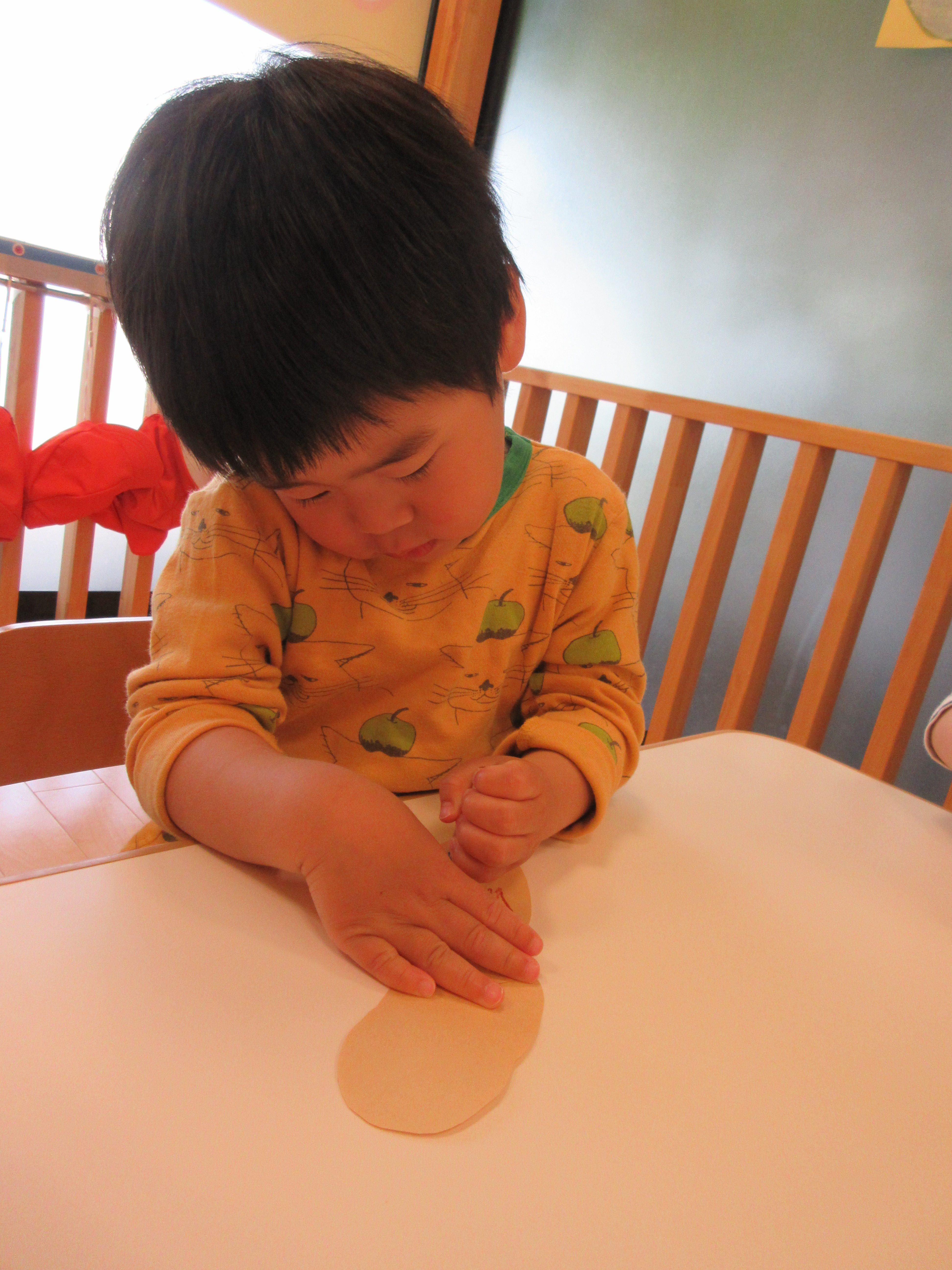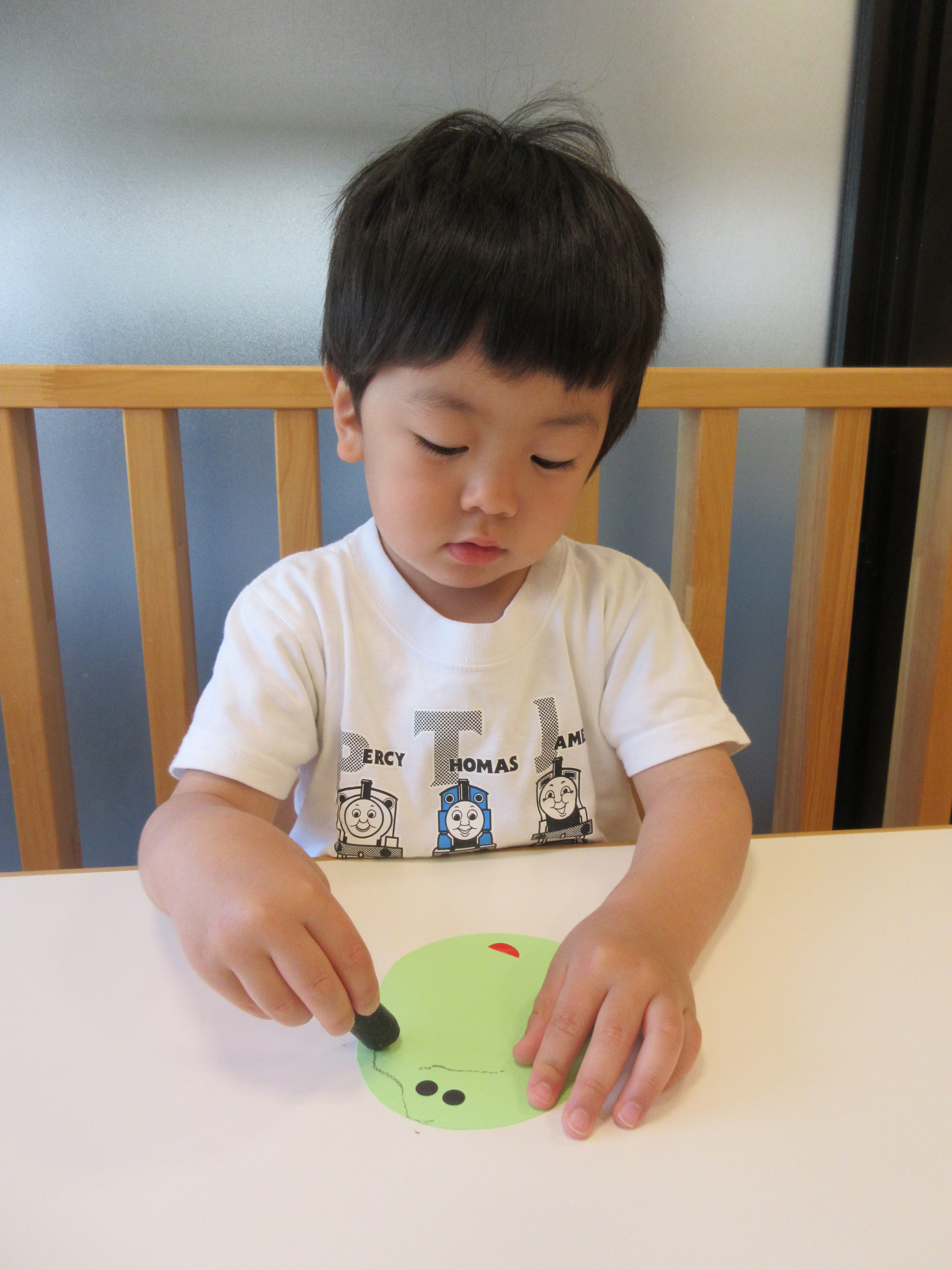 落花生は縦の線を描くということを子どもたちに説明をし、作ってもらいました。まっすぐな線を描くということはまだ難しいですが、子どもたちなりに考え、描いている姿を見て成長を感じる一面でした。