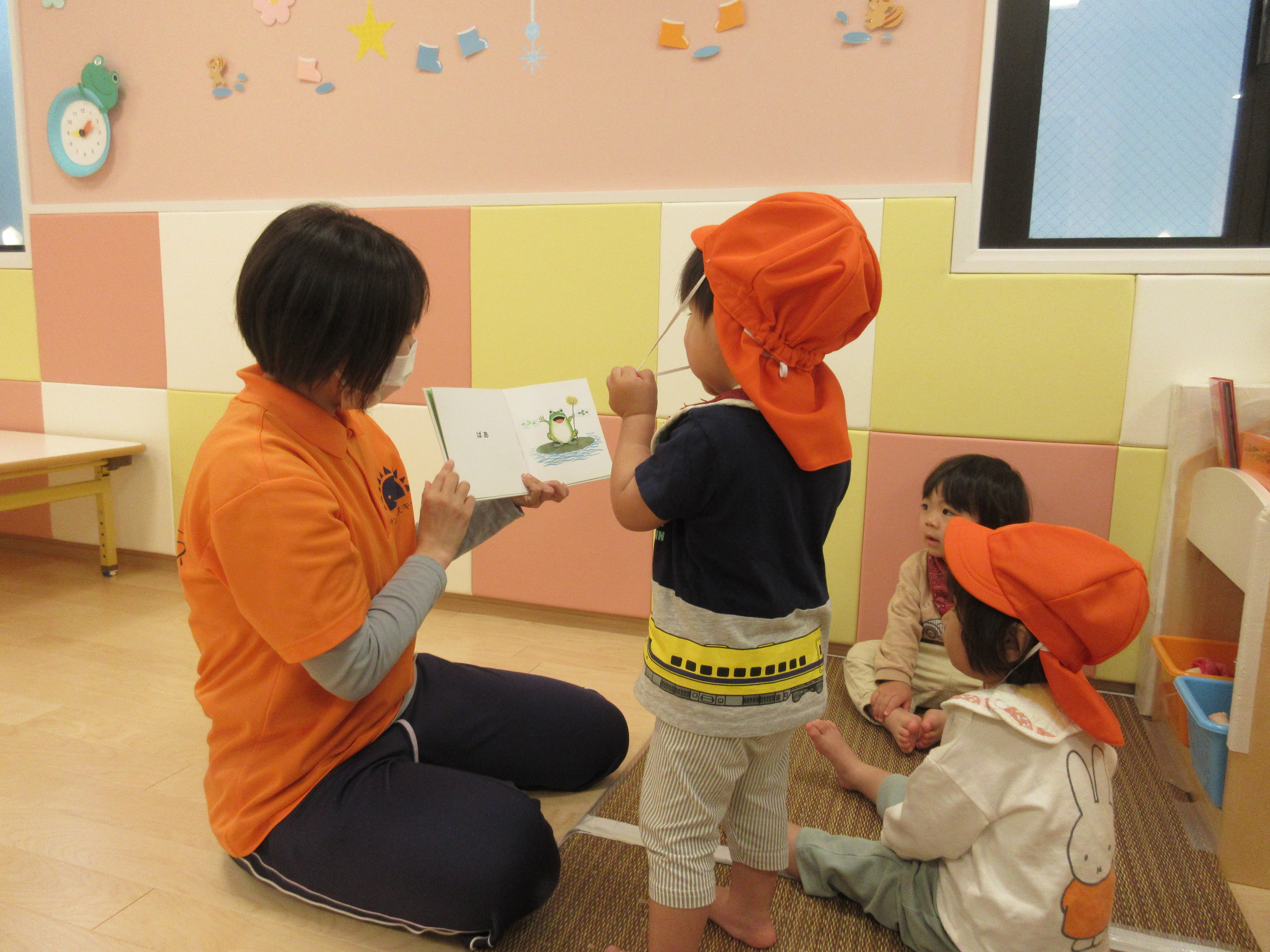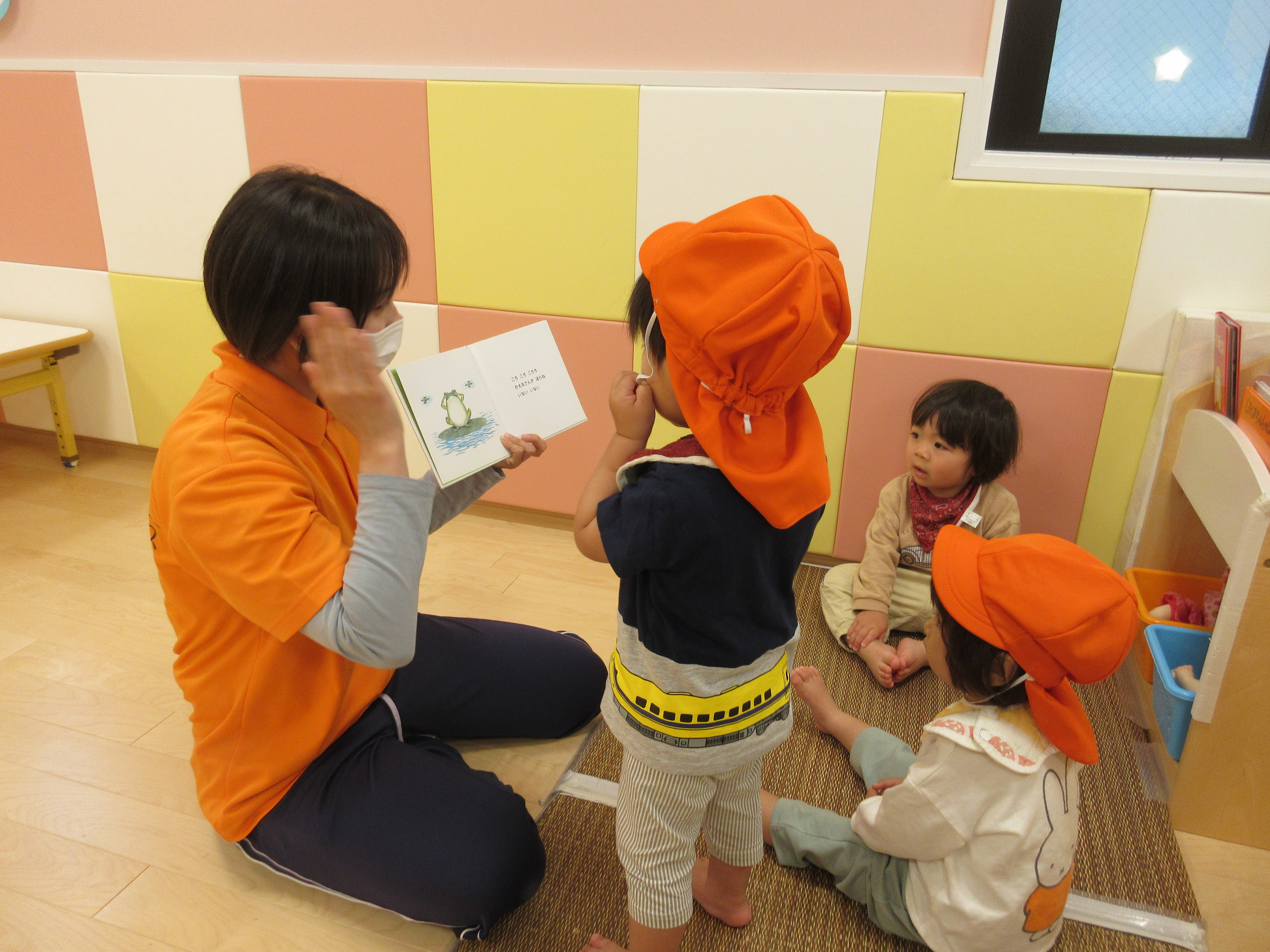 顔をだしたカエルさんをじっと見ていた子どもたち![]()